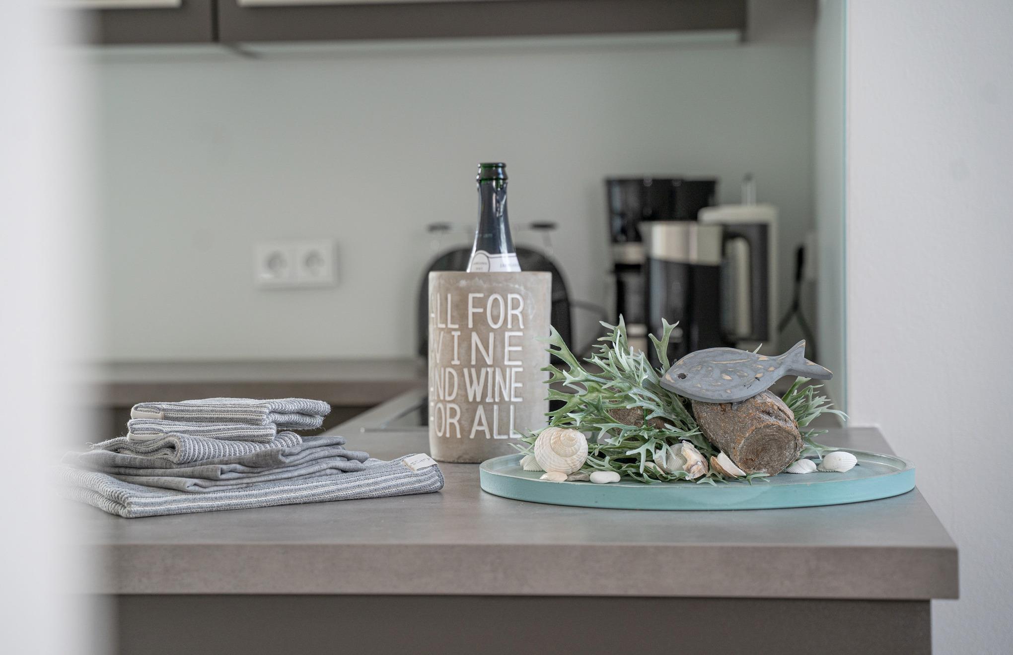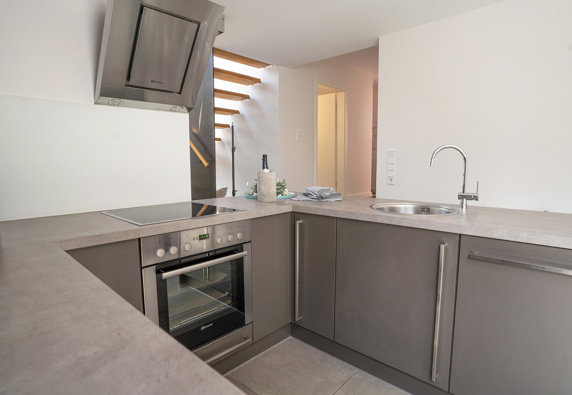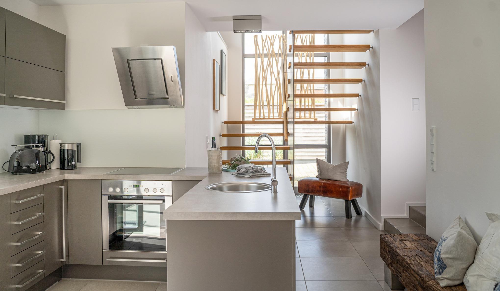 Die offene Küche lädt zum entspannten Kochen ein. Sie ist ausgestattet mit einem Heißluftherd mit Cerankochfeld, Kühlschrank mit Gefrierfach, Geschirrspüler und viel Schrankplatz. Die Küchenausstattung ist hochwertig und mit Designartikeln wie z.B. der Geschirrlinie SOLID COLOR aus dem Hause DIBBERN, Küchenhelfern von MENU, ASA, WMF, LINUM etc., um nur einige zu nennen, ausgestattet. Von der Küche aus gelangt man in den kleinen Innenhof in Südlage.