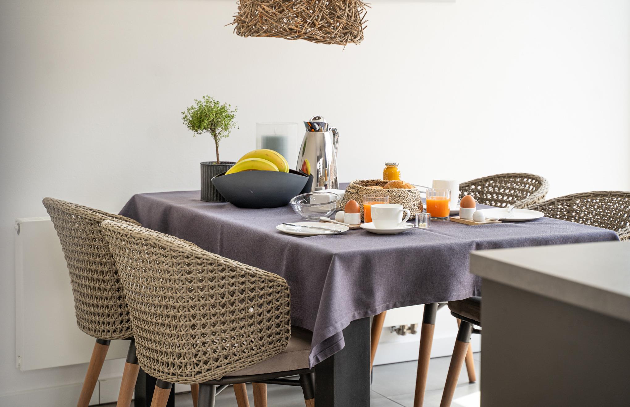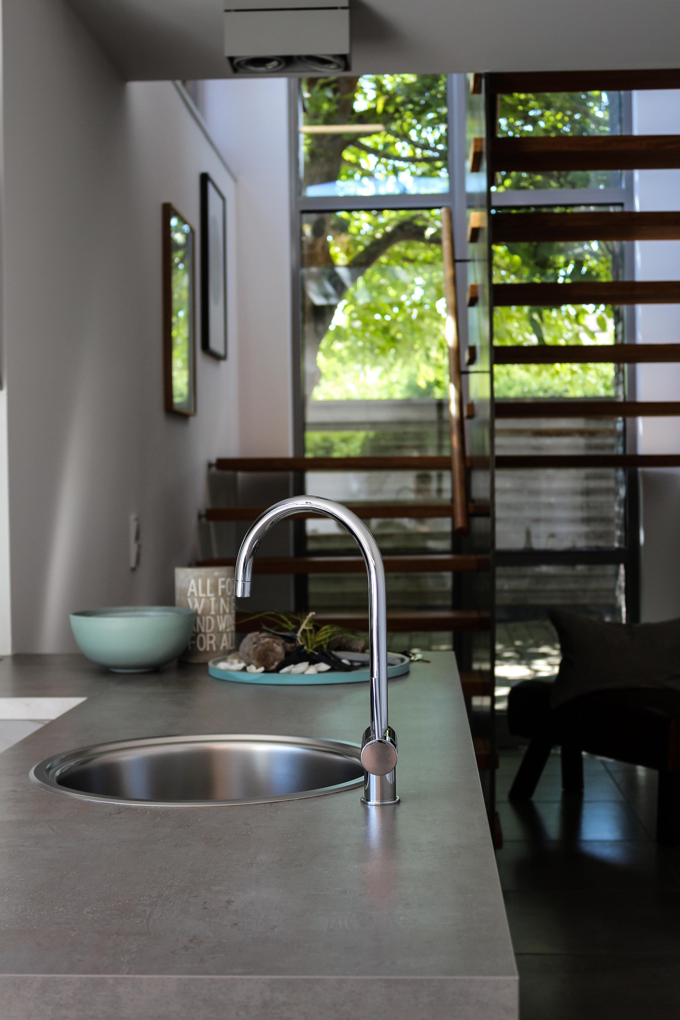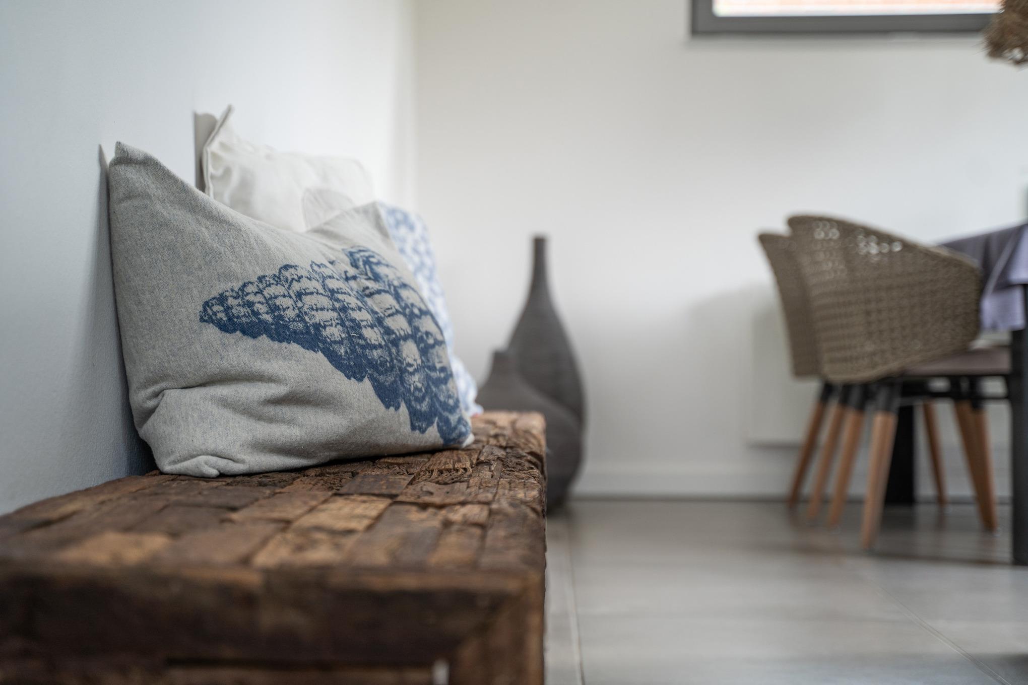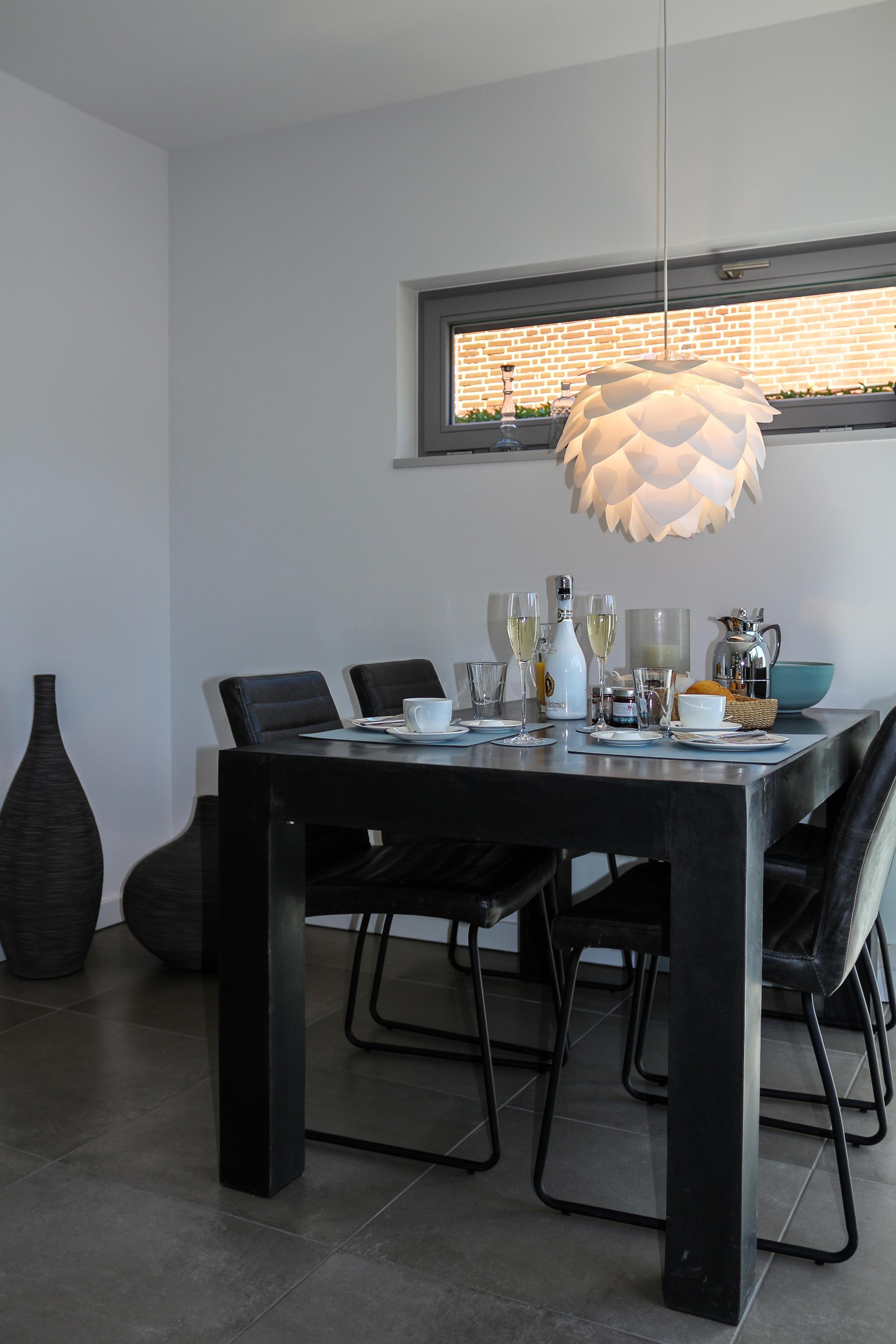 Die offene Küche lädt zum entspannten Kochen ein. Sie ist ausgestattet mit einem Heißluftherd mit Cerankochfeld, Kühlschrank mit Gefrierfach, Geschirrspüler und viel Schrankplatz. Die Küchenausstattung ist hochwertig und mit Designartikeln wie z.B. der Geschirrlinie SOLID COLOR aus dem Hause DIBBERN, Küchenhelfern von MENU, ASA, WMF, LINUM etc., um nur einige zu nennen, ausgestattet. Von der Küche aus gelangt man in den kleinen Innenhof in Südlage.