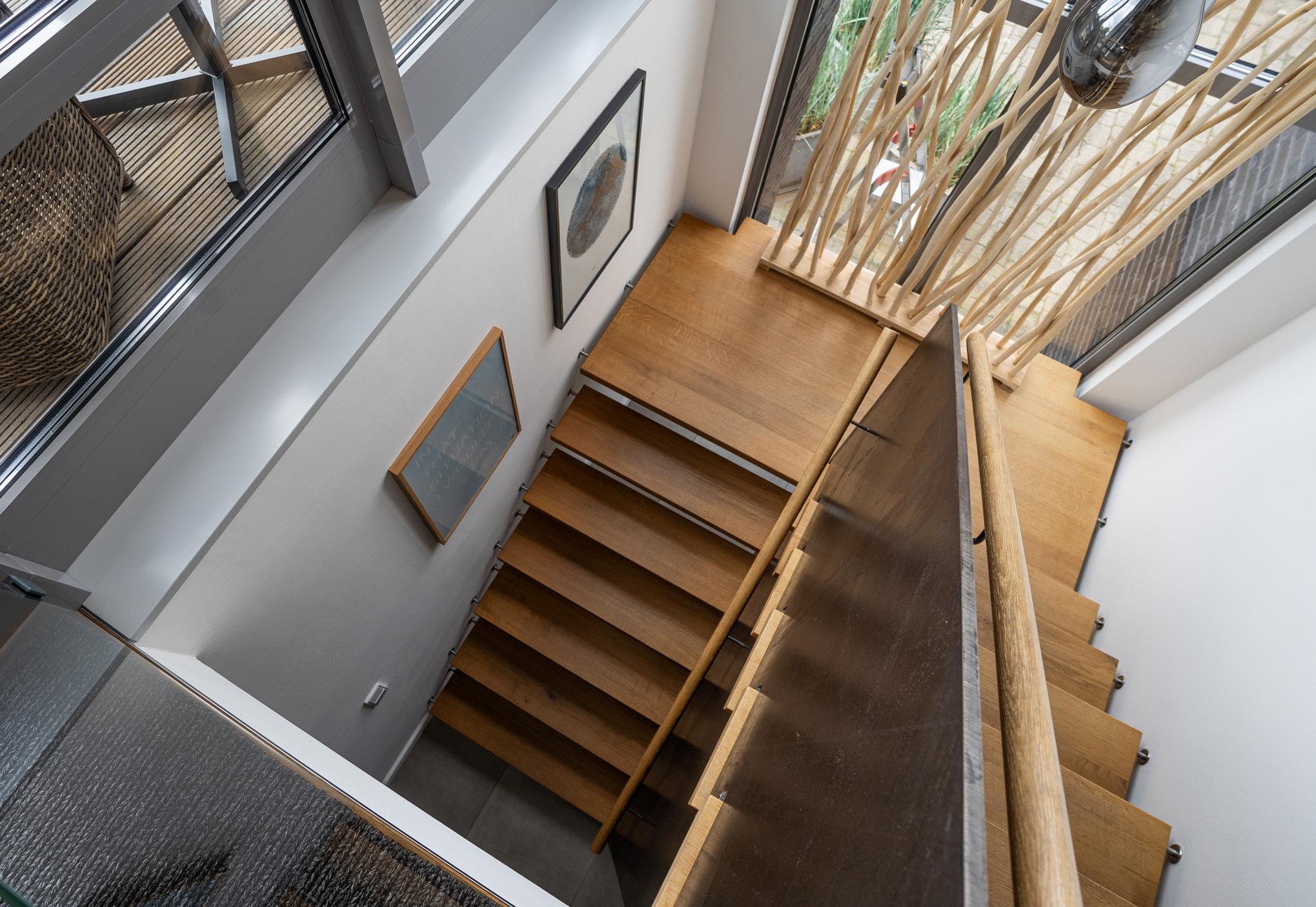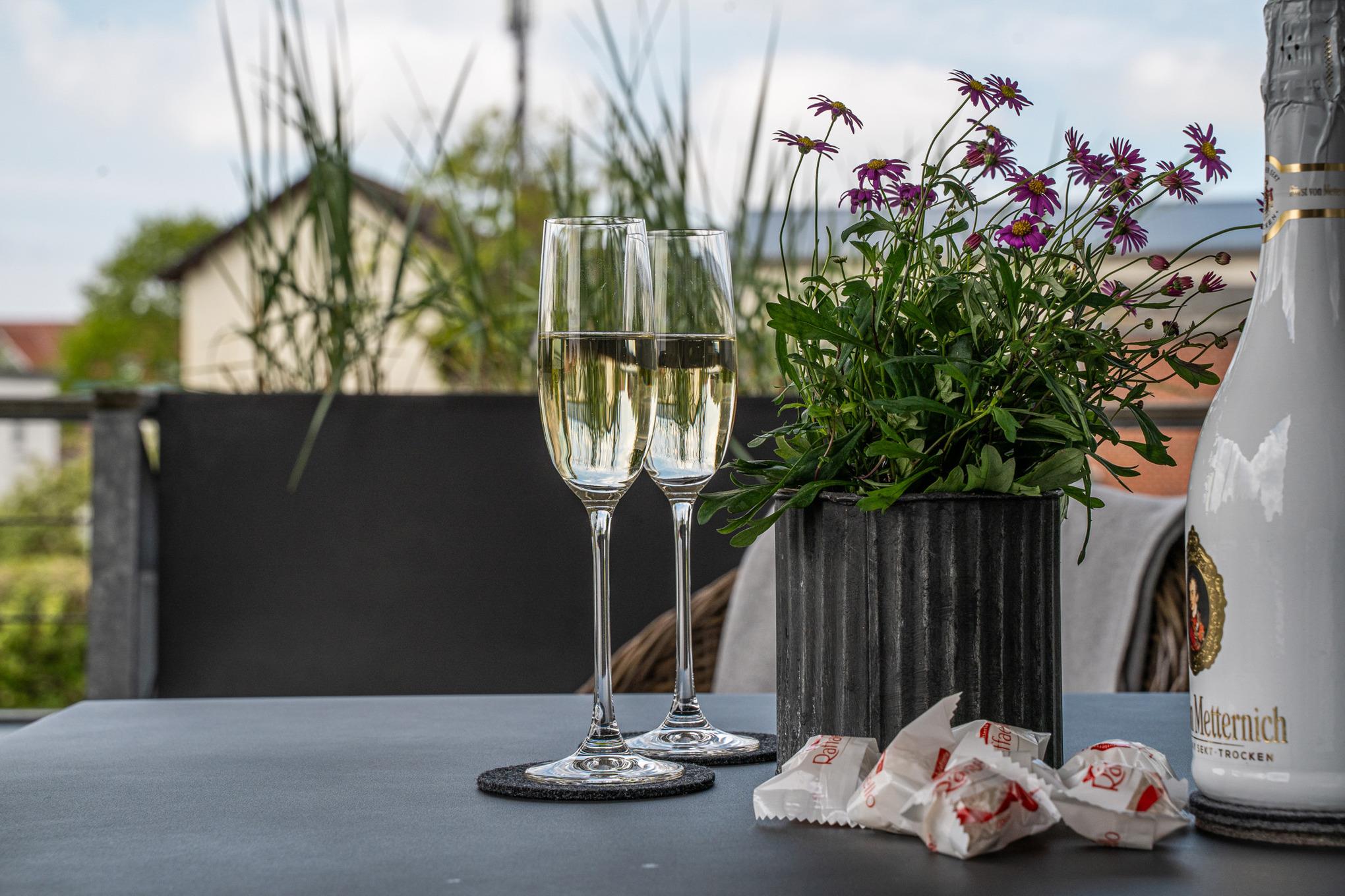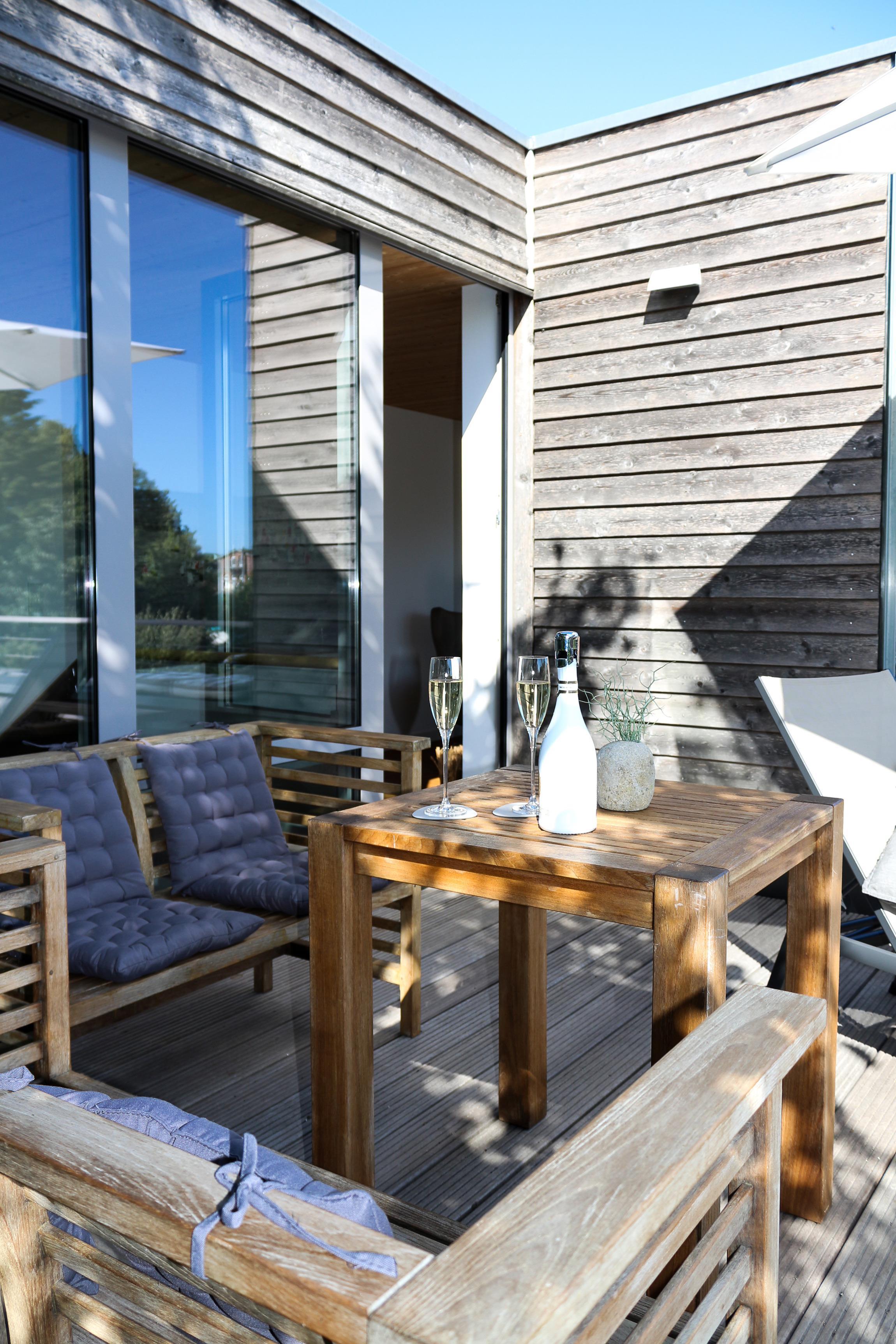 Vom Wohnzimmer im Obergeschoß gelangt man auf die ca. 16m² große Dachterrasse in Südlage, die schon morgens zu einem Frühstück einlädt und nach einem anstrengenden Tag am Meer den richtigen Rahmen für einen Sun-Downer bietet.