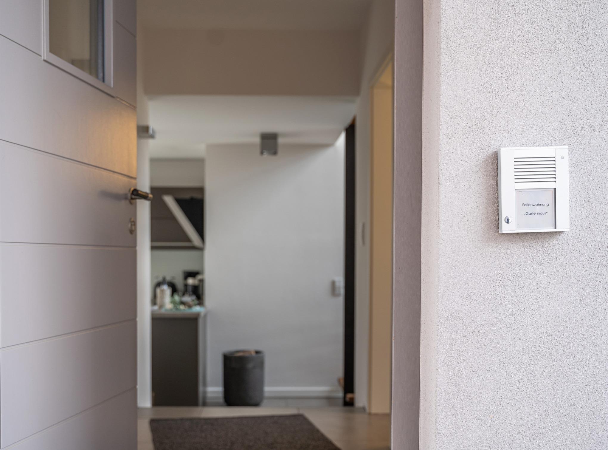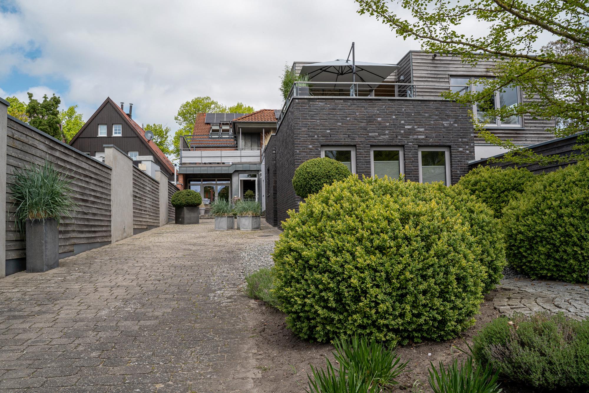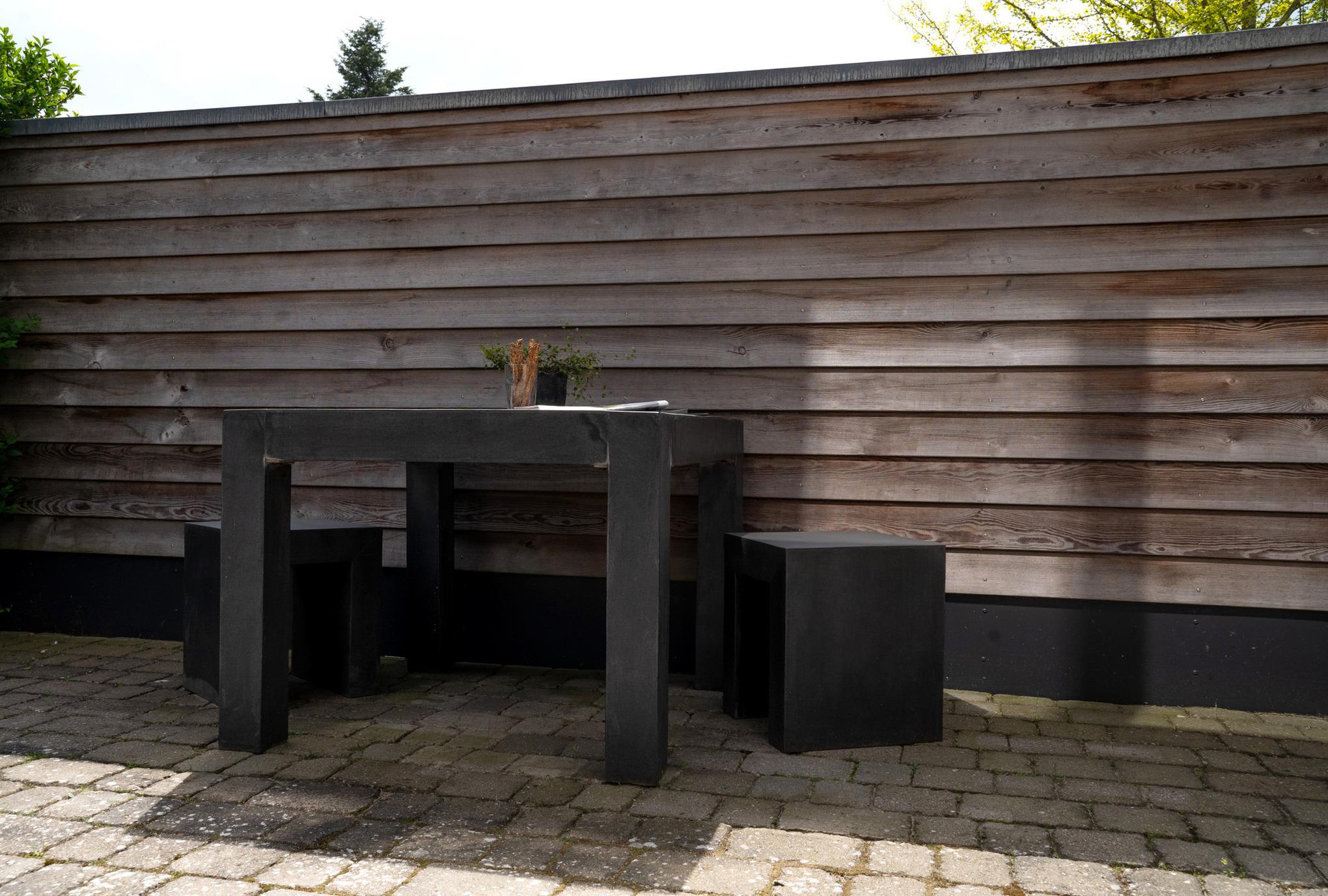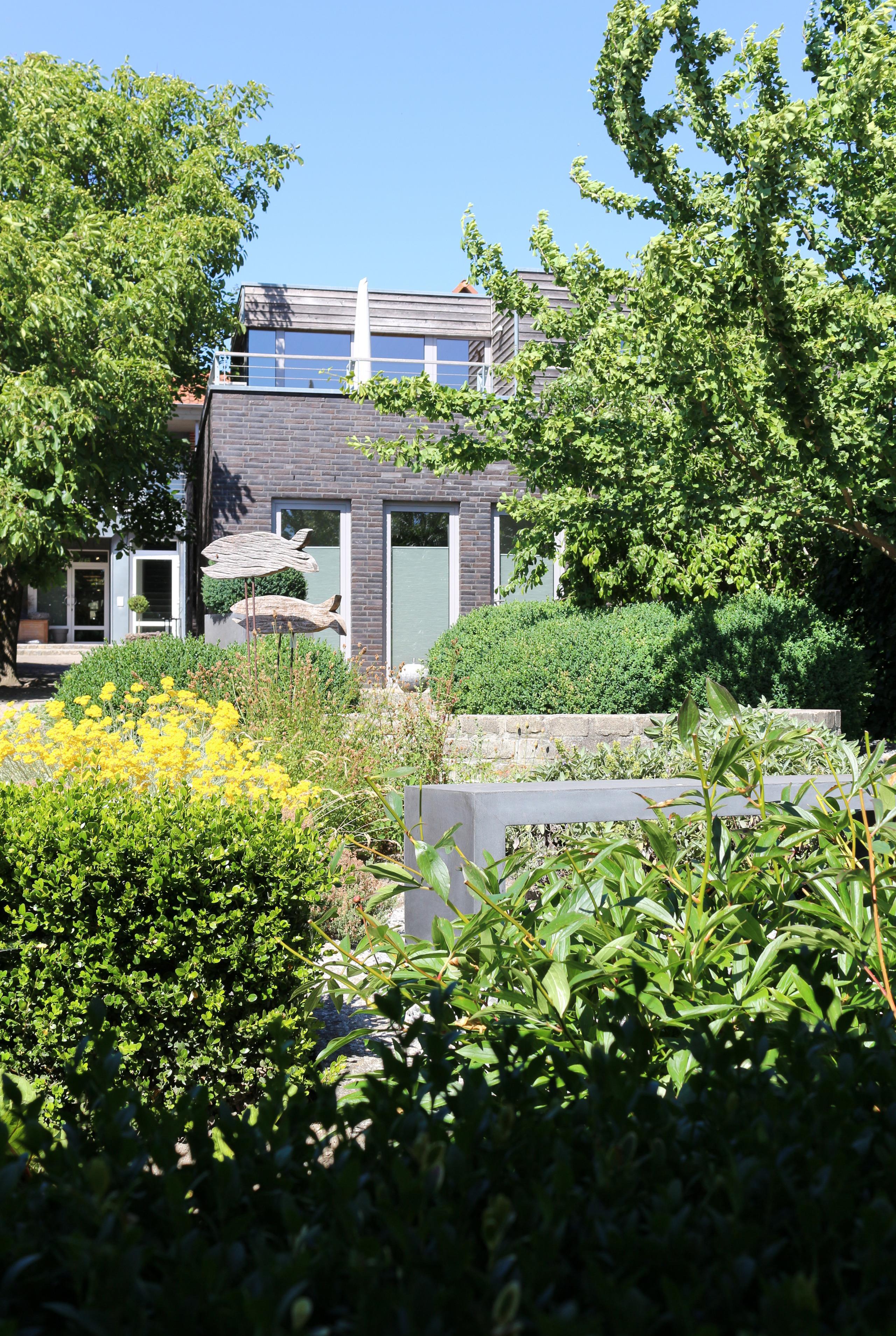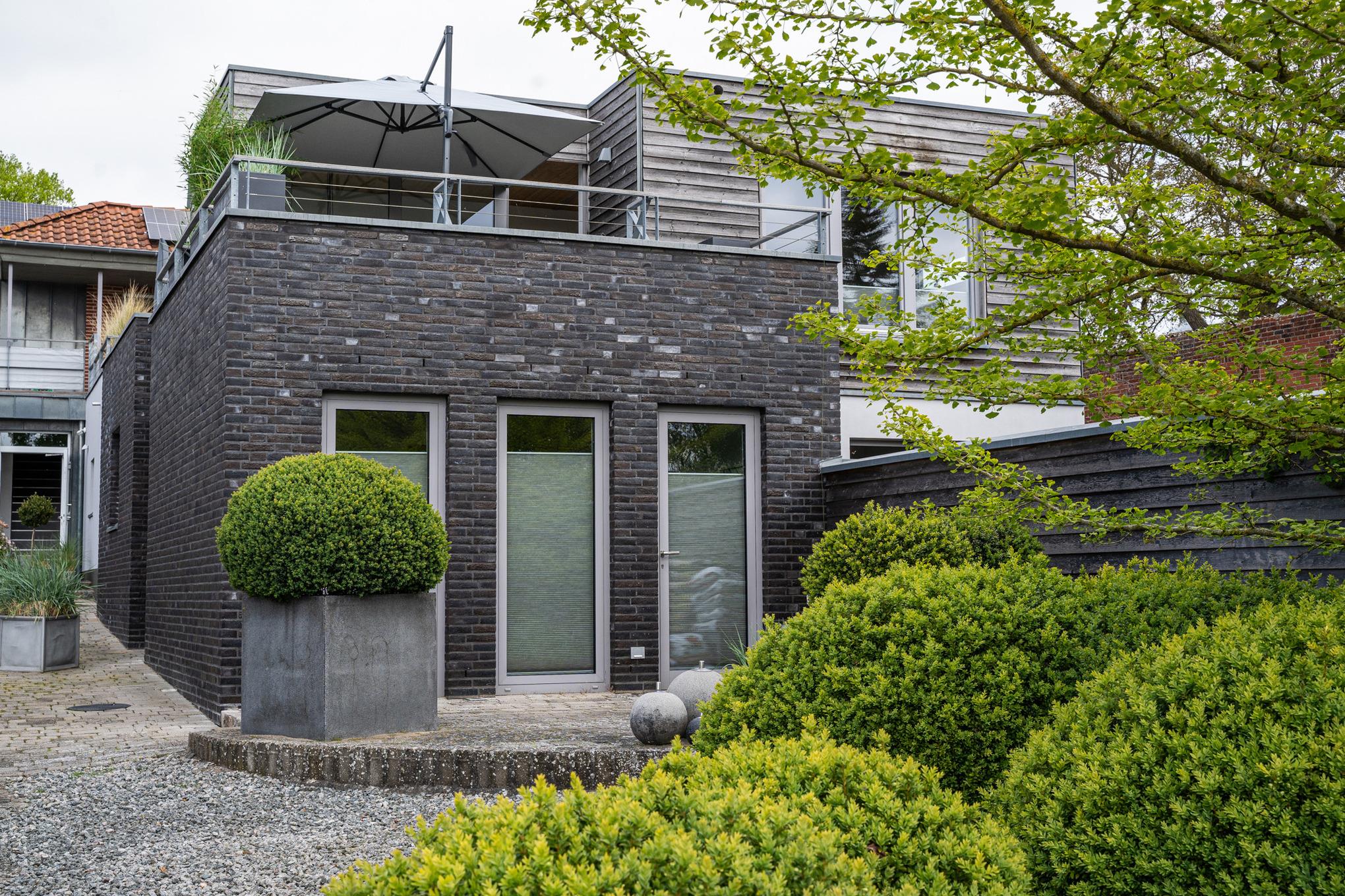 Das Gartenhaus besteht aus drei Kuben in drei Ebenen. In Kubus 1 und 2 befindet sich die Ferienwohnung, in Kubus 3 eine Sauna mit eigenem Zugang und Gartenblick; darüber die Dachterrrasse des Gartenhauses.
