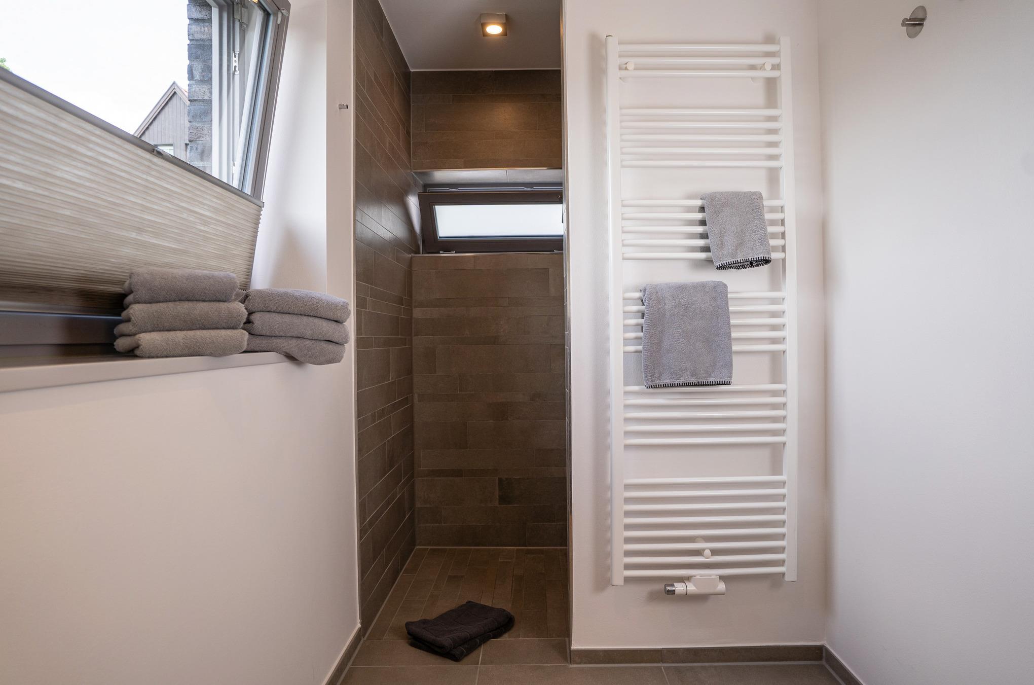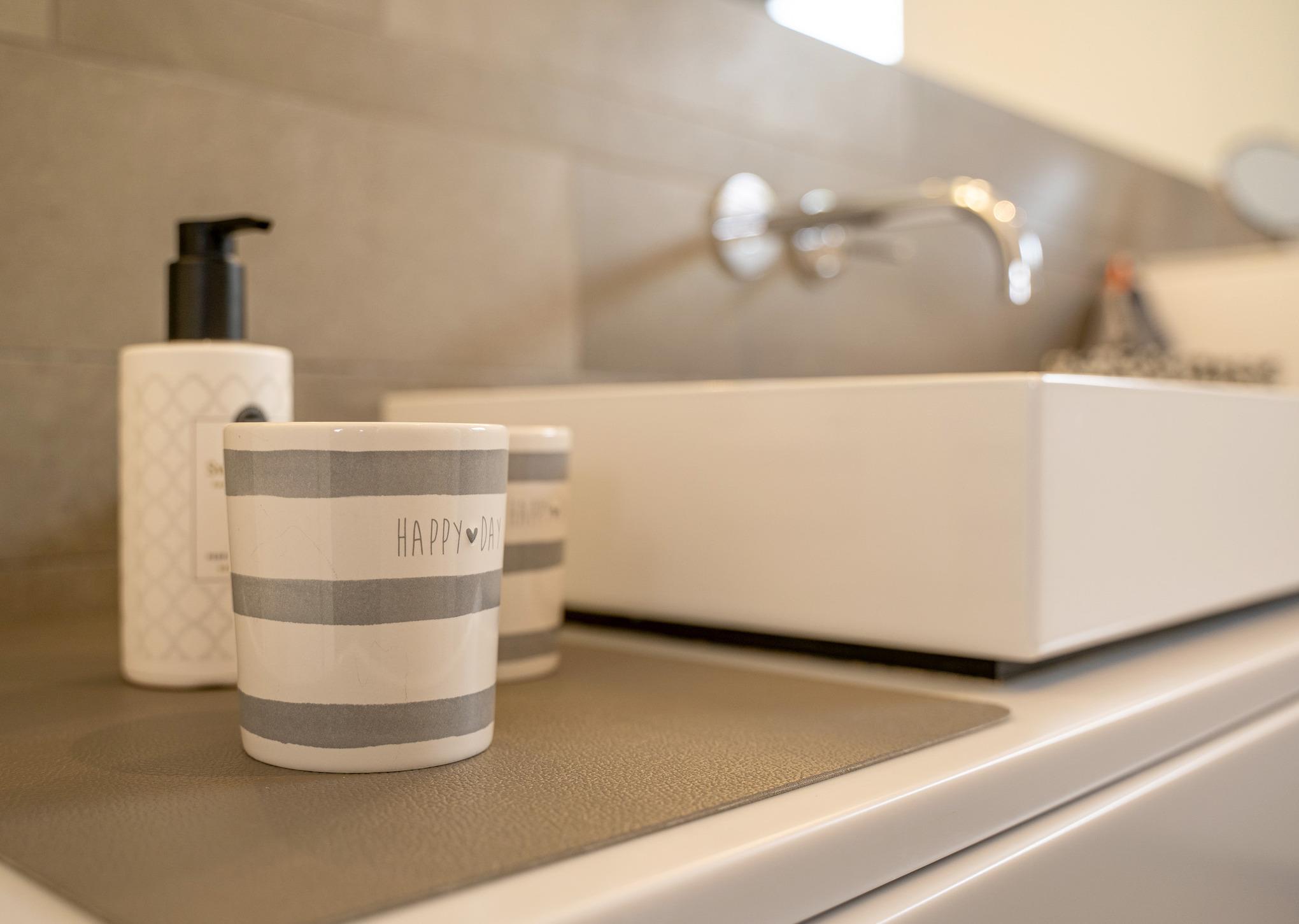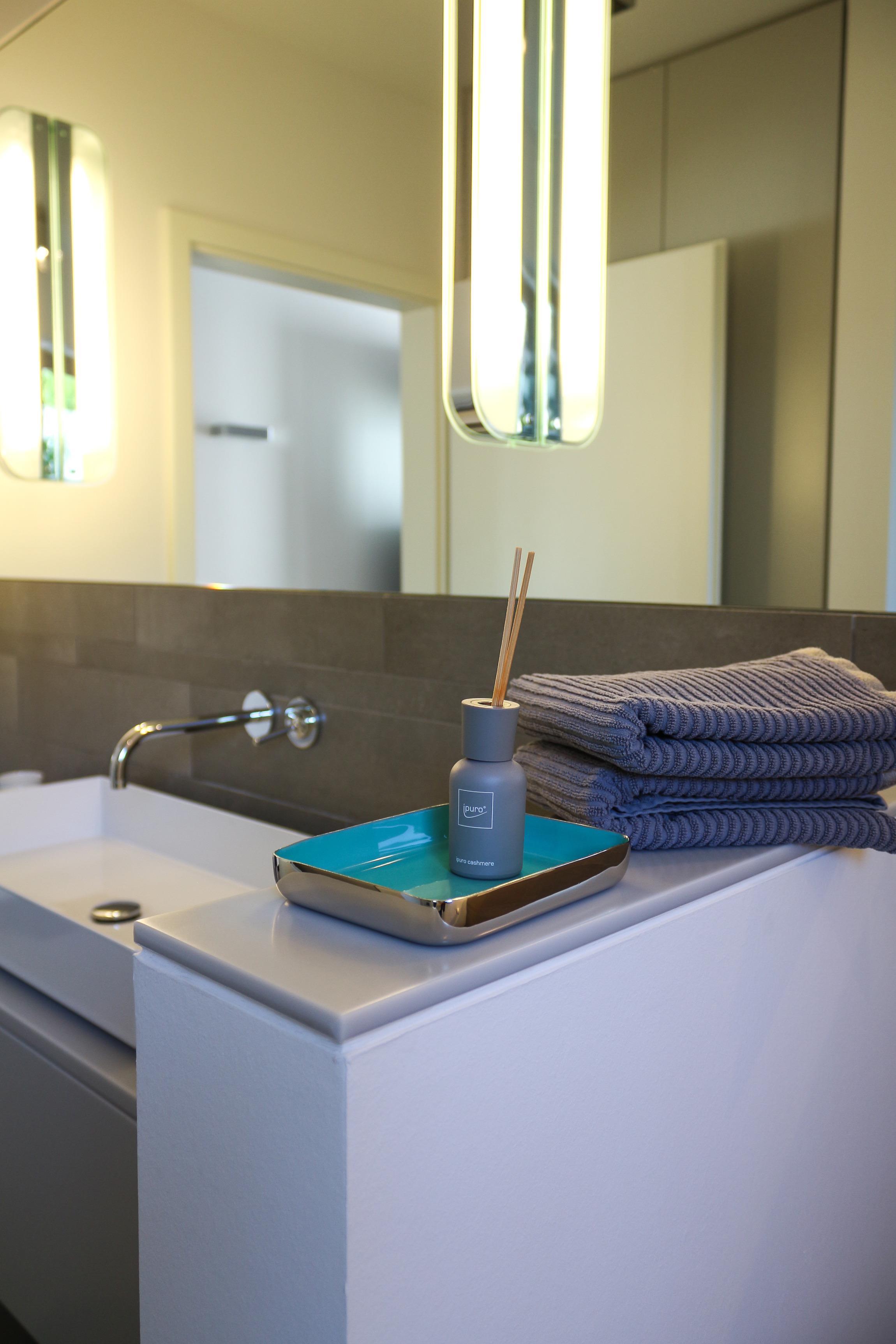 Das Badezimmer ist hell, freundlich und individuell eingerichtet und sehr geräumig.