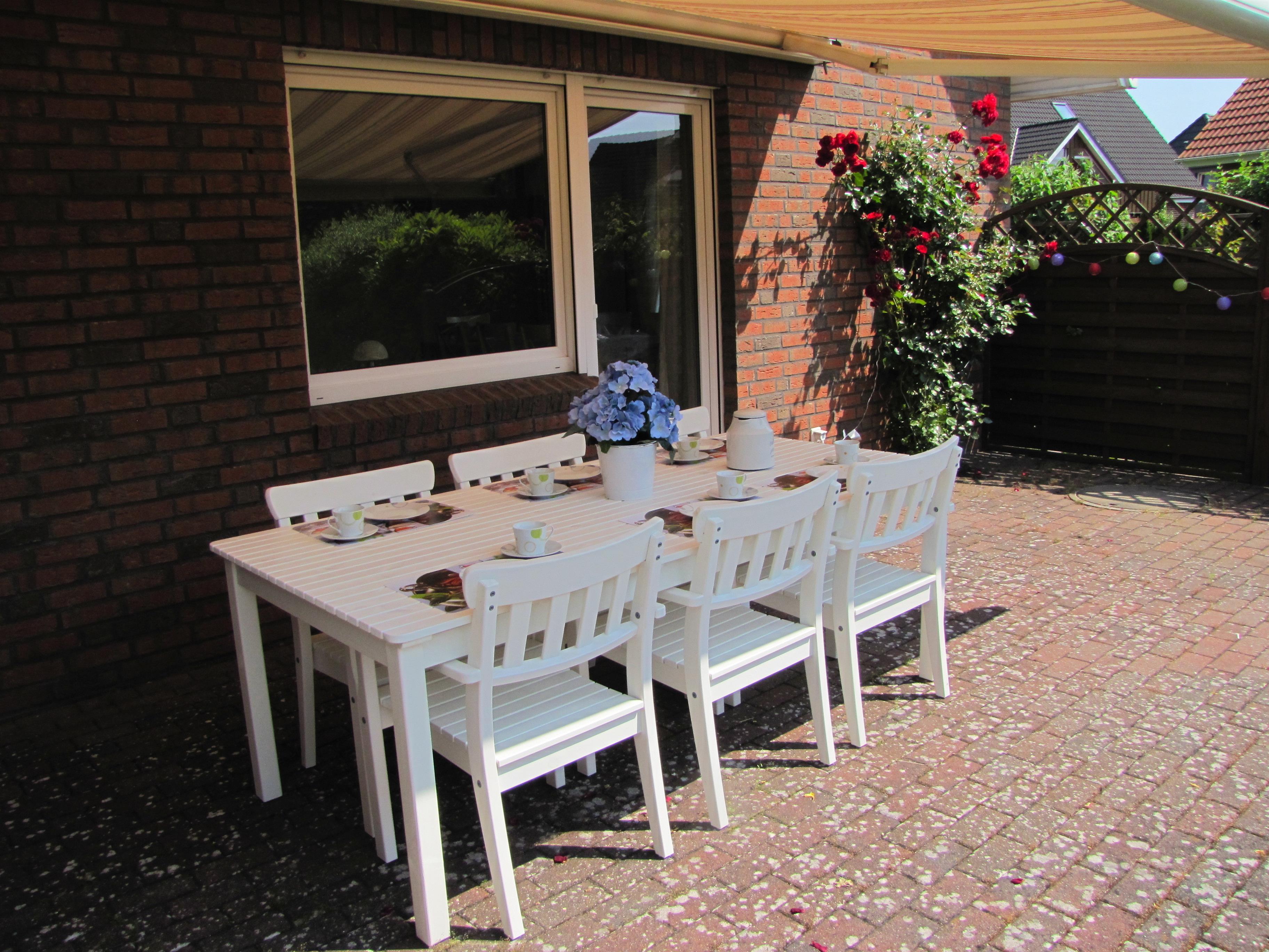 (20 m²) Gartenmöbel, 2 Sonnenliegen, Holzkohlegrill, Markise, kleine Sandmuschel