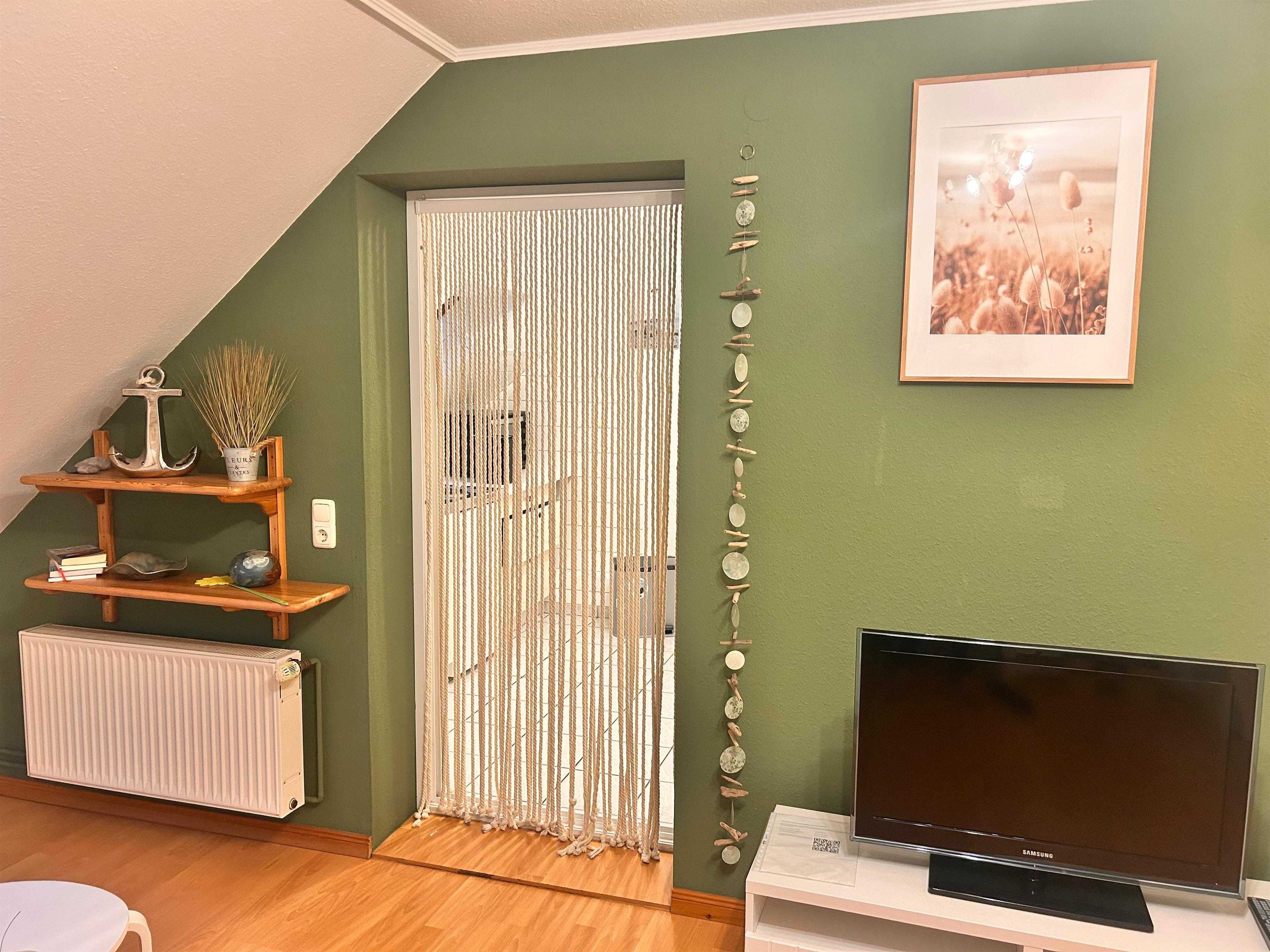 Die Ferienwohnung liegt im Obergeschoss und ist für 2 Personen eingerichtet. Im gemütliche Wohnzimmer mit Flachbildschirm können Sie wunderbar entspannen und den nächsten Strandtag oder vielleicht eine Fahrradtour quer über die Insel planen. Außerdem ist ein separates Schlafzimmer vorhanden, sowie eine Küche mit Essplatz und ein Duschbad.