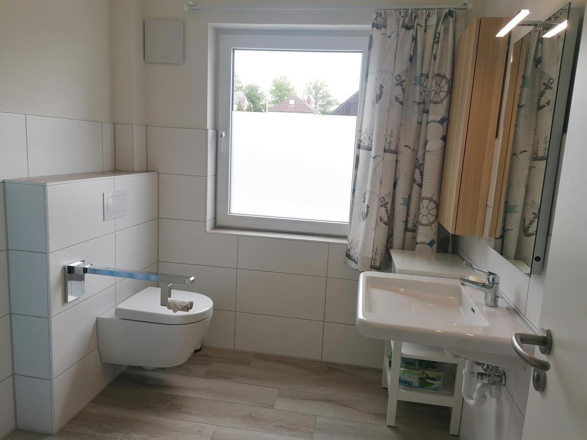 über eine Rampe leicht zu erreichen und verfügt über eine bodengleiche Dusche mit Duschhocker sowie ein unterfahrbares Waschbecken.