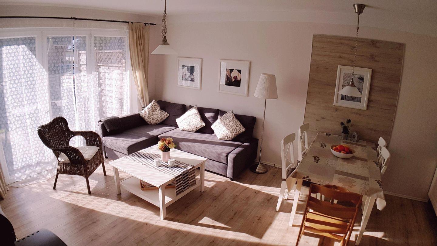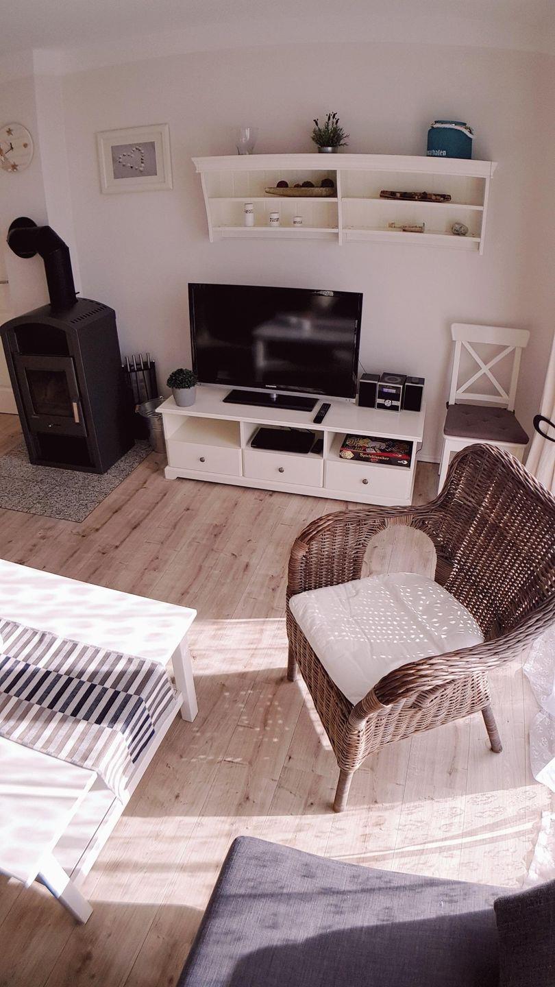 Der Wohnraum ist sowohl gemütlich als auch geschmackvoll eingerichtet. Er verfügt über einen Flachbildfernseher, eine Stereoanlage mit Radio und einen DVD-Player. Ein Kamin im Wohnraum sorgt zu jeder Jahreszeit für eine kuschelige Atmosphäre. Abgelagertes Brennholz und Anzündmaterial sind bei Bedarf mitzubringen, können aber auch im Baumarkt auf Fehmarn erworben werden.