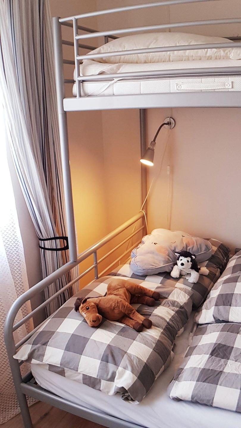 Im Elternschlafzimmer befindet sich ein 180x200 cm großes Doppelbett, im Kinderzimmer ein Etagenbett, unten 140x200 cm und oben 90x200 cm. Reisebettchen mit Matratze, Hochstuhl und Wickelauflage sind vorhanden.