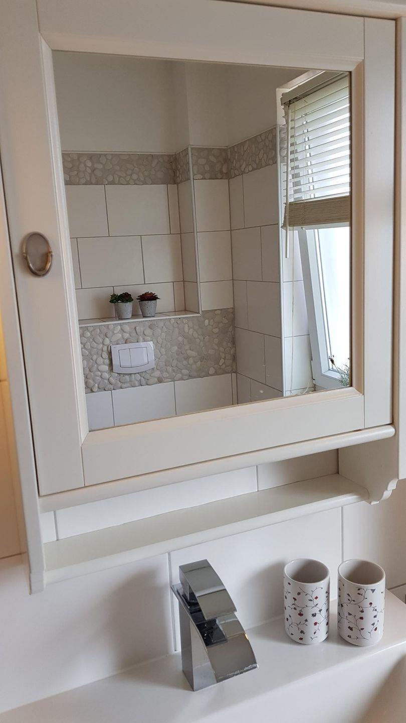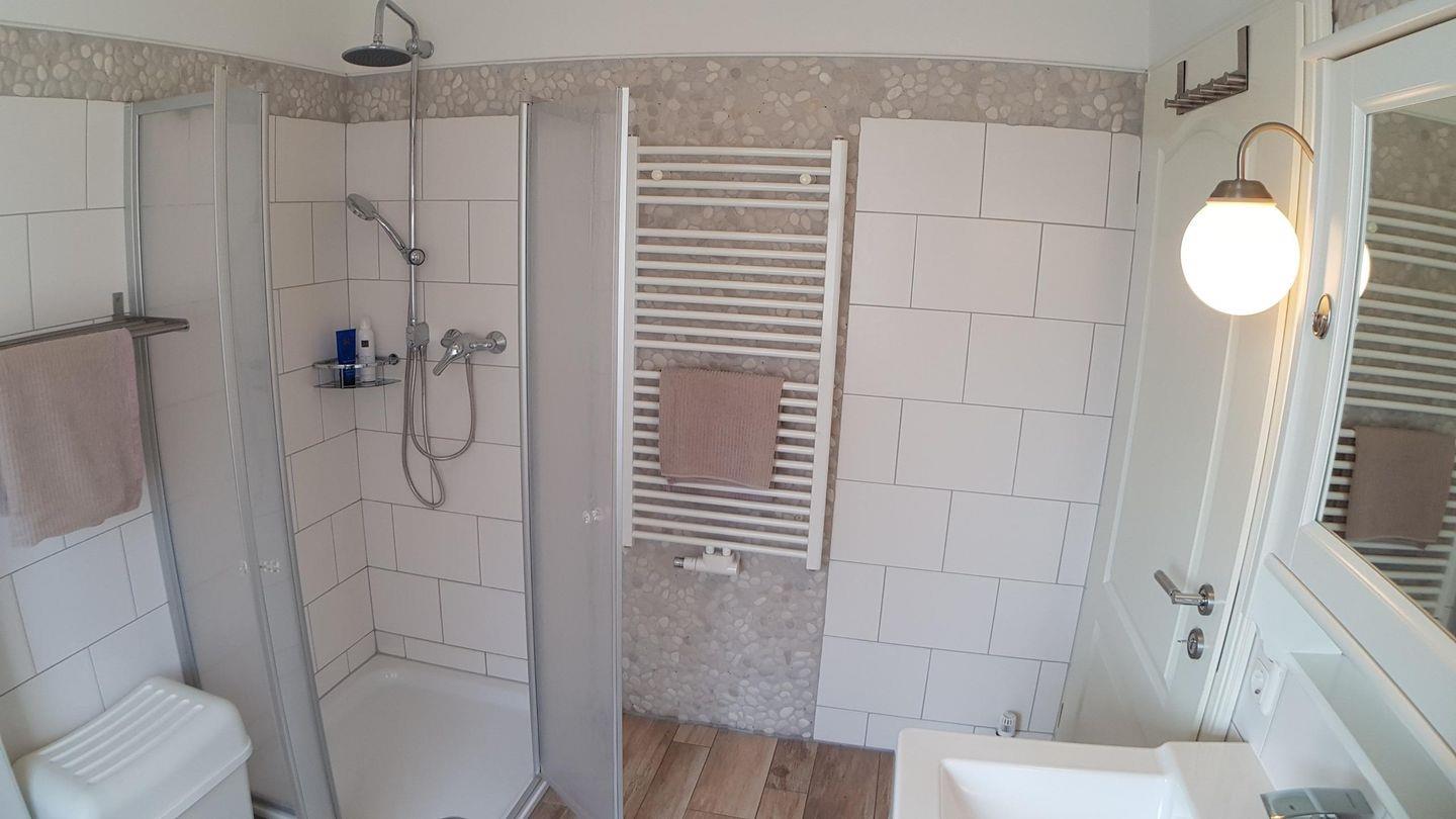 Das Badezimmer mit Dusche ist modern und komfortabel ausgestattet. Die Fußbodenheizung und der Handtuchwärmekörper sorgen für ein behaglich warmes Duschvergnügen. Einen Fön finden Sie im Waschbeckenunterschrank. Eine Rolle Toilettenpapier ist zu Beginn Ihres Aufenthaltes vorhanden. Des Weiteren stehen Ihnen ein Bügelbrett und ein Bügeleisen zur Verfügung.