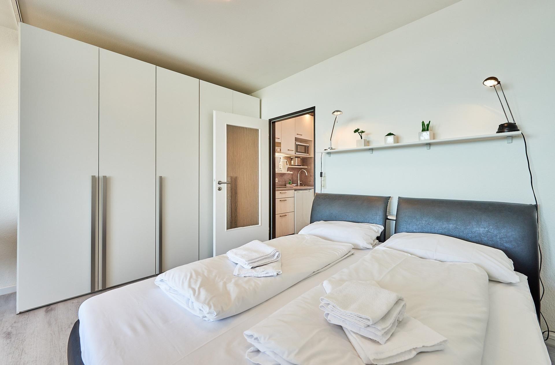Wohnzimmer: 1 Doppelbett (2x 80x200 cm), Verdunkelung: Gardinen, Kleiderschrank, Platz für ein Babybett vorhanden