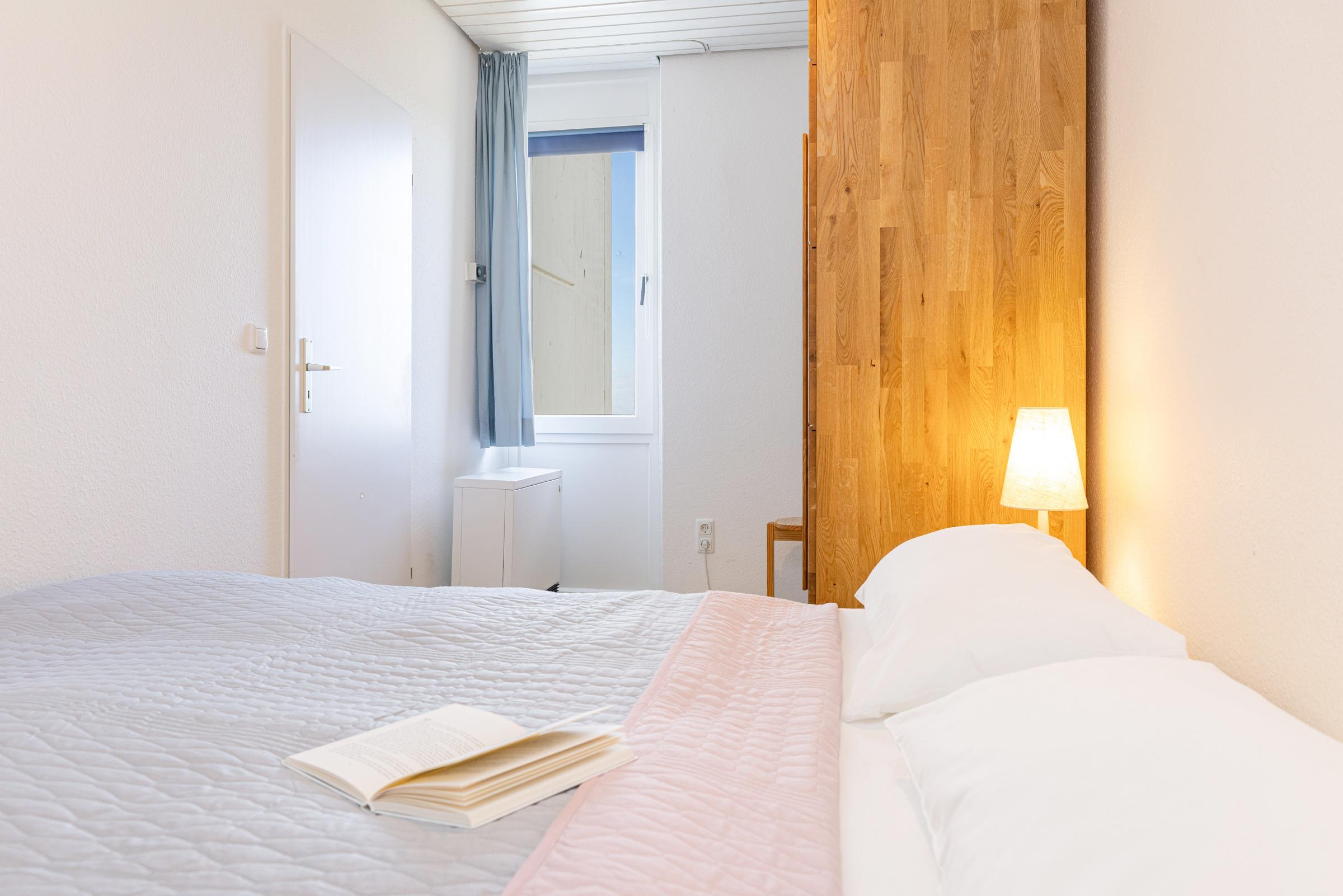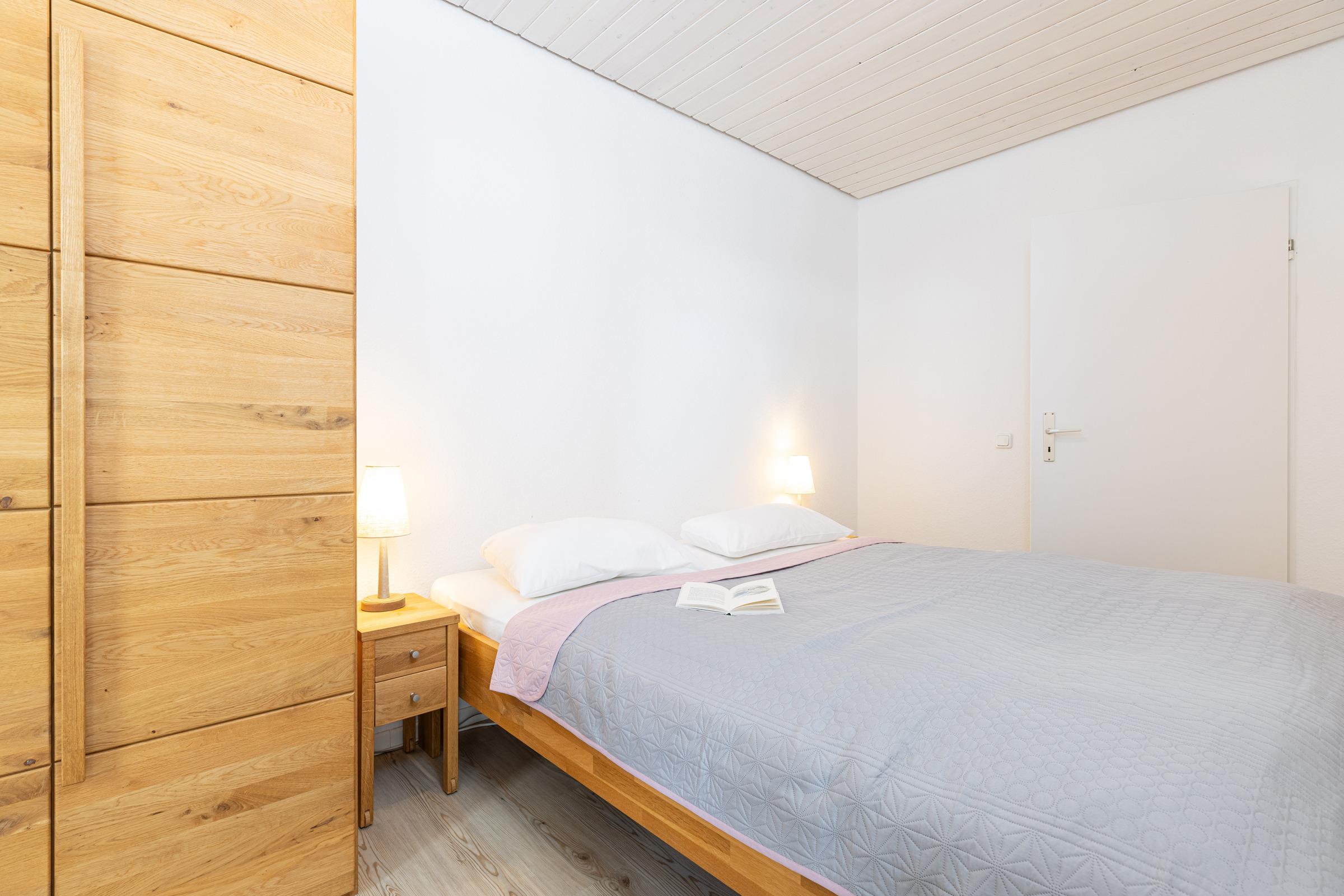Schlafzimmer: 1 Doppelbett, Verdunkelung: Rollos, Kleiderschrank, kein Platz für ein Babybett vorhanden