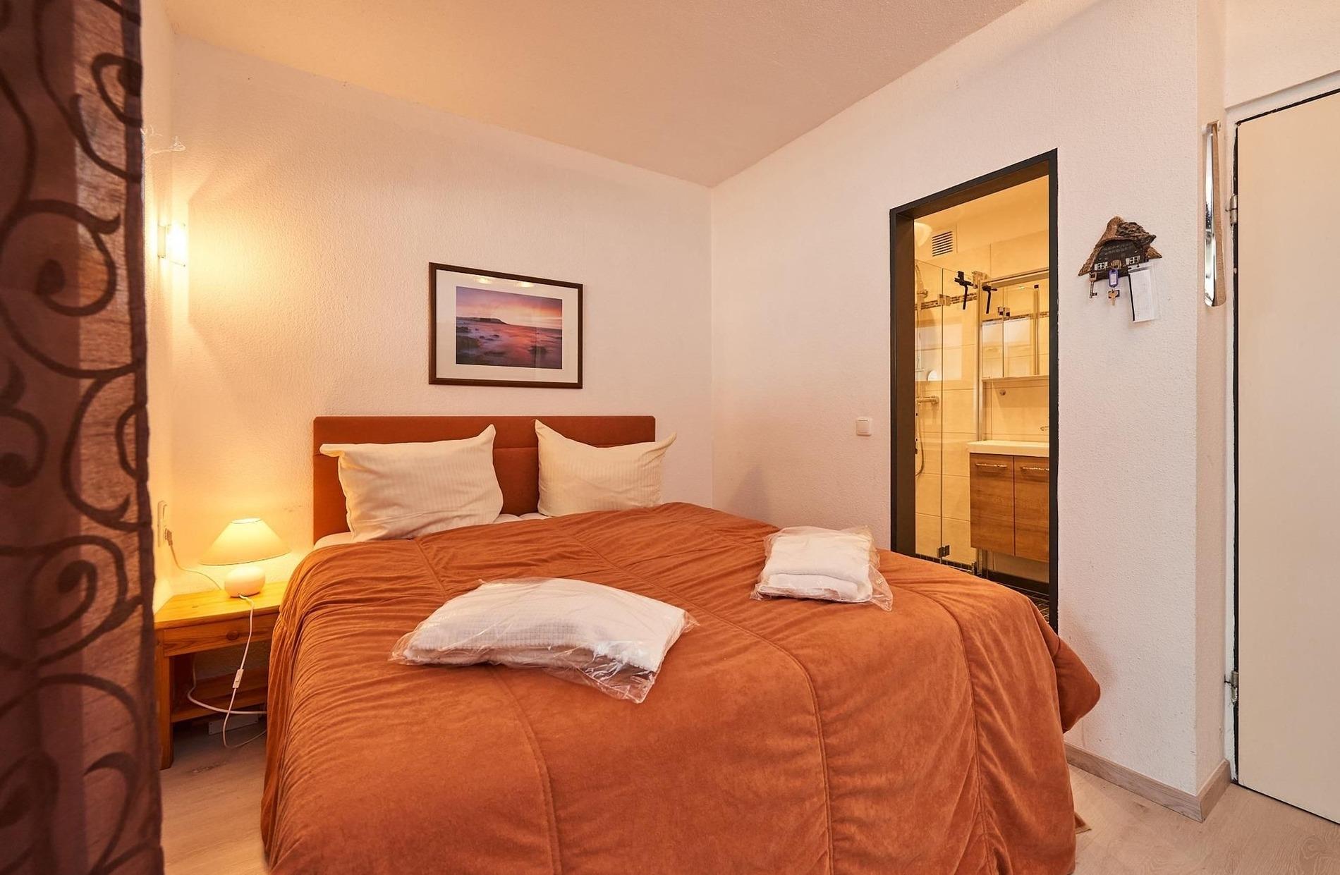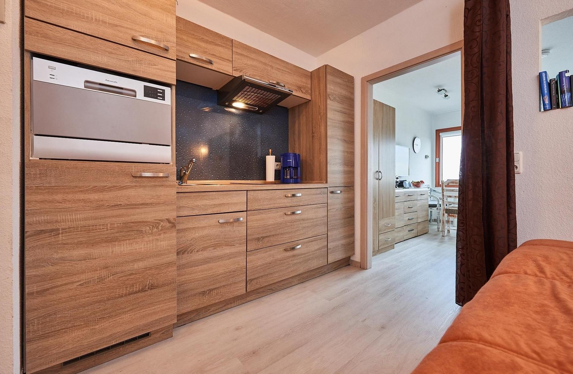 Die zauberhafte Wohnung punktet durch ihre durchdachte Aufteilung: Der kombinierte Wohn-/Schlafraum ist gemütlich eingerichtet und bietet einen wunderbaren Blick aufs Wasser. Der Fernsehsessel mit Liegefunktion sorgt für Erholung. Das kleine Fenster im Wohnzimmer ist mit einem Fliegenschutzgitter versehen. Das Doppelbett ist räumlich vom Wohnbereich abgetrennt. Dahinter geht es direkt ins innenliegende moderne Duschbad. Hier stehen Ihnen eine Waschmaschine sowie ein Trockner zur Verfügung. Die gut ausgestattete Küchenzeile inkl. Geschirrspüler befindet sich im Flurbereich.