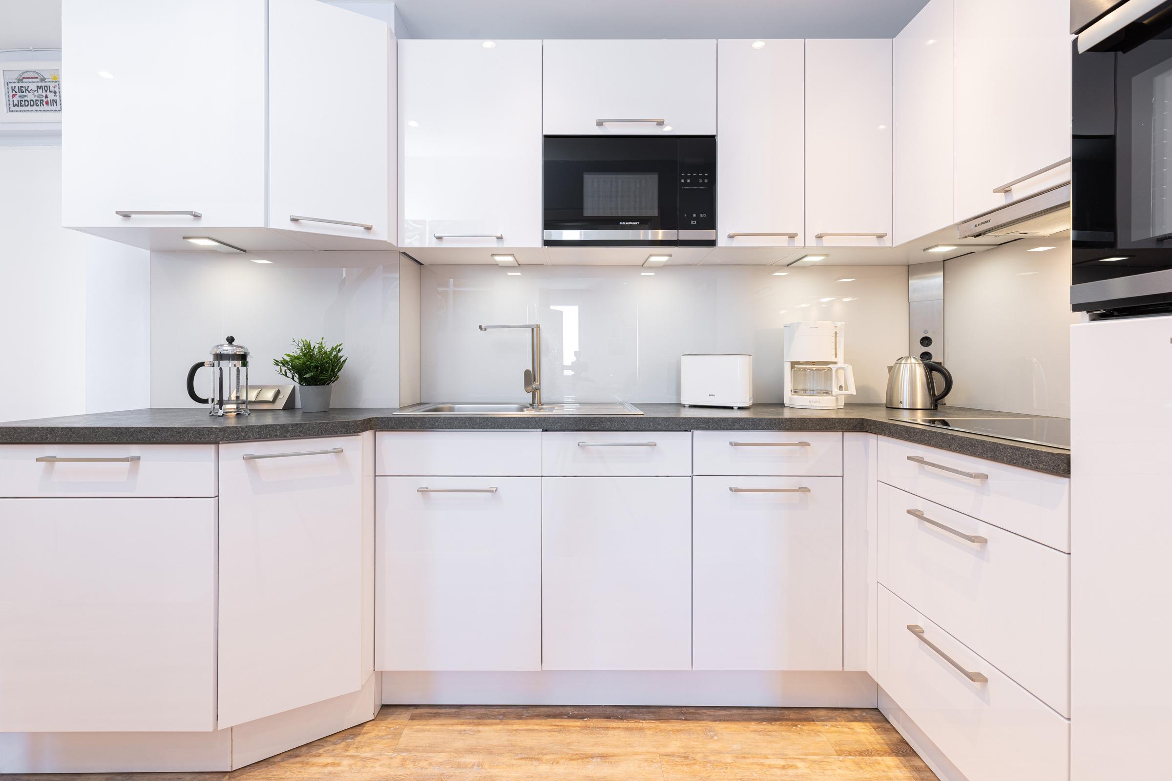 Der Blick vom Balkon und aus den Zimmern heraus ist herrlich: Sie schauen über die davor liegenden Bungalowdächer hinweg direkt aufs Meer in rund 100 Metern Entfernung. Beobachten Sie die ein- und ausfahrenden Schiffe und Boote oder das gegenüberliegende Surf- und Kite-Gebiet. Im Hintergrund ist die legendäre Fehmarnsundbrücke zu sehen. Machen Sie es sich gemütlich im Wohnschlafbereich. Das Doppelbett ist ein elektronisches Schrankbett, das tagsüber charmant verschwindet. Es fährt per Knopfdruck ein und aus. Auch die gemütliche Couch hat eine Doppelbett- oder Fernsehposition-Funktion (nach vorne hin ausklappbar). Die Küche umfasst sämtliche Annehmlichkeiten: Herd mit Cerankochfeld, Backofen, Kühlschrank mit kleinem Eisfach, Mikrowelle, Spülmaschine, Waschmaschine/Trockner (Waschtrockner), Kaffeemaschine, Wasserkocher, Toaster, Sandwich Maker sowie Raclette. Genießen Sie Ihre Mahlzeiten am Esstisch oder auf dem Balkon. Im Kinderschlafzimmer befindet sich ein gemütliches Einzelbett (ca. 90x200 cm) sowie ein Schreibtisch. Im modernen Duschbad gibt es eine Fußbodenheizung und eine große Handtuchhalterheizung. Für ein angenehmes Urlaubserlebnis sorgt ein Fliegengitter vor dem Schlafzimmerfenster und der Balkontür.