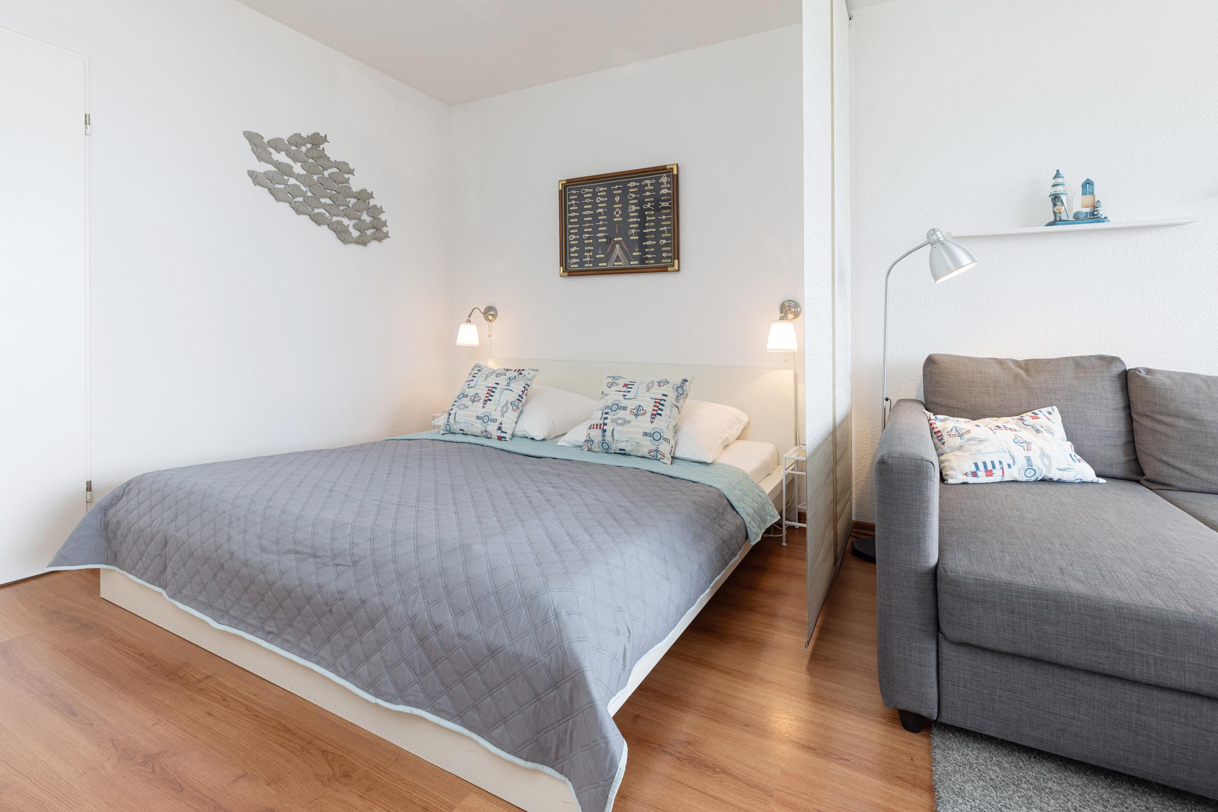 Die 49 m² große 2-Zimmer-Ferienwohnung Fernblick für bis zu 3 Personen liegt direkt am Südstrand, dem schönsten Sandstrand der Insel Fehmarn. Die Wohnung befindet sich in der 3. Etage eines vierstöckigen Appartementhauses und bietet einen seitlichen Meerblick.