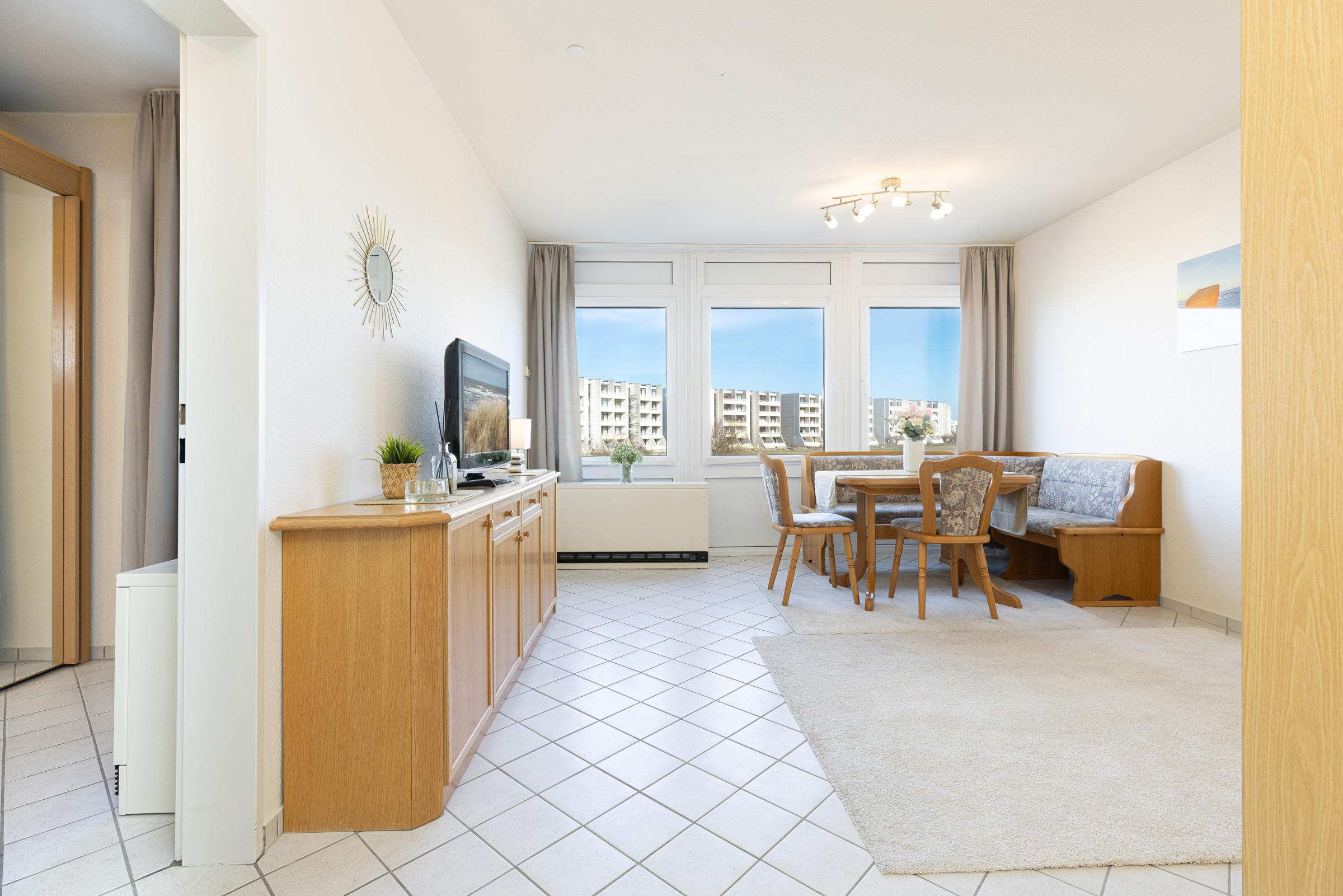 Ankommen, auspacken, wohlfühlen! Diese schöne Ferienwohnung überzeugt durch ihre gemütliche Einrichtung und ihre exklusive Lage - nur rund 100 Meter vom Strand entfernt. Es erwarten Sie ein Wohnzimmer mit schöner Sitzecke, TV-Gerät und einem bequemen Doppel-Schrankbett, in einem separaten Schlafraum steht ein Einzel-Schrankbett. In der gut ausgestatteten Küche können Sie sich prima selbst versorgen. Das kleine, aber feine Duschbad bringt Sie entspannt in den neuen Tag..