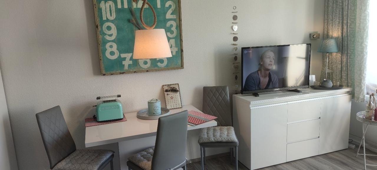Eine liebevoll eingerichtete Ferienwohnung mit einer Größe von 34 qm . Die Einrichtung ist hell und farblich aufeinander abgestimmt. Die Ferienwohnung ist Teil der Ferienanlage "Arne Jacobsen". Sie hat einen offenen vorderen Schlafbereich mit einem 160 x 200 cm Bett für 2 Personen, das zum Ausruhen einlädt. Im hinteren Wohnbereich machen Sie es sich auf dem Schlafsofa gemütlich, lesen ein Buch oder schauen fern auf dem 50 Zoll Flach TV und geniessen Ihre Serien (permanentes w-lan ohne fBegrenzung vorhanden).