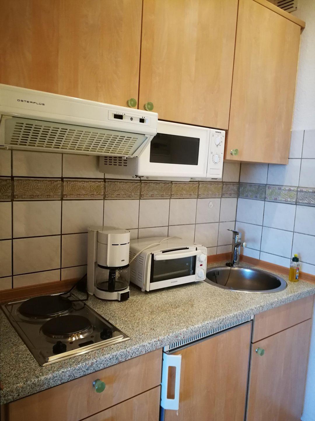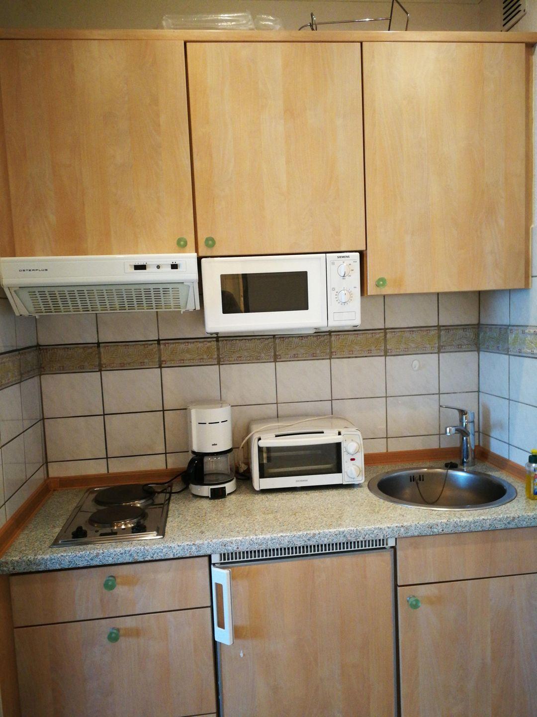 Die Küche ist mit einem 2-Kochfeld, einer Mikrowelle mit Grill, einem Kühlschrank mit 3-Sterne-Gefrierfach und natürlich auch einem Wasserkocher und einem Toaster ausgestattet.