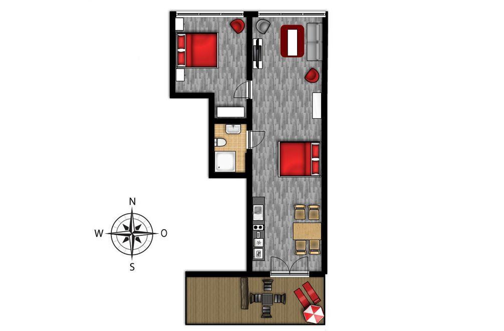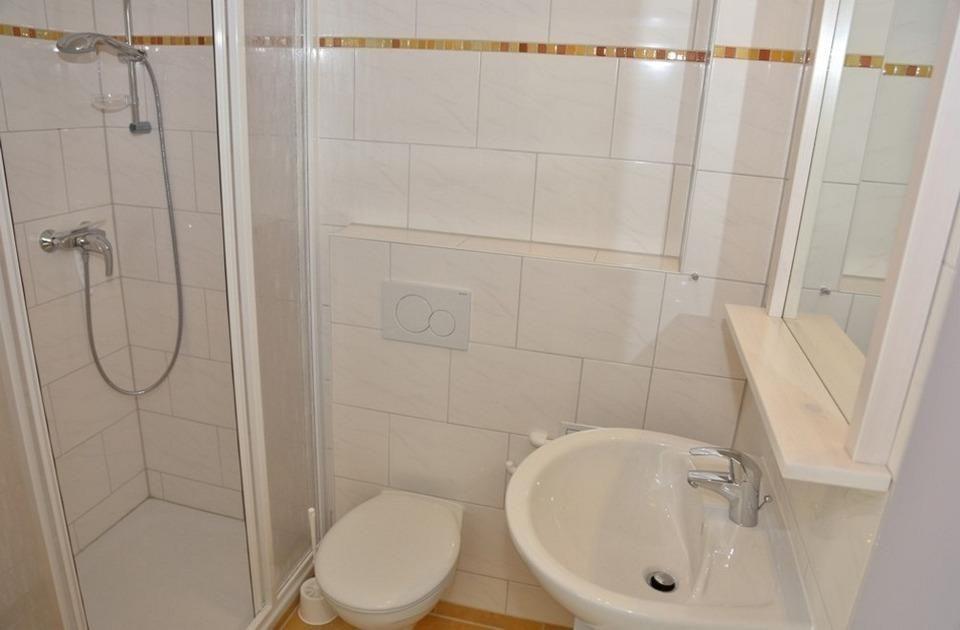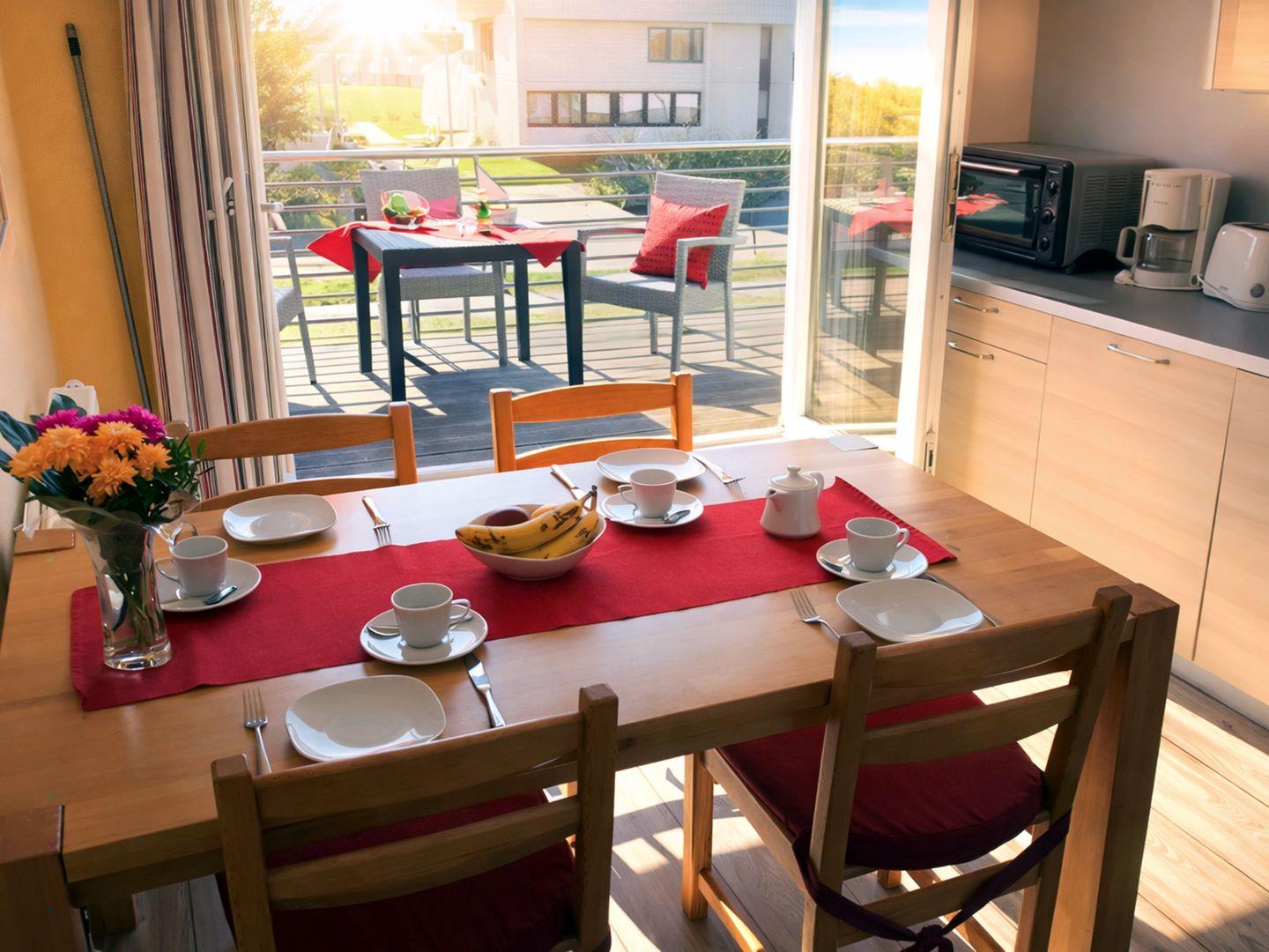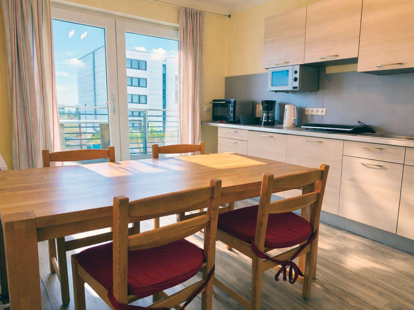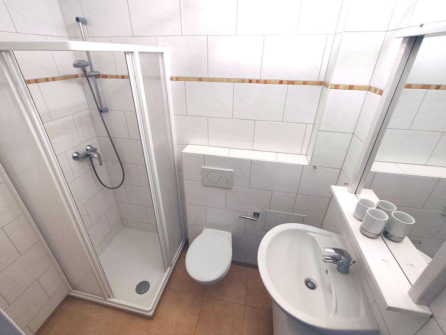 Die Wohnung 10 ist die Eckwohnung im 1. Obergeschoss und somit ideal für Gäste, die es etwas ruhiger mögen. Sie ist über die Terrasse zu erreichen. Im Objekt befindet sich ein festes w-lan Netzwerk, in der Wohnung ein smart TV. Die Wohnung besteht aus einem großen Wohn-/Schlafraum mit Schlafsofa (140x200cm) sowie einem Wandklappbett (180x200cm) und einem Essplatz für bis zu 6 Personen. Die im selben Raum befindliche Versorgungsbar ist mit einem Kühlschrank, einer Mikrowelle und einem Kochfeld sowie einem mobilen Minibackofen ausgestattet. Geschirr und alles was Sie für Ihren Urlaub benötigen ist ebenfalls vorhanden. Separat steht Ihnen noch ein Schlafzimmer mit Doppelbett (180x200cm) sowie einen Kleiderschrank zur Verfügung. Das Duschbad rundet die Wohnung mit ihren 53qm ab.
