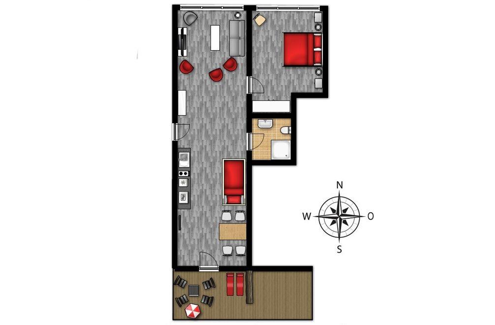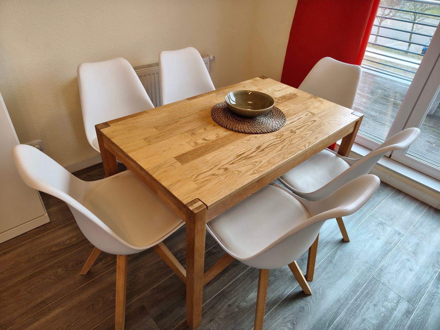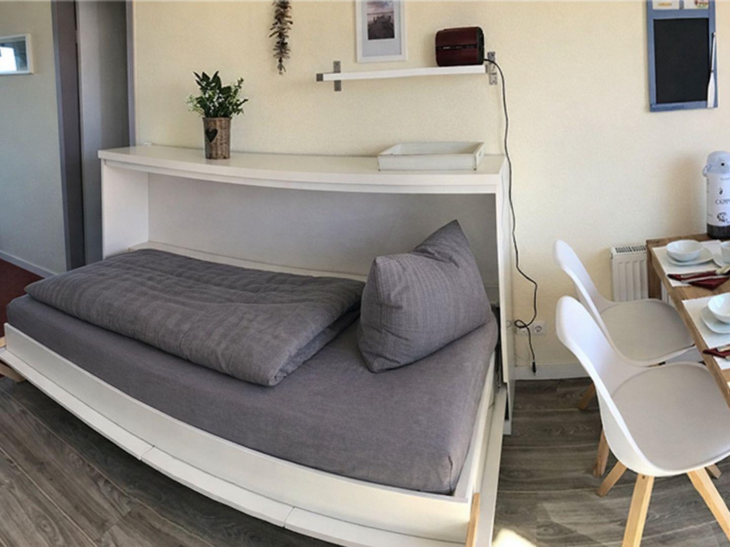 Sie besteht aus einem Wohnzimmer mit Essecke mit 4 Sitzplätzen, einer Versorgungsbar mit Kühlschrank, 2 Platten-Ceran-Feld, Mikrowelle, Kaffeemaschine, Toaster und einem Schlafzimmerbereich mit Doppelbett. Das Besondere ist der einmalige Blick auf die neu gestaltete Hafenpromenade mit eigener, abgetrennter Holzterrasse. Das Sofa im Wohnzimmer ist ausziehbar und verfügt über 2 weitere Schlafmöglichkeiten (140 x 200cm). Vom Sofa schaut man auf die Schiffe im Hafen mit all seinem maritimen Flair. Im Objekt befindet sich ein festes w-lan Netzwerk, in der Wohnung ein smart TV. Das Badezimmer besticht durch seine ebenerdige Dusche und ist somit auch für gehbehinderte Menschen ideal. Der kostenfreie, neugestaltete PKW-Stellplatz ist direkt vor der Tür.