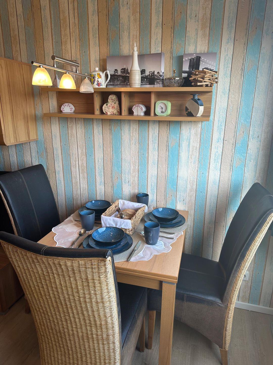 Das Appartement ist für 2 Personen ausgestattet. Der Wohnbereich ist mit einem integriertem Essbereich, einem komfortablen Schrankbett (180*200 cm), sowie einer Fernsehecke und einer großen Fensterfront ausgestattet. Genießen Sie den Ausblick auf den Segelhafen und den Hafen von Burgstaaken.