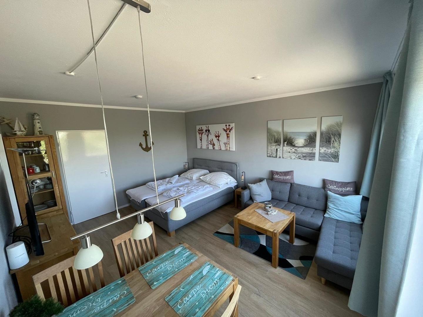 Der Wohnbereich hat einen gemütlichen Essbereich, verfügt über neue Möbel und ein Boxspringbett (160 x 200 cm) . Ein Flachbildfernseher und eine Radio/DVD Kombination lassen auch bei Regen keine Langeweile aufkommen. Vervollständigt wird der Raum durch eine gemütliche Couchgarnitur., auf der Sie mit einem guten Buch entspannen können.