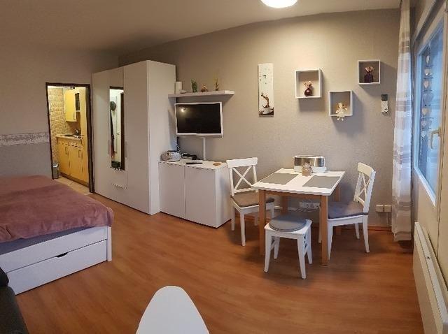 Der Wohnraum bietet ein Doppelbett (160x200cm) mit Taschenfederkern Matratzen inkl. Gel Topper, zwei gemütliche Ledersessel, eine Essecke sowie einen Kleiderschrank.