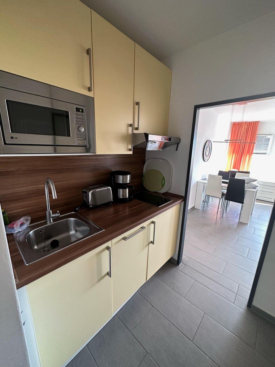 Die Küche ist mit einem 2-Kochfeld, einer Mikrowelle mit Grill, einem Kühlschrank mit 3-Sterne-Gefrierfach und natürlich auch einem Wasserkocher und einem Toaster ausgestattet.