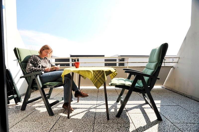 Der grosse Balkon bietet viel Platz für gemütliche Kaffeestunden.Er ist mit Tisch und hochlehnigen Stühlen für 4 Personen ausgestattet.