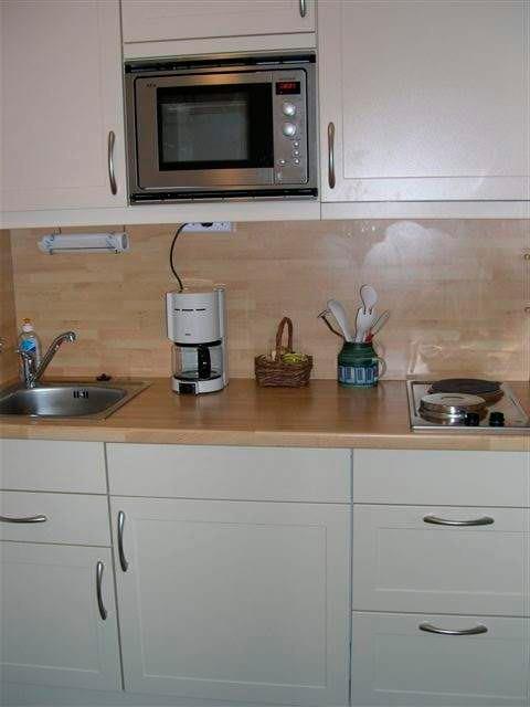 Küchenzeile im hellem Design mit Mikrowelle, Toaster, Eier- und Wasserkocher und Quirler. Zur Ausstattung des Badezimmers gehört eine Runddusche und selbstverständlich ein Handtuchtrockner und ein Fön.