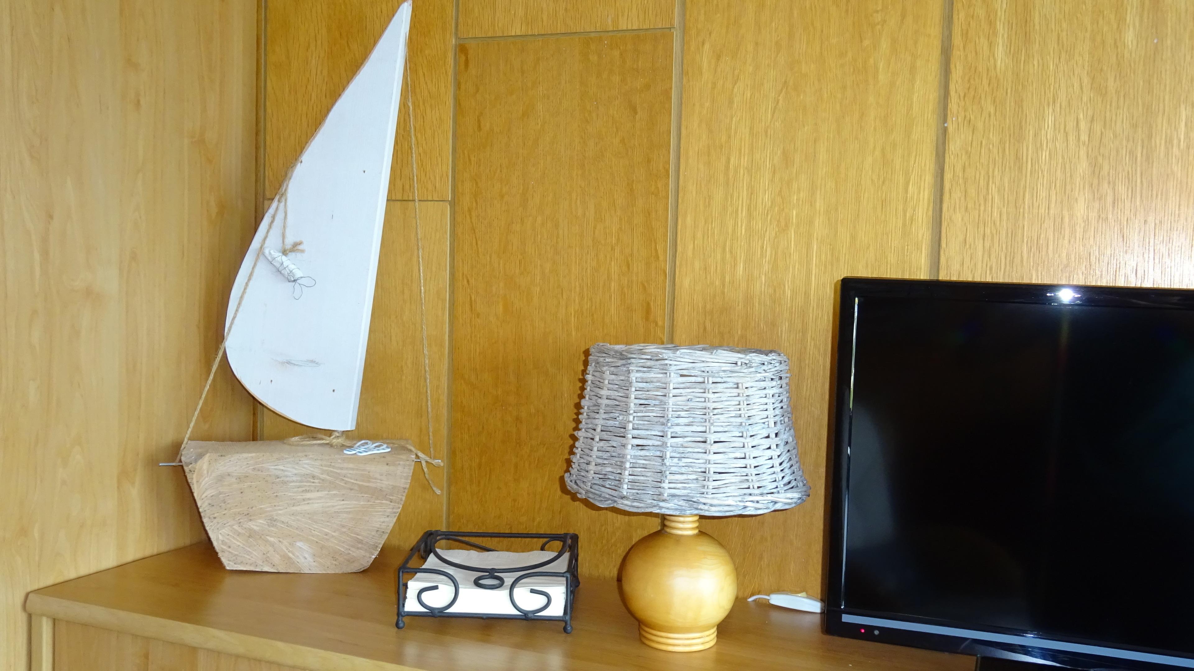 - 2 einzelne Schrankbetten, gemütliche Essecke, Sitzecke (Couch, Sessel und kleiner Tisch), beleuchtete Vitrine, SAT-TV, DVD-Player, Radio/CD
