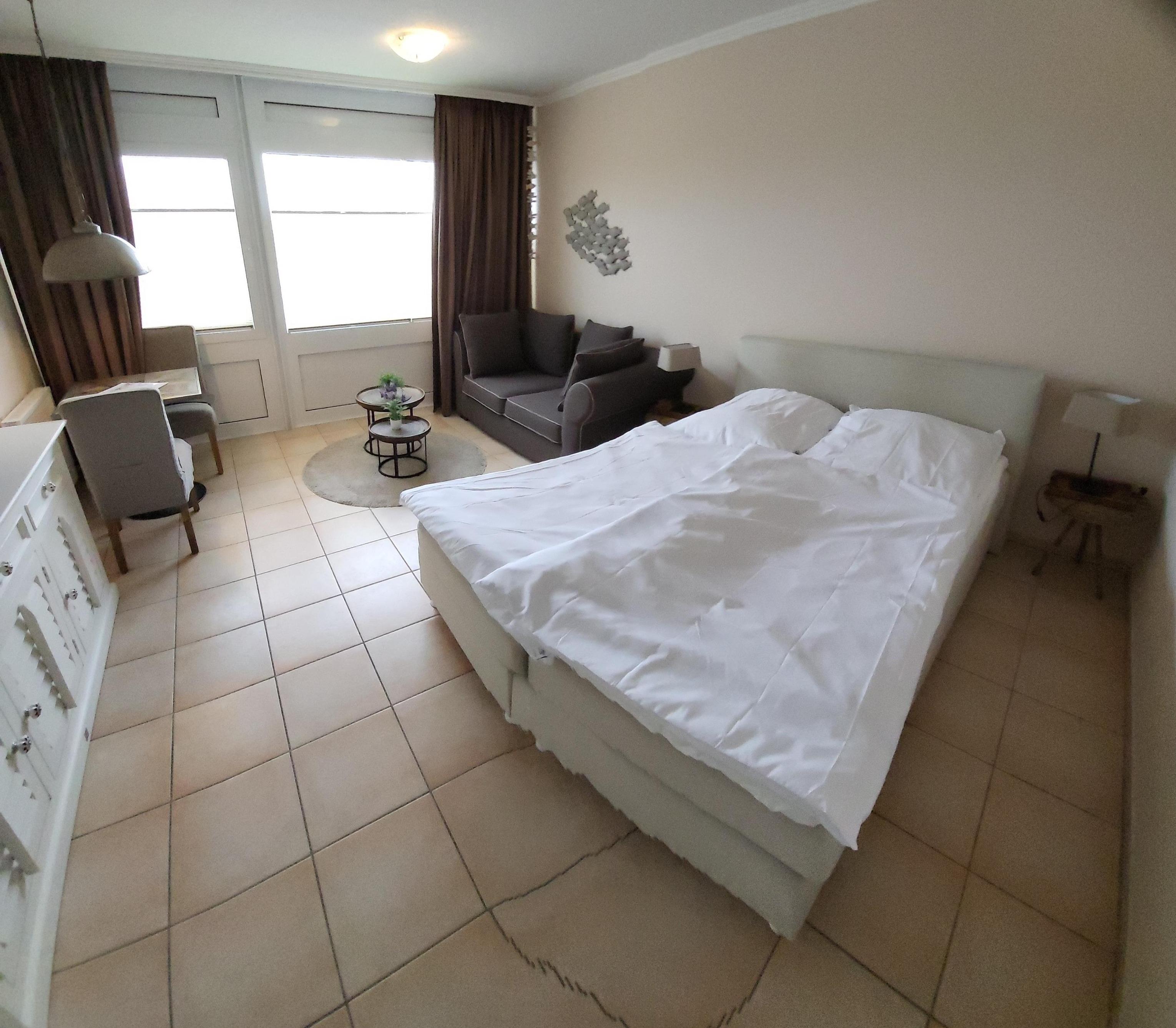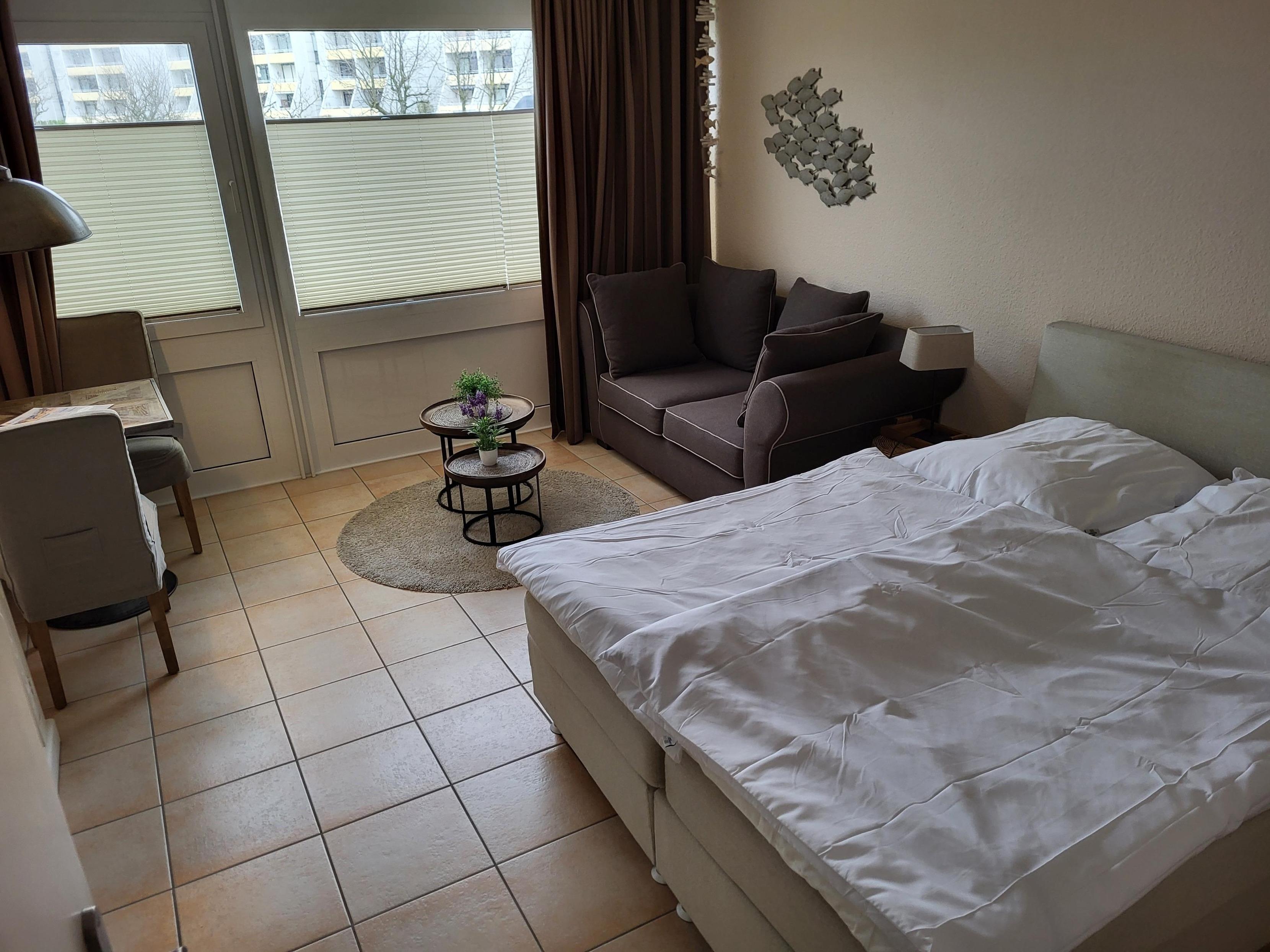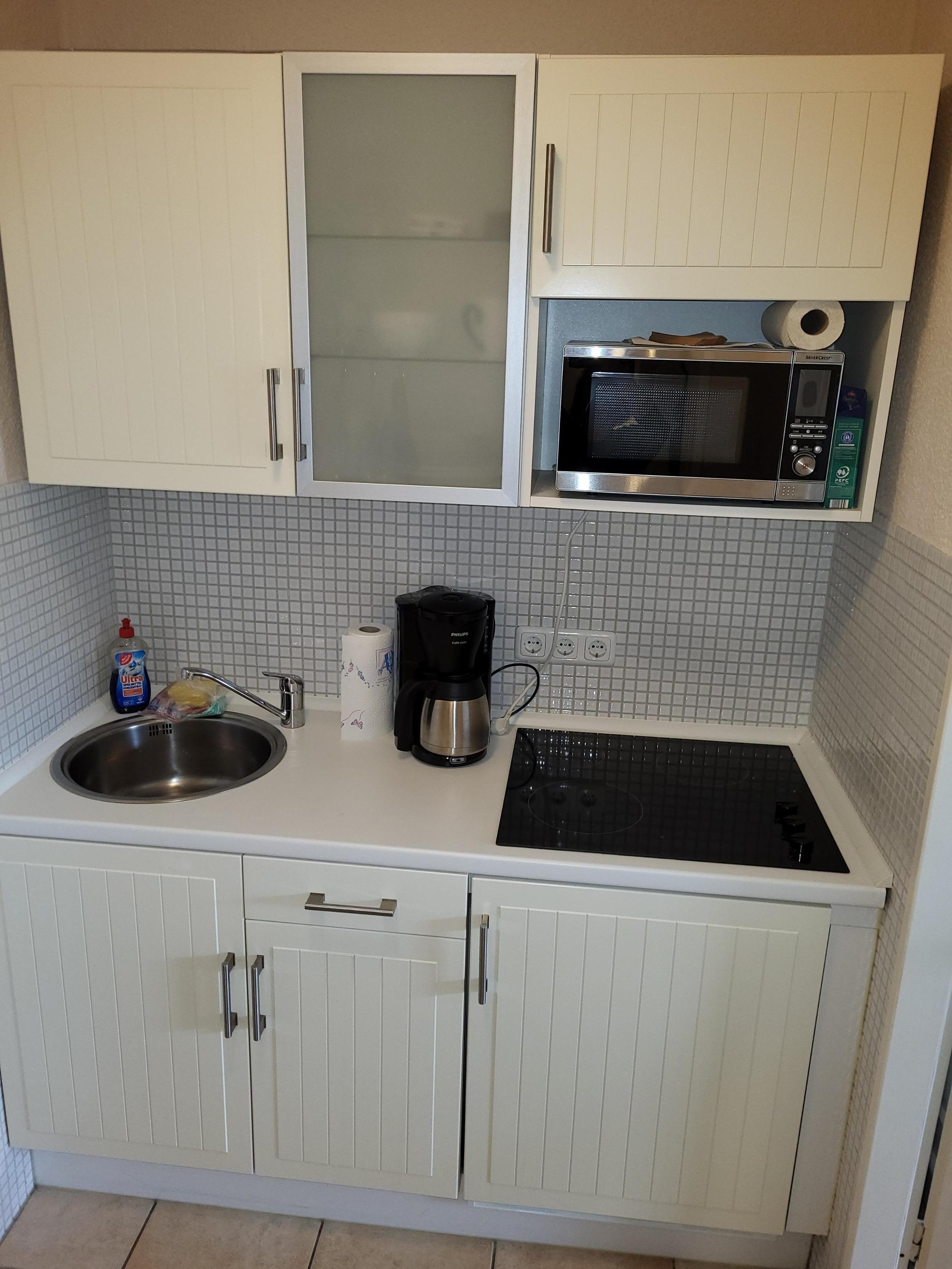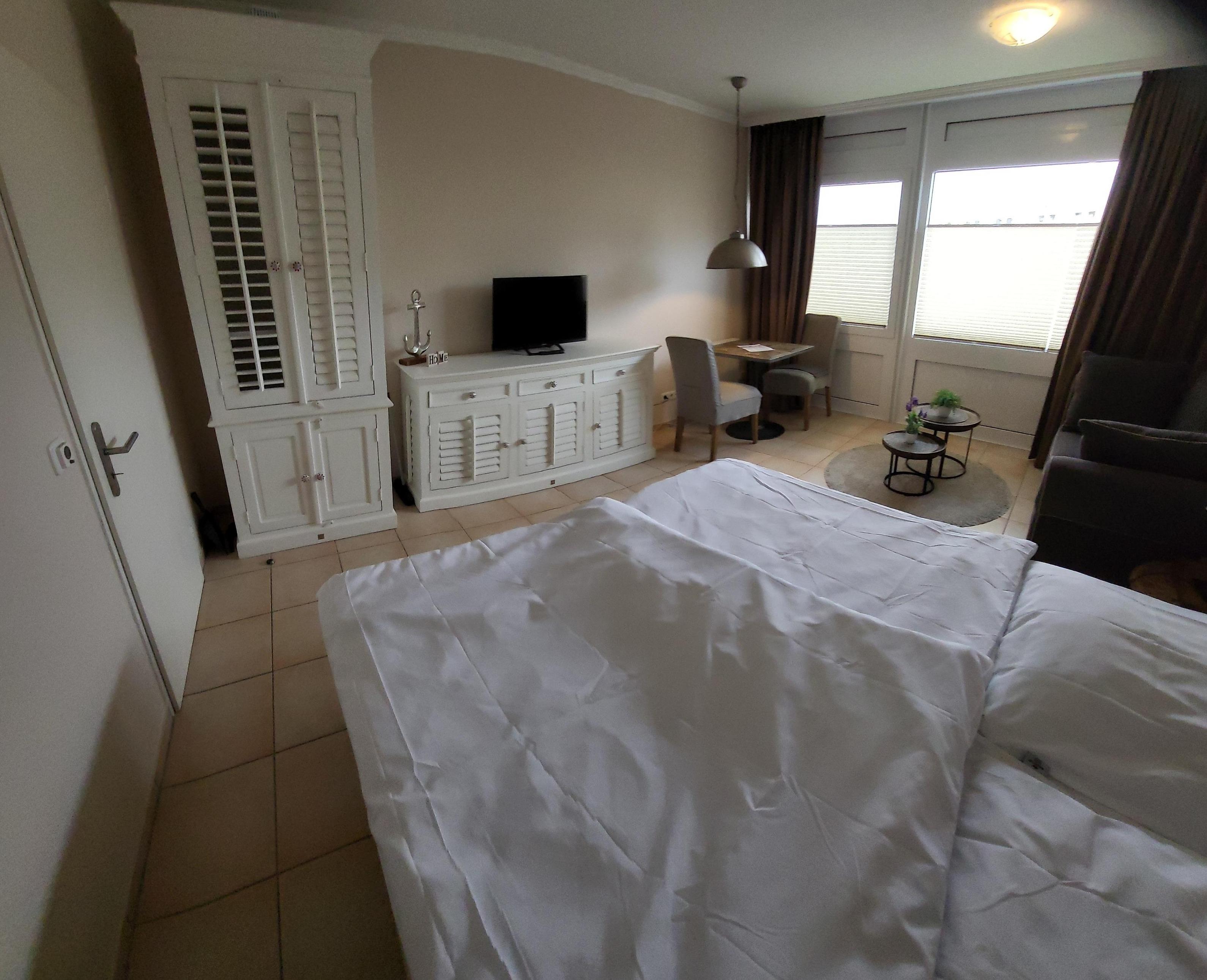 In diesem Einraumappartment mit Pantryküche und Duschbad kann man sich nur wohlfühlen. Eigentlich will man hier gar nicht mehr ausziehen. Das Doppelbett ist mehr als bequem. Die Matratzen mit Härtegrad H3 wurden im Mai 2020 erneuert. Die Bettdecken haben nun das Komfortmaß 155x220 cm. Auch das Sofa lädt zum Kuscheln bei einem Sekt oder Wein ein. In der kleinen, abgeteilten Küche fehlt es an nichts. Hier macht man sich gern sein Frühstück oder andere Kleinigkeiten. Das Bad mit seiner ebenerdigen Dusche ist ebenfalls einfach nur schön! Chic, neu und schön!
