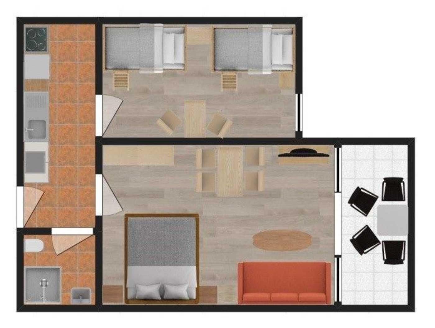Zusätzlich haben Sie noch einen Schlafraum mit 2 Doppelstockbetten und Kleiderschrank, sowie einer kleinen Sitzecke, eine voll ausgestattete Küche, ein Duschbad und einen Balkon mit Tisch und Stühlen.