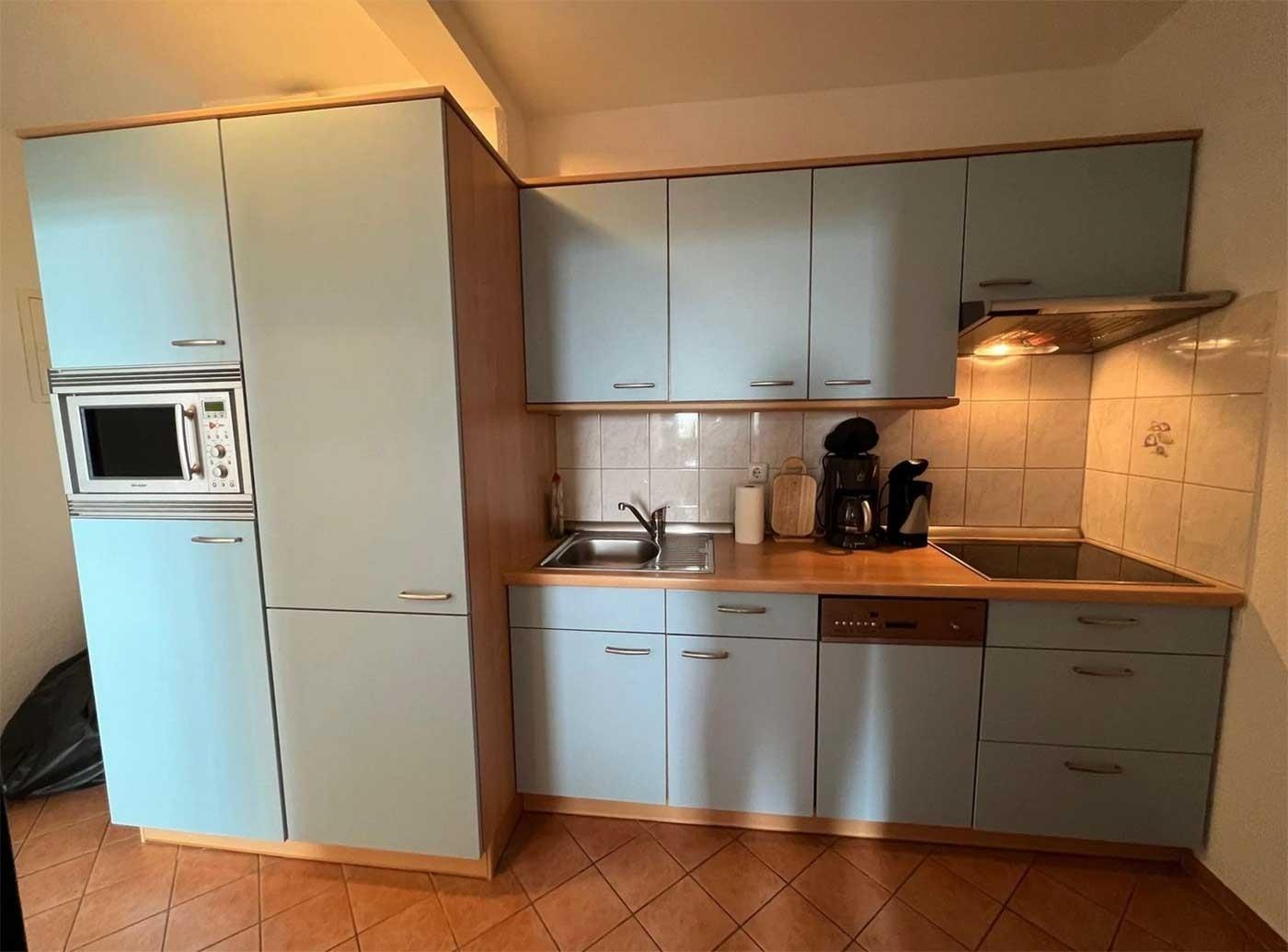 In der Küche befindet sich ein Kühlschrank mit Gefrierfach, ein Cerankochfeld mit 4 Kochfeldern und Dunstabzugshaube sowie die übliche Standardausstattung wie Kaffeemaschine, Mikrowelle, Toaster, etc.
