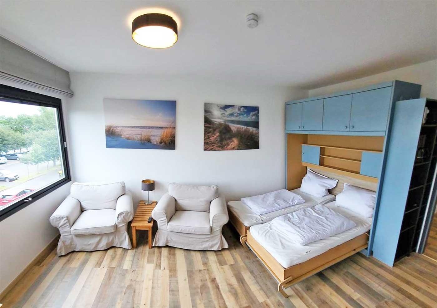 Das kombinierte Wohn- und Schlafzimmer ist mit einem Klappbett ausgestattet, zwei Sesseln und einem Esstisch.