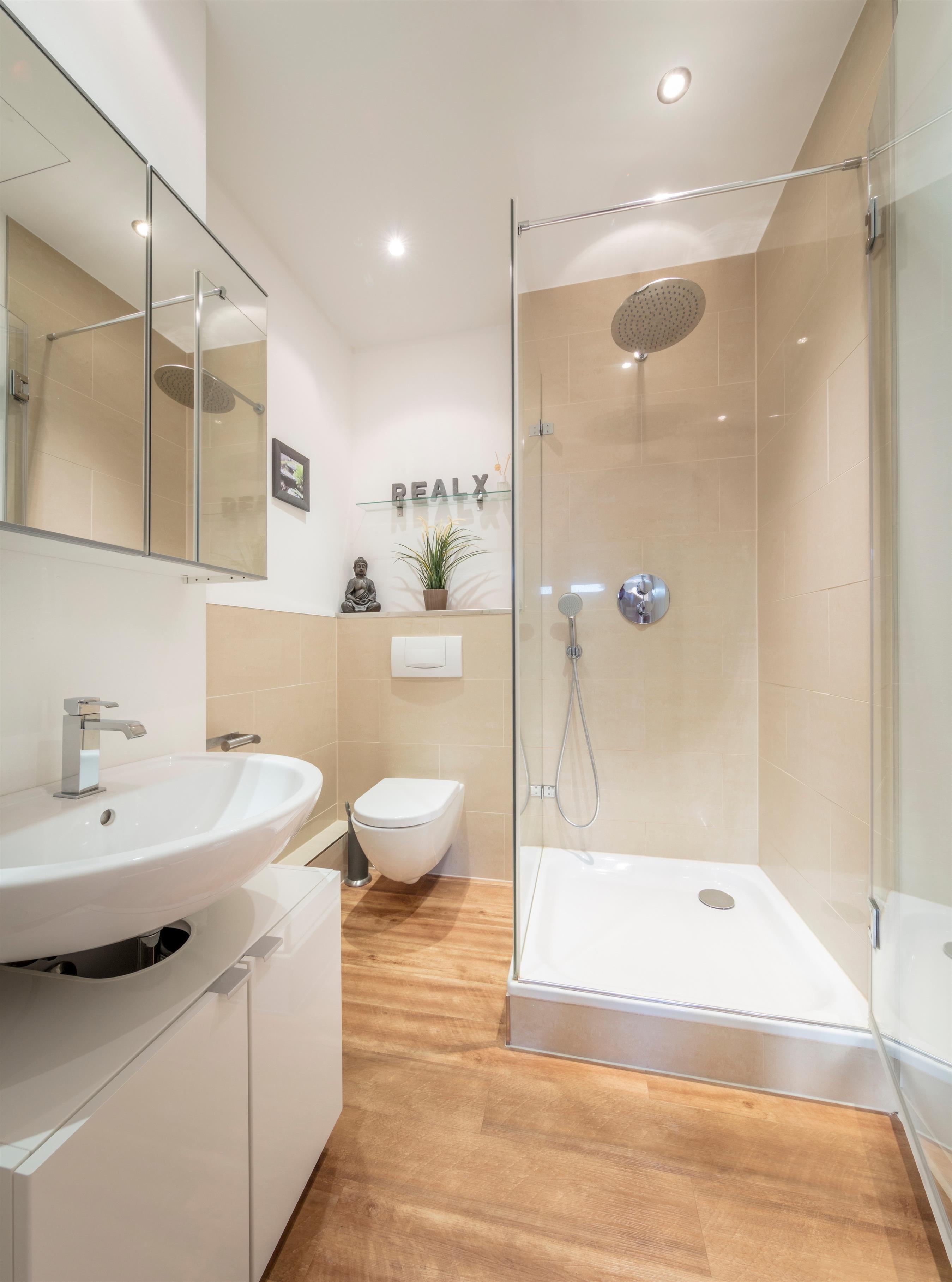 Das Bad verfügt über WC, Waschbecken, Dusche und Haartrockner.
