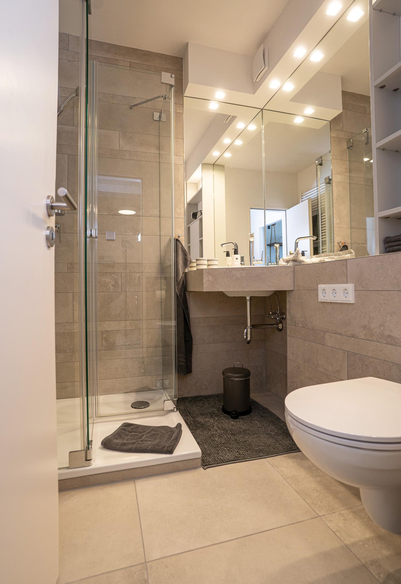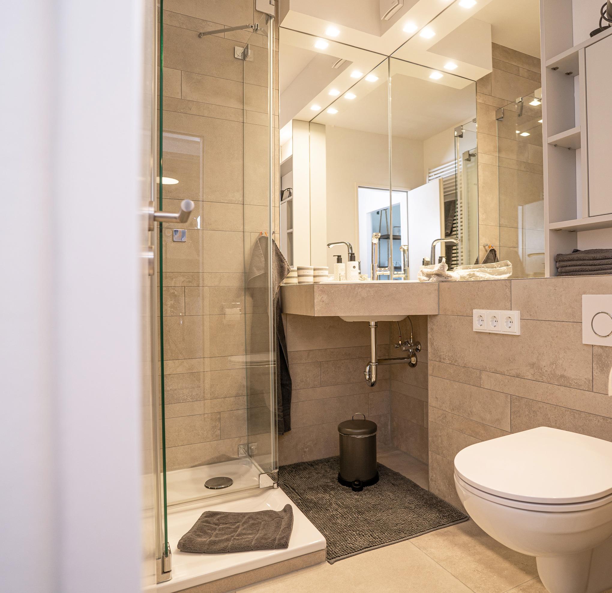Das Bad ist hell und freundlich gefliest. Die Dusche hat eine Größe von 80x80cm. Ein Durchlauferhitzer bietet Ihnen unbegrenzt heißes Wasser.