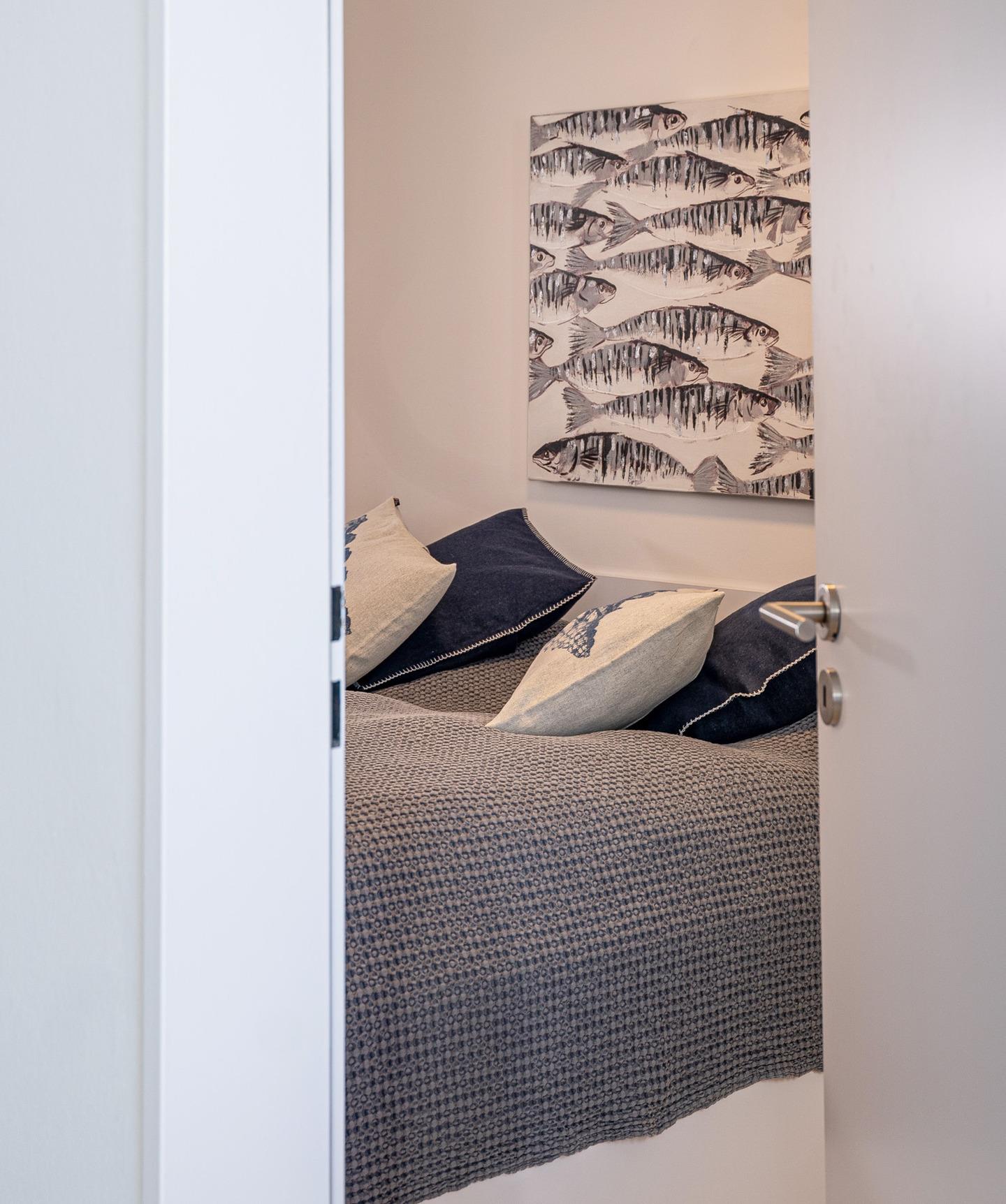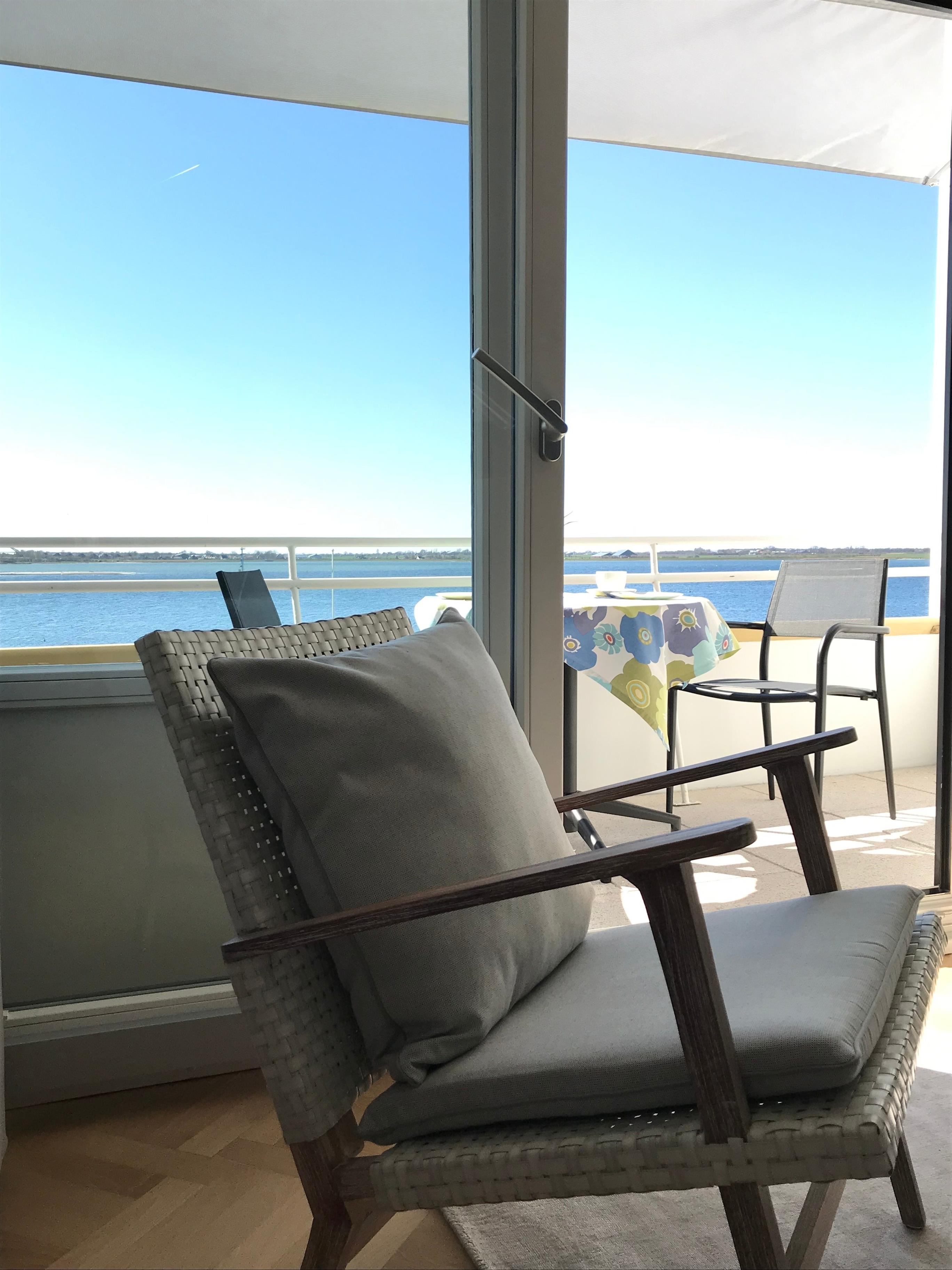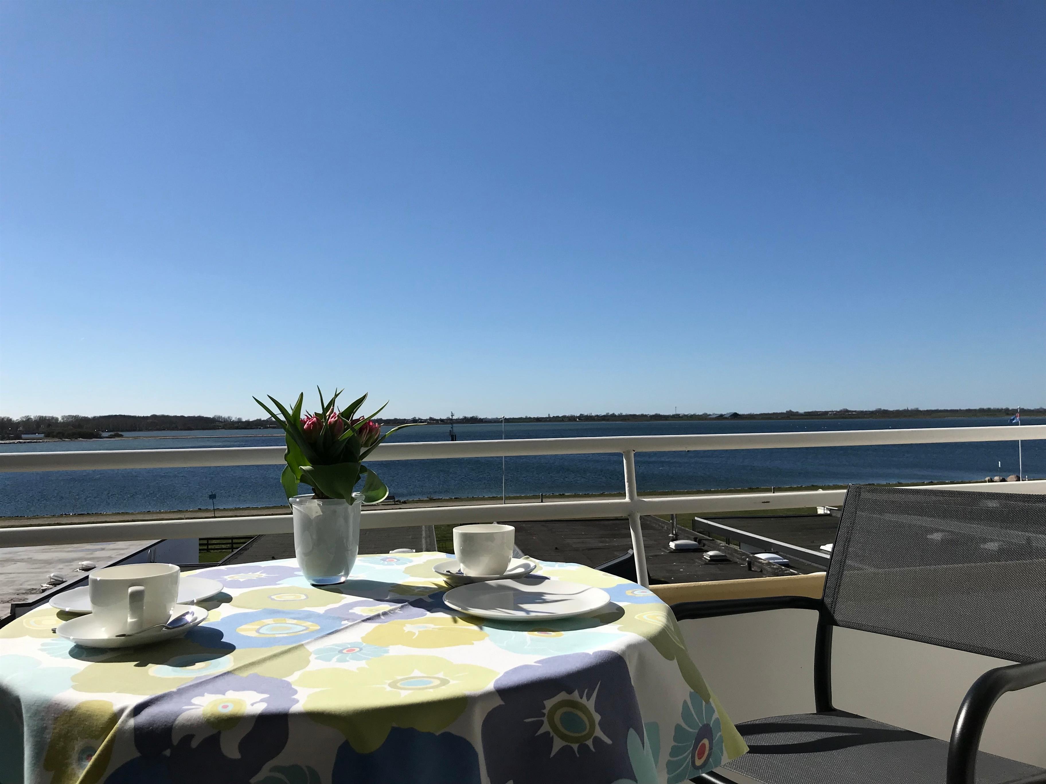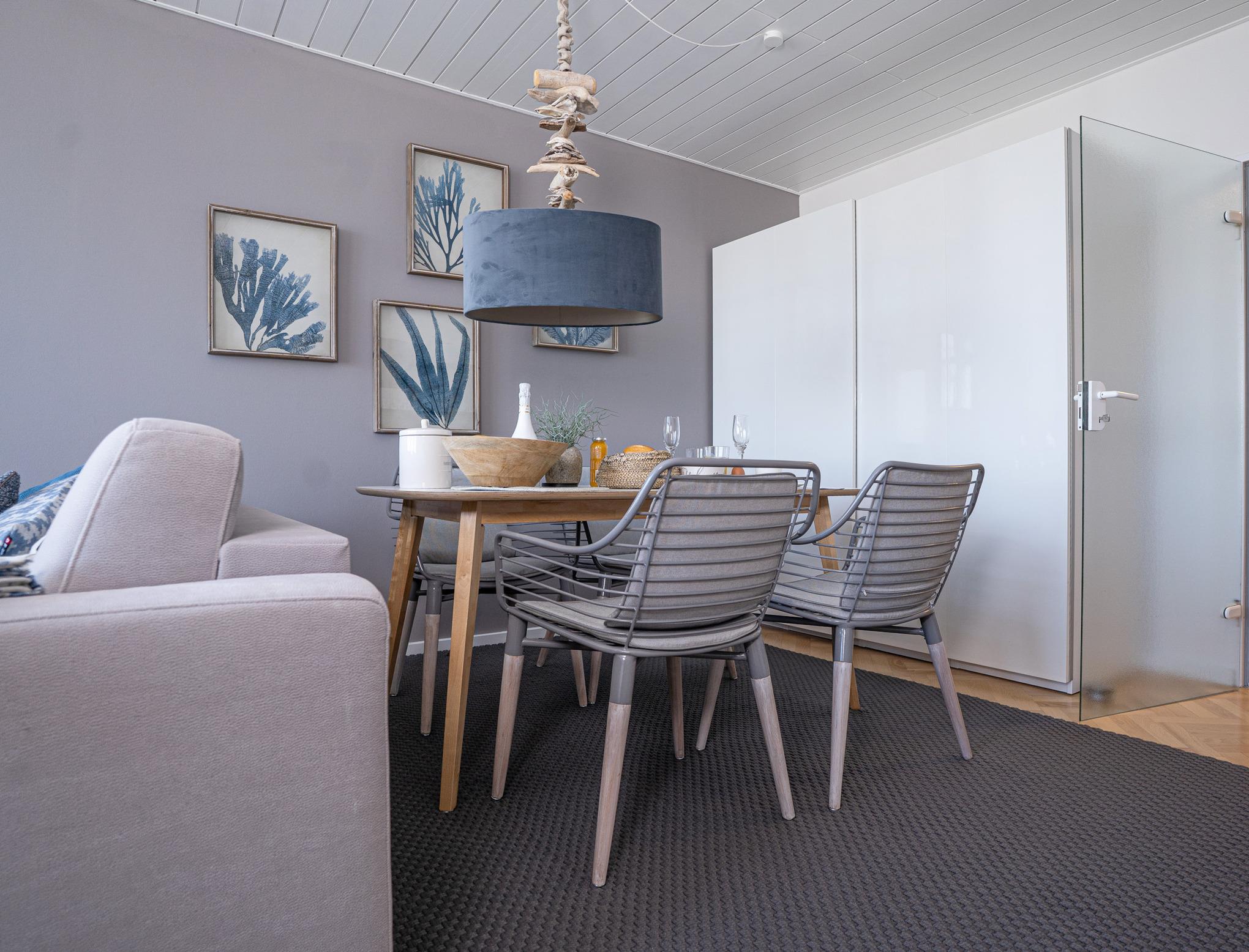 Im Wohn- und Essbereich befindet sich der Esstisch, von dem aus Sie schon beim Essen das Treiben auf dem Wasser beobachten können. Hier steht auch ein gemütliches Sofa mit Blick aufs Meer und das TV.