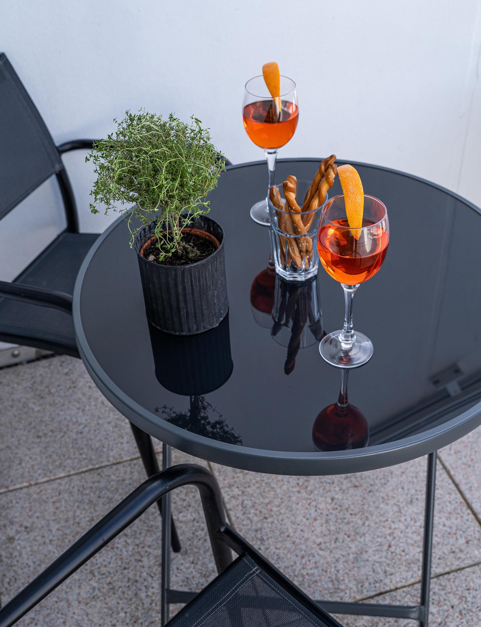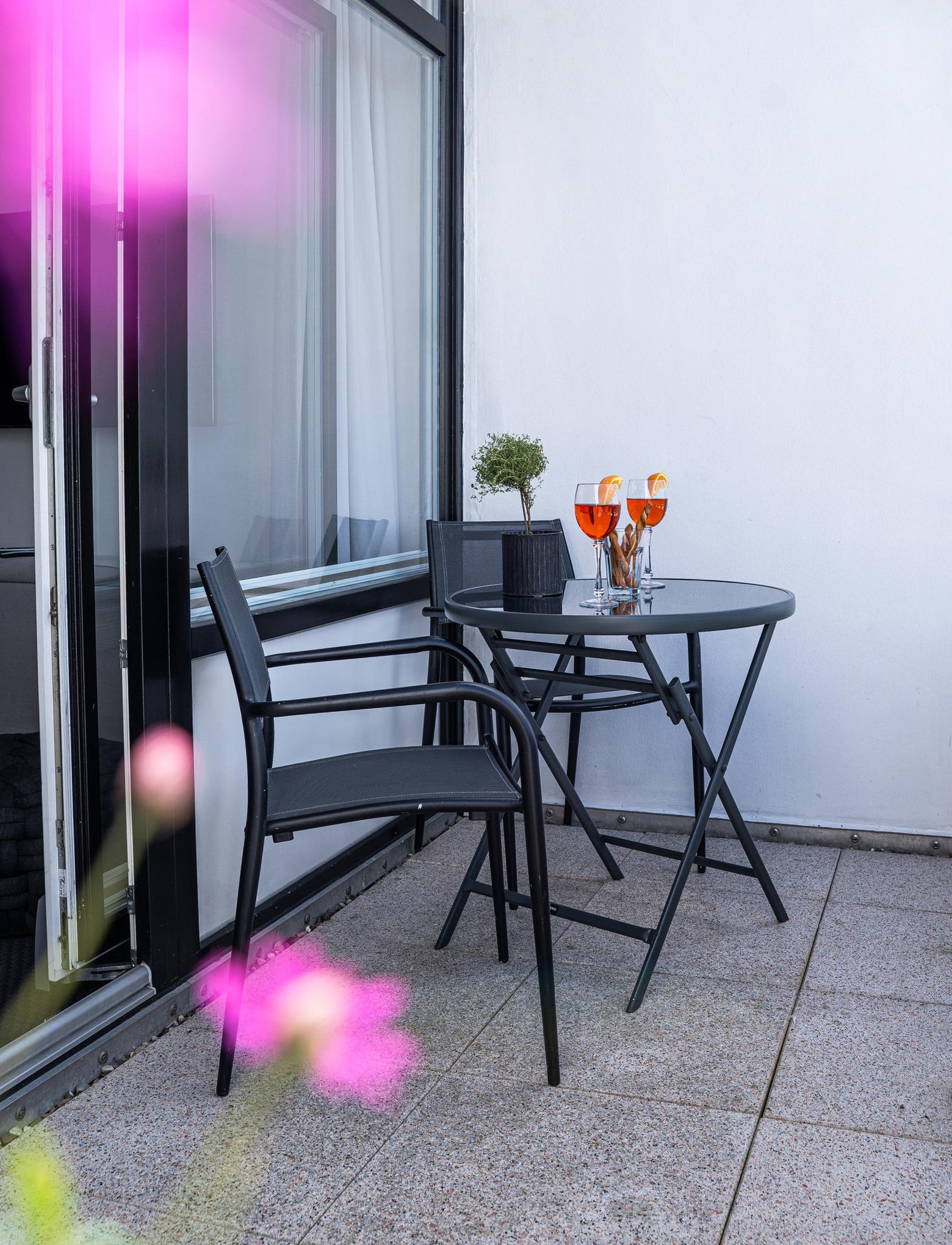 Vom Wohnzimmer aus gelangen Sie auf den Balkon in Südwest-Lage, der mit schönen Gartenmöbeln ausgestattet ist.