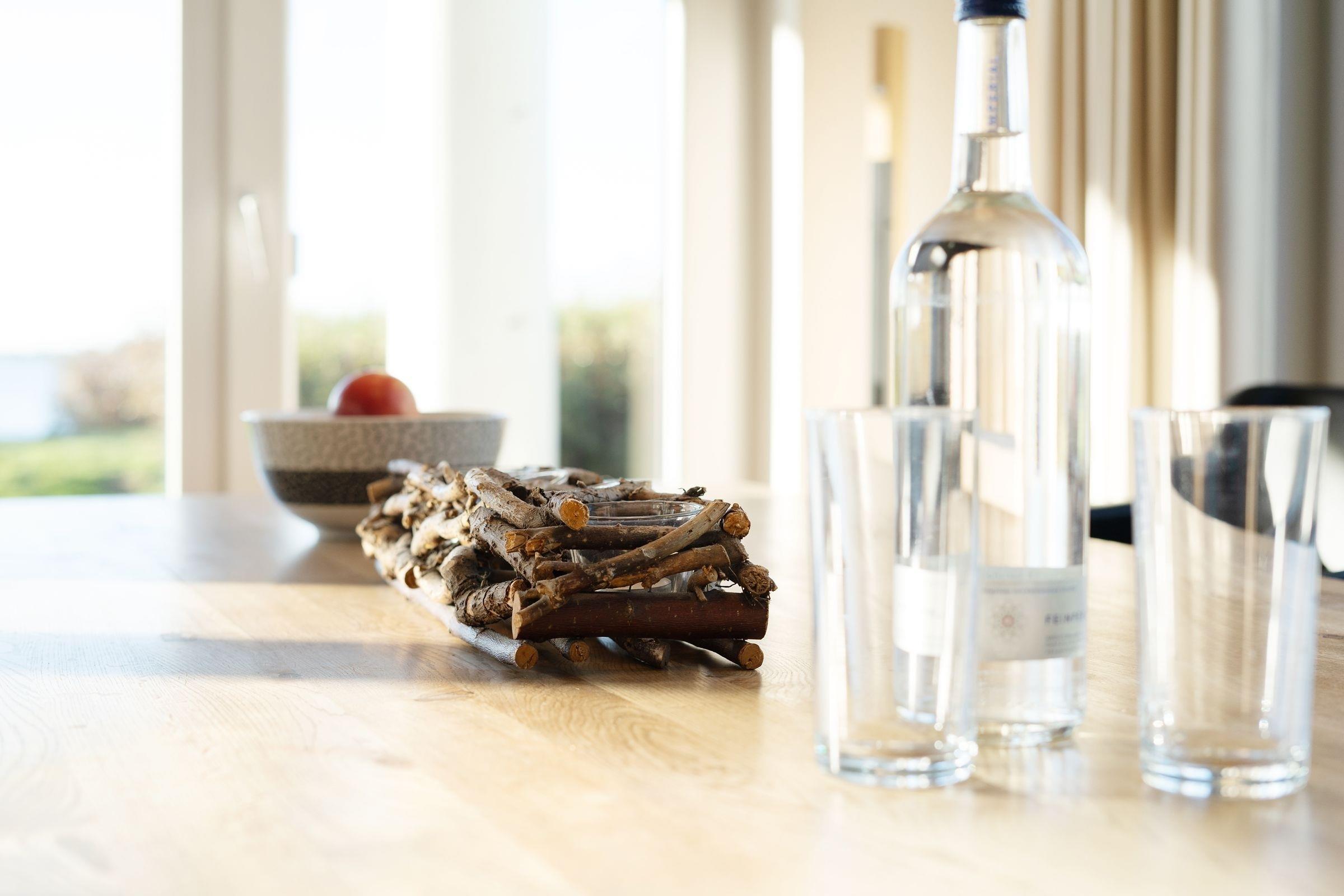Die gehobene Ausstattung des Objekts wird Sie sofort begeistern. Der helle Wohnbereich bietet einen tollen Blick auf die Ostsee. Gemütliche Ledermöbel laden hier zum Verweilen ein. Das Highlight ist sicher die große teilweise überdachte Terrasse. Auch von hier haben Sie einen tollen Blick auf die Ostsee und das Wahrzeichen der Insel Fehmarn: die Fehmarnsundbrücke. Hier können Sie perfekt bei einem guten Frühstück in den Tag starten, die Mittagsstunden auf der Sonnenliege verbringen oder abends den Sonnenuntergang bewundern. Die zum Wohnbereich hin offene Küche mit angrenzendem Essbereich lässt durch ihre sehr gute Ausstattung beim Kochen keine Wünsche offen. Die beiden modern eingerichteten Schlafzimmer, eins mit einem Doppelbett und TV-Gerät, das andere mit zwei Einzelbetten, bieten den entsprechenden Wohlfühlfaktor zum Erholen nach ereignisreichen Urlaubstagen. Das großzügige Bad ist mit einer bodengleichen Dusche ausgestattet. Ein großes Fenster sorgt für Tageslicht und damit einen sonnigen Start in den Tag. Eine kleine Sauna steht Ihnen ebenfalls in der Unterkunft zur Verfügung. Die Wohnung ist mit Fußbodenheizung ausgestattet und komplett gefliest.