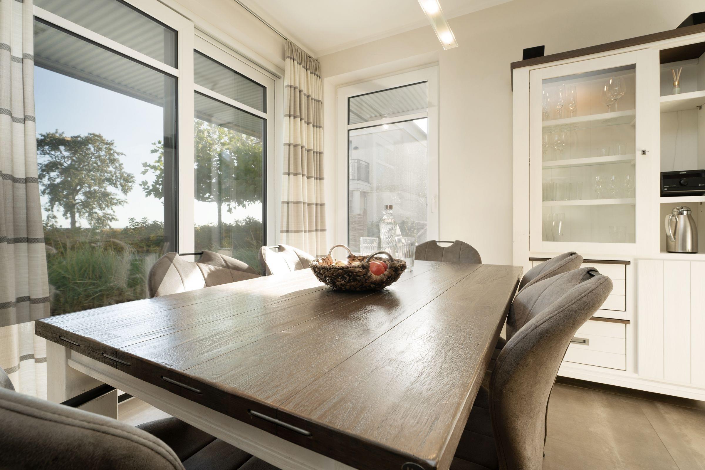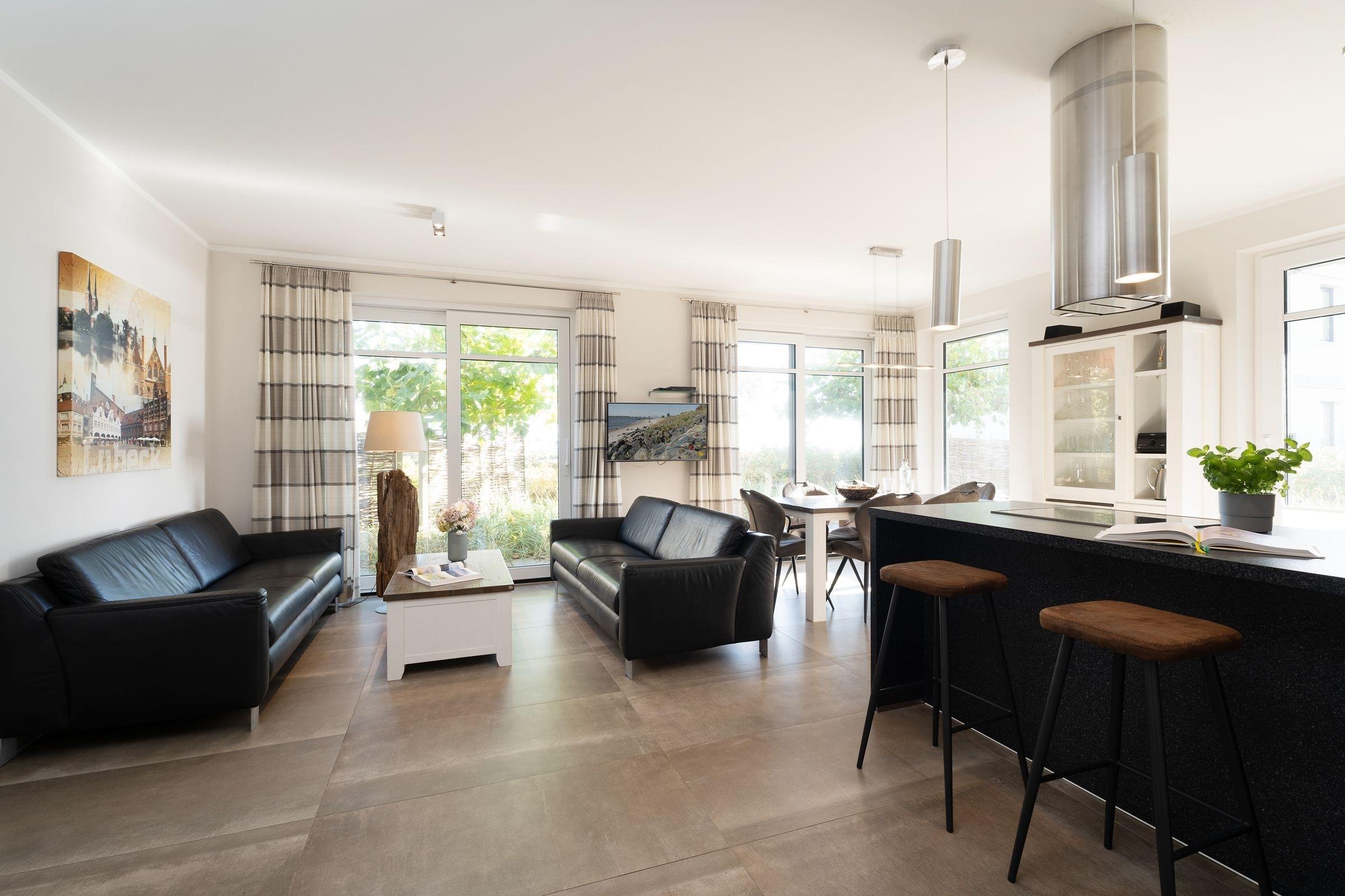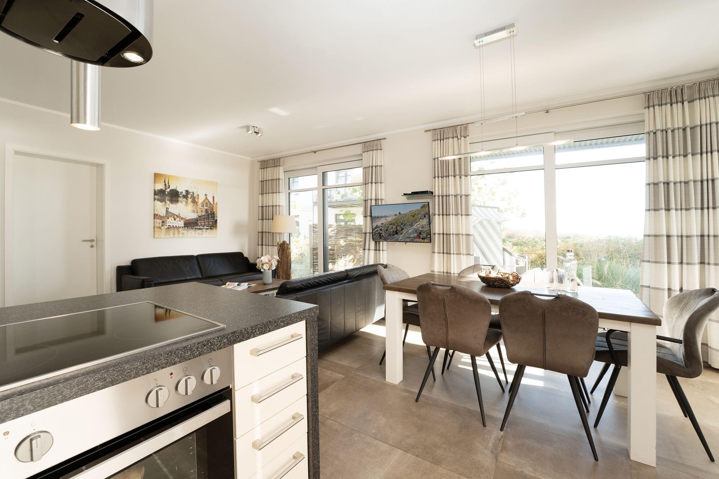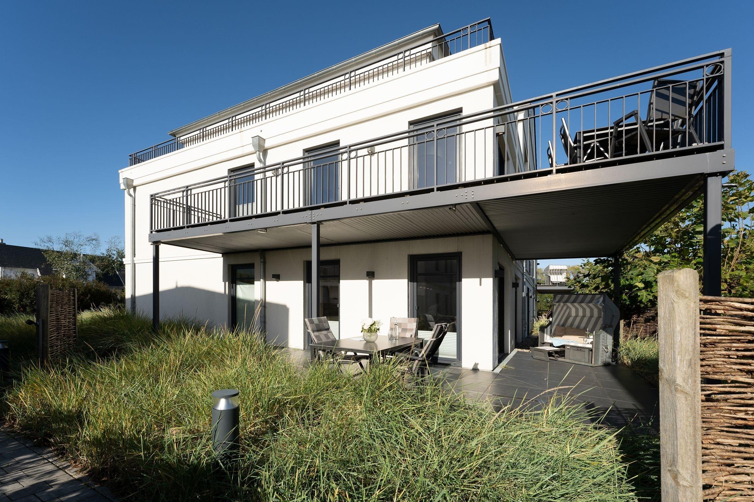 Bodentiefe Fenster mit Blick auf die Ostsee sowie ein heller, moderner Wohnbereich mit einer gut ausgestattete Küche mit angrenzendem Esstisch laden Sie zum Erholen ein. Für die Nacht stehen Ihnen drei Schlafzimmer zur Verfügung, davon zwei mit jeweils einem bequemen Doppelbett und eins mit einem Etagenbetten. In jedem der Schlafräume befindet sich ein eigenes TV-Gerät. Die zwei hochwertig ausgestatteten Duschbäder, eins davon verfügt über ein Fenster, haben jeweils eine bodengleiche Dusche. Die Wohnung ist komplett gefliest und mit einer Fußbodenheizung ausgestattet. Der Garten mit teilüberdachter Terrasse mit Strandkorb und Panorama-Meerblick lädt zum Entspannen und Verweilen ein. Genießen Sie gemütliche Abende nach einem tollen Tag am Strand oder einem erlebnisreichen Ausflug entlang der reizvollen Ostseeküste.