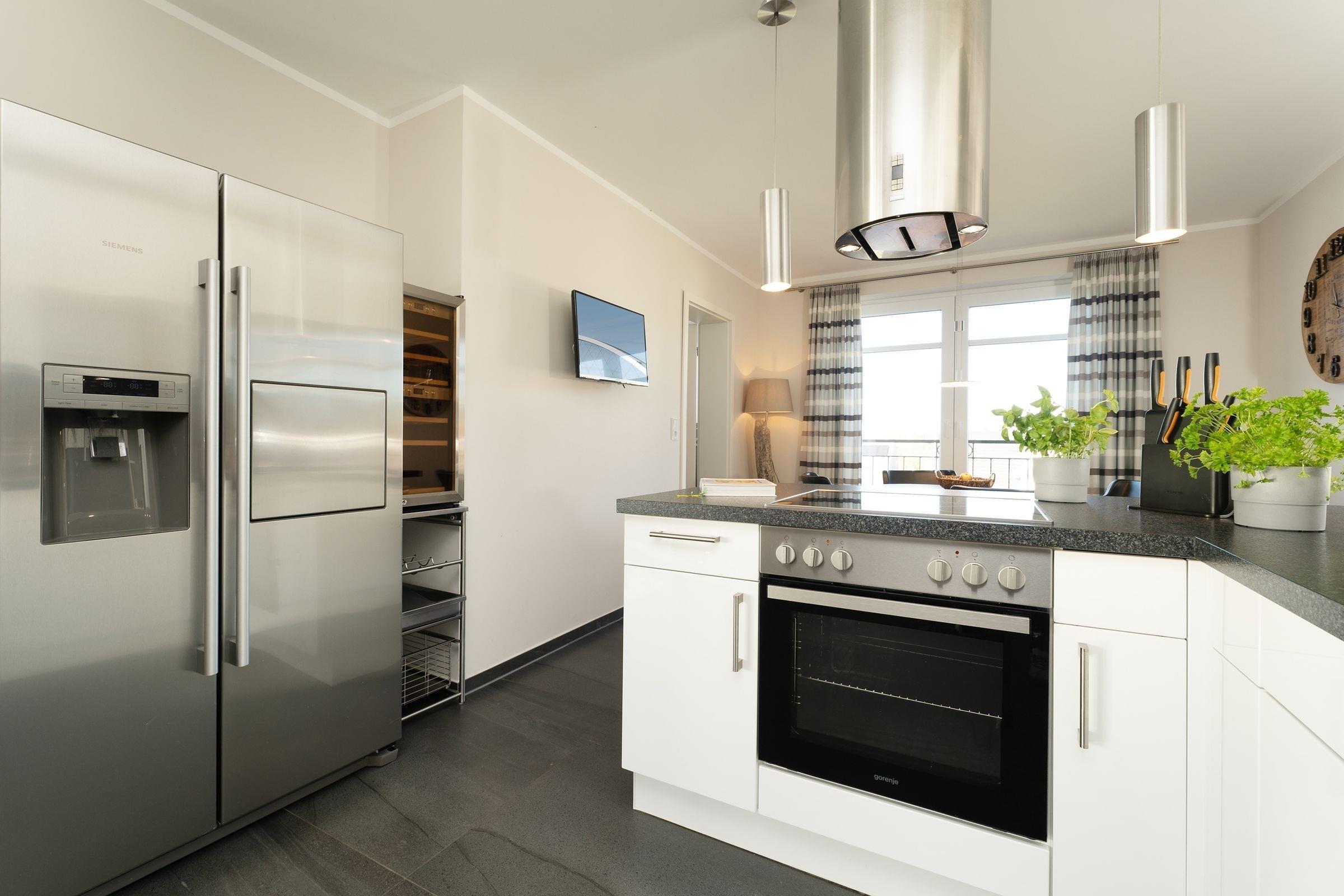 Nur rund 30 Meter vom Strand entfernt befindet sich diese traumhafte Wohnung. Lichtdurchflutete Fenster mit Blick auf die Ostsee und eine moderne, offene und sehr gut ausgestattete Küche mit angrenzendem Ess- und Wohnbereich laden Sie zum Entspannen ein. Für die Nacht stehen Ihnen zwei Schlafzimmer mit jeweils einem Doppelbetten und einem TV-Gerät zur Verfügung. Das hochwertige tageslichthelle Badezimmer punktet mit einer bodengleichen Dusche. Zusätzlich gibt es ein Gäste-WC. Die Wohnung ist komplett gefliest und mit einer Fußbodenheizung ausgestattet. Das Highlight der Wohnung ist sicher die ca. 35 m² große Dachterrasse mit Panorama-Meerblick und eigenem Strandkorb. Von hier können Sie sowohl den Sonnenaufgang als auch den Sonnenuntergang beobachten. Sonne pur - den ganzen Tag!