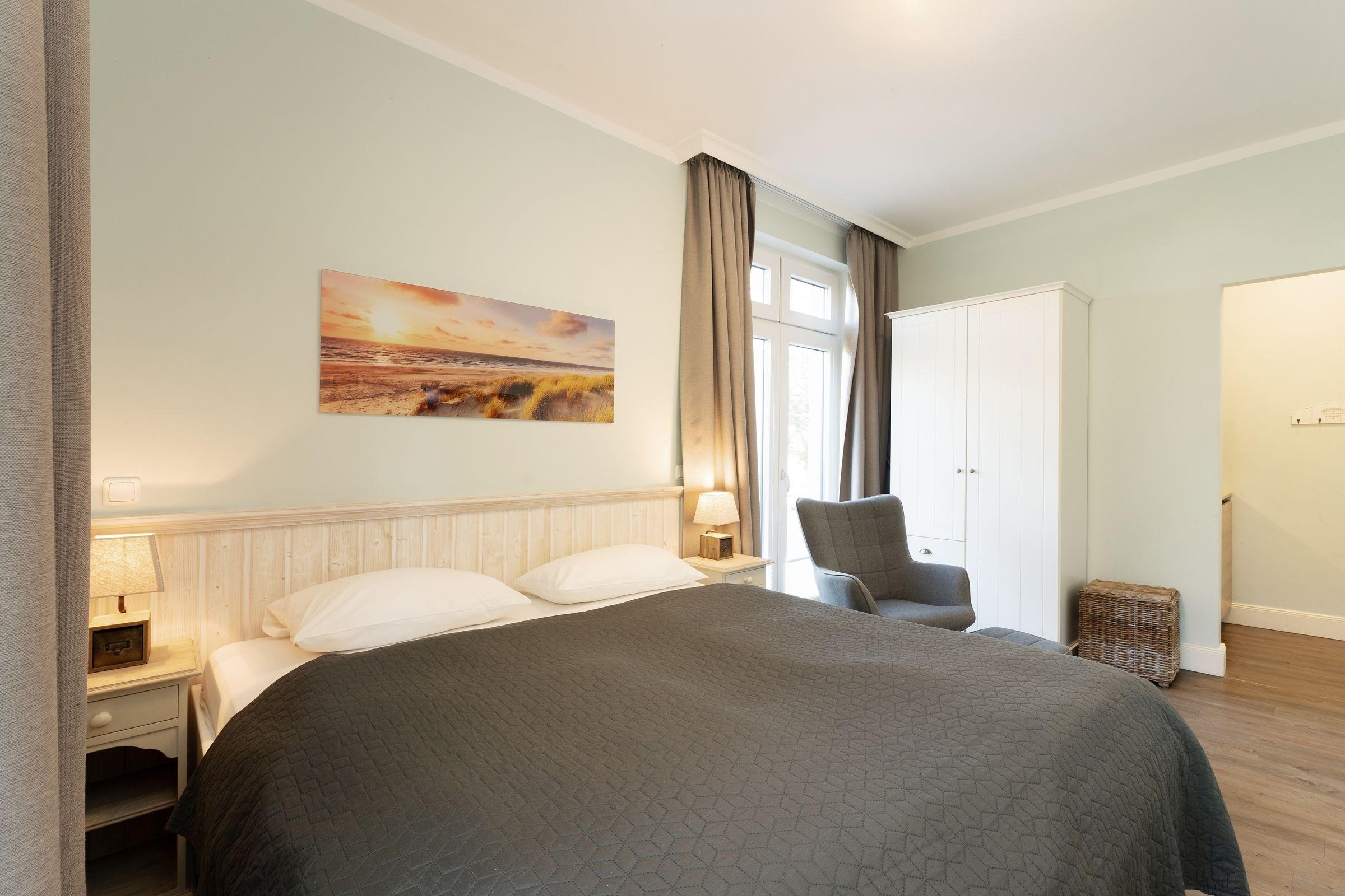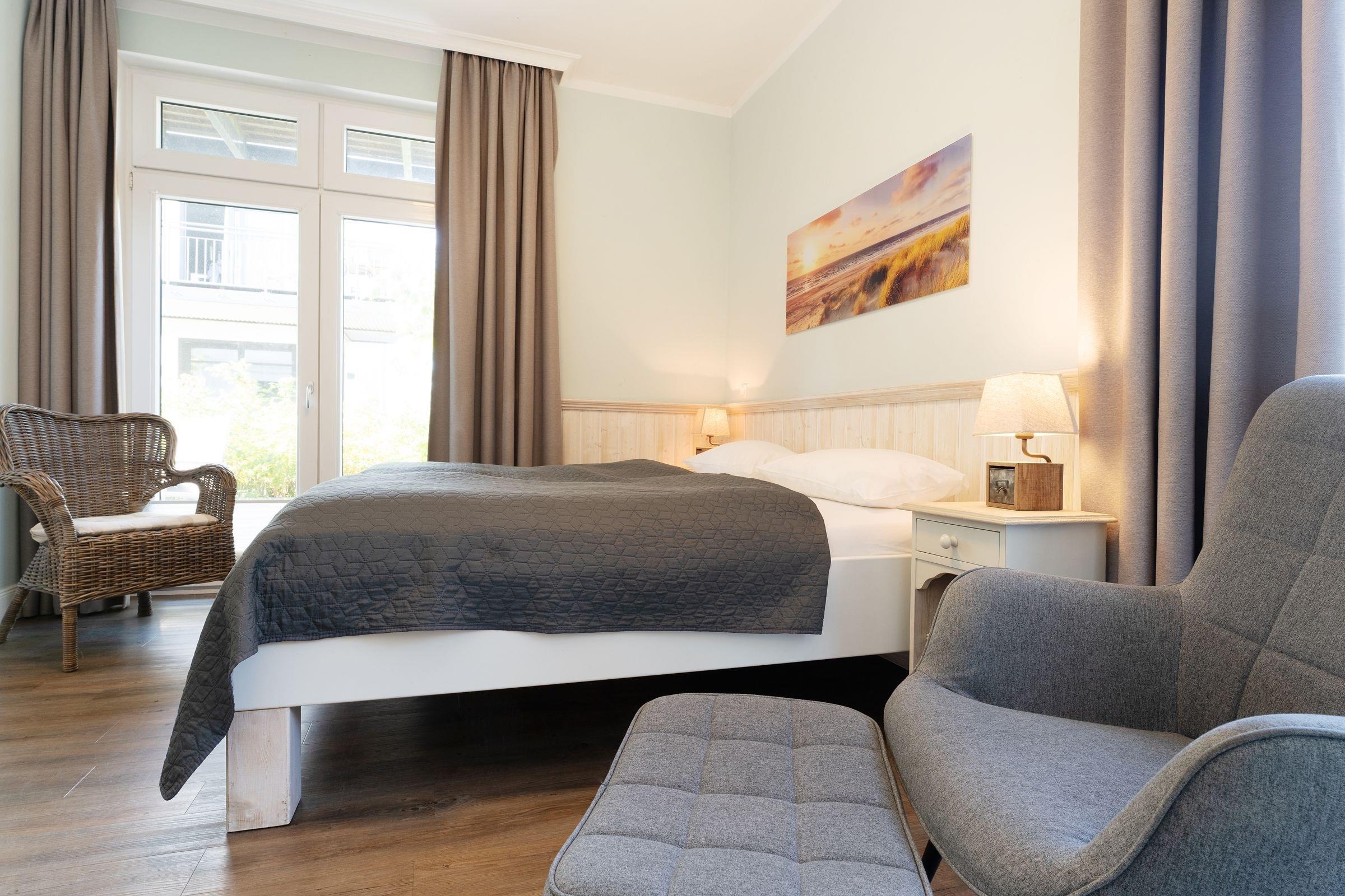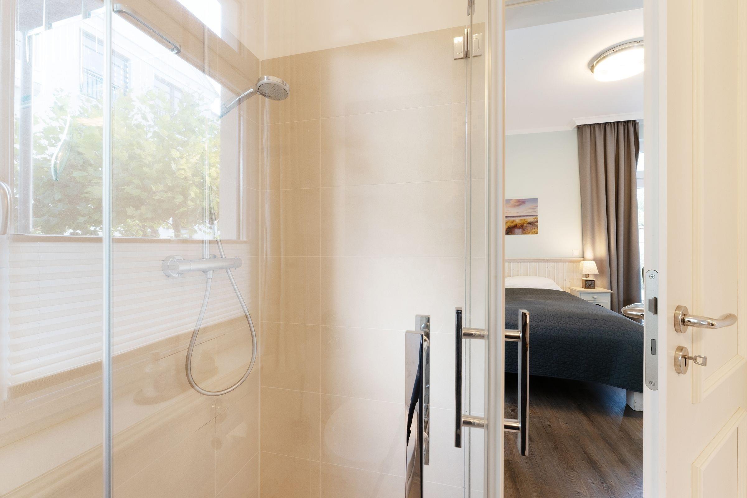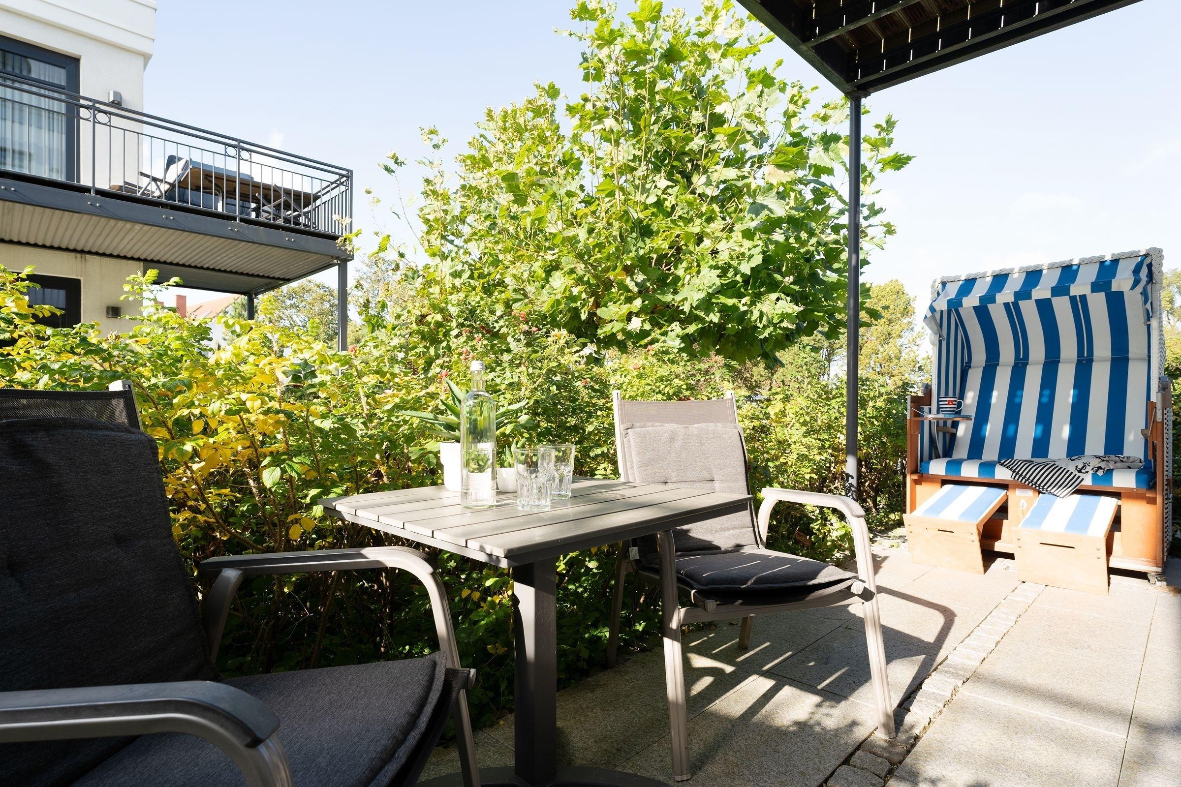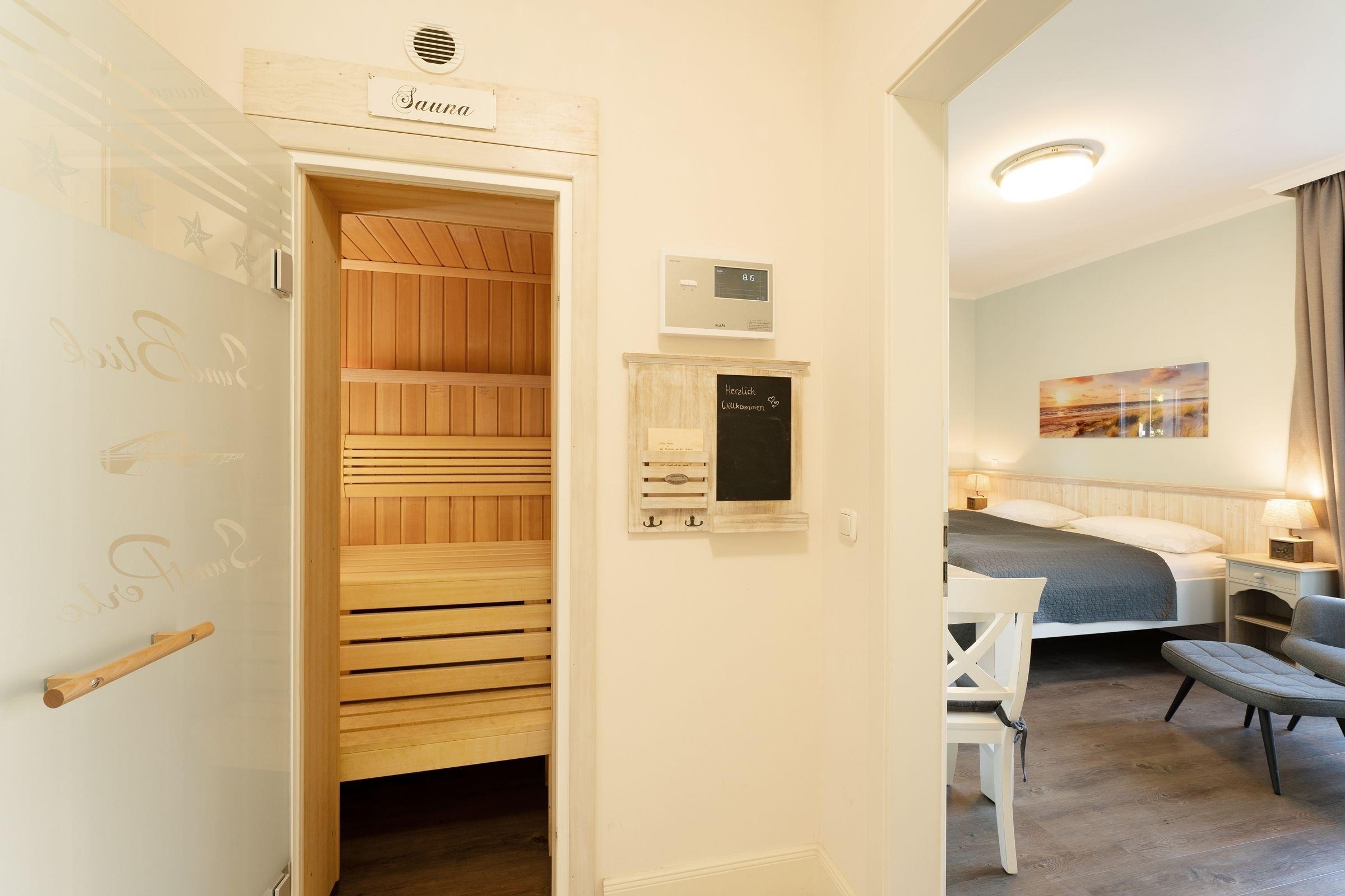 Das modern und hochwertig ausgestattete Appartement ist nach Westen ausgerichtet. Es verfügt über alles, was Sie für einen erholsamen Urlaub an der Ostsee benötigen. Es hat ein großzügiges Wohn-Schlafzimmer mit Doppelbett, 2 Sesseln und einem Esstisch. Für das Zubereiten Ihrer Speisen ist eine separate Kochnische vorhanden. Das komfortable Badezimmer hat eine bodentiefe Dusche sowie Tageslicht. Von der möblierten Terrasse mit einem schönen Ostseestrandkorb haben Sie nach Süden einen kleinen Meerblick. Als besonderes Highlight steht Ihnen eine moderne Premium-Einbausauna zu Verfügung. Diese ist im Vorflurbereich der Appartements I und IA untergebracht - daher ist eine Absprache mit den Mietern des App. IA notwendig, um zeitliche Überschneidungen zu verhindern.