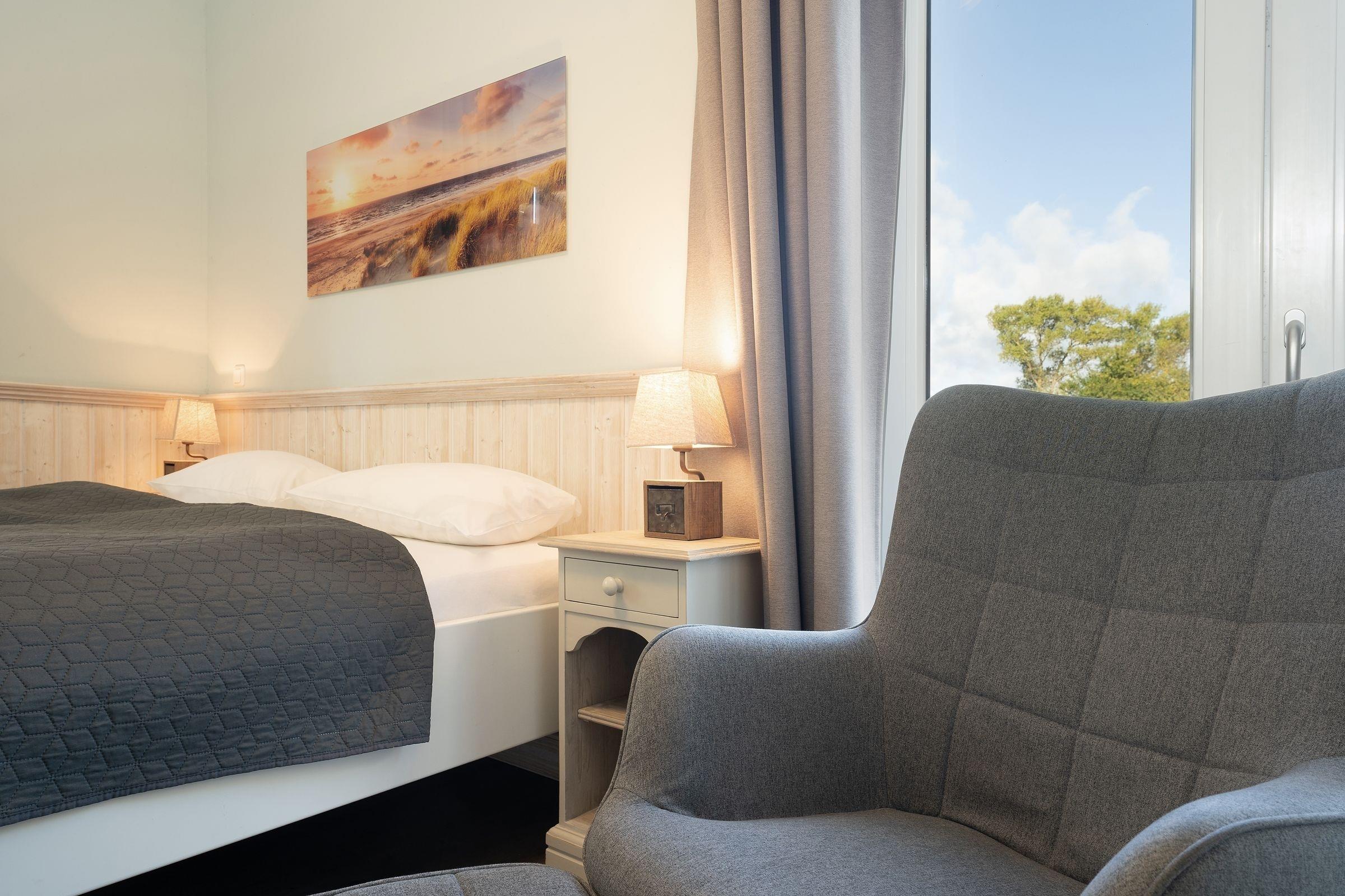 Wohnzimmer: 1 Doppelbett, Kleiderschrank, TV, Verdunkelung: Gardinen, Platz für Babybett vorhanden