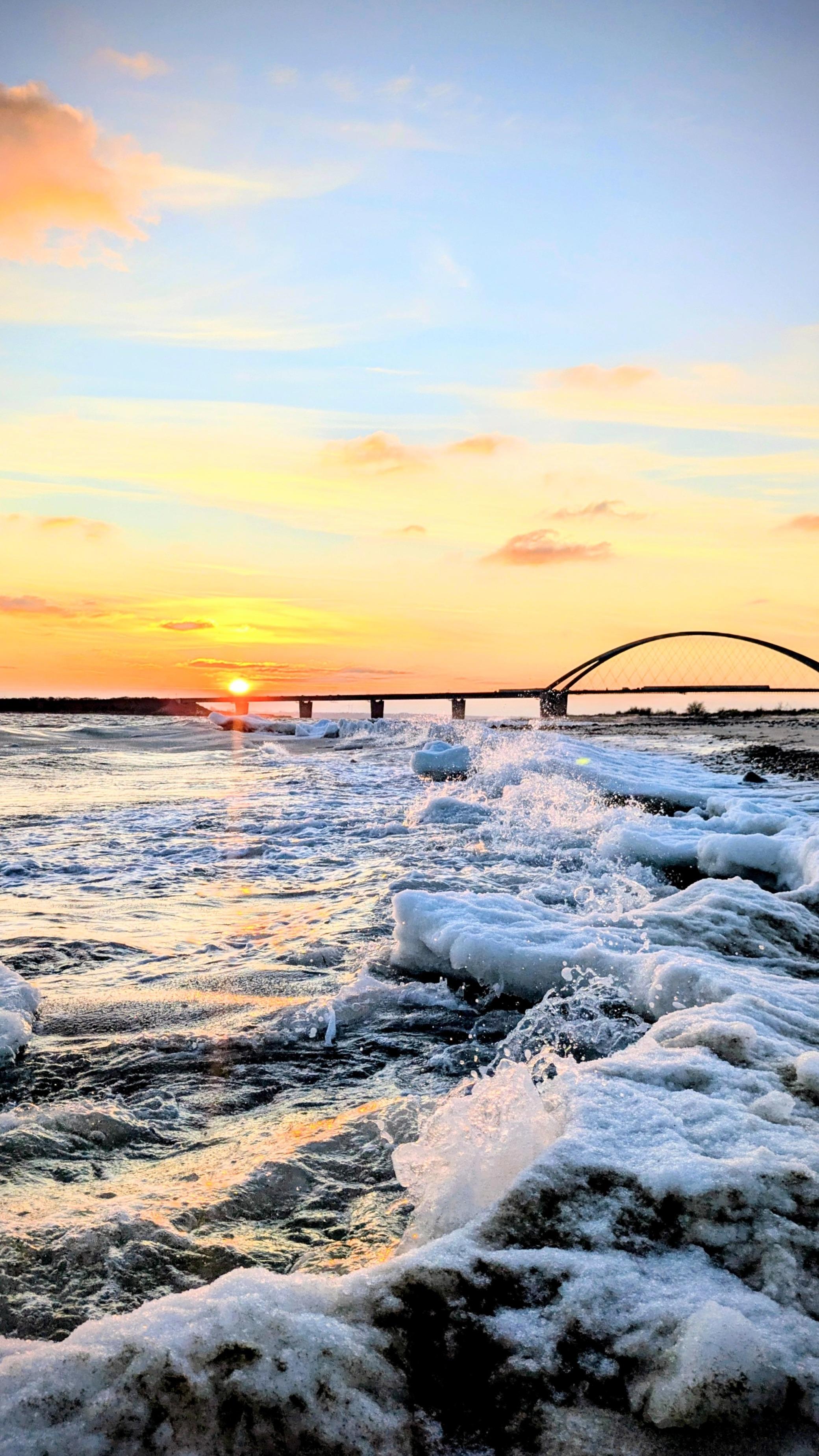 Fehmarn ist auch im Winter so schön, Eisschollen am Strand, tolle Sonnenuntergänge an der Fehmarn-Sundbrücke und schöne Spaziergänge rund um die Insel.