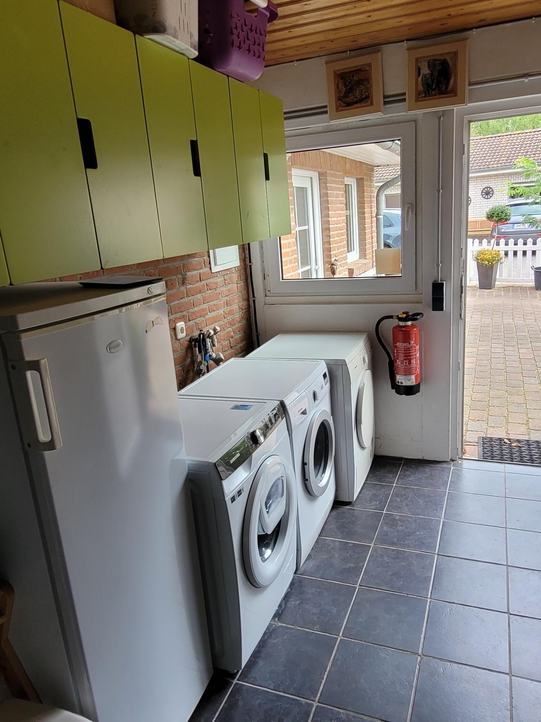 Im frei zugänglichen Wirtschaftsraum können Waschmaschine und Trockner kostenfrei mitbenutzt werden. Angelbeute findet auf Anfrage Platz im separaten Tiefkühler (und der hauseigenen Pfanne der Vermieter... ??).