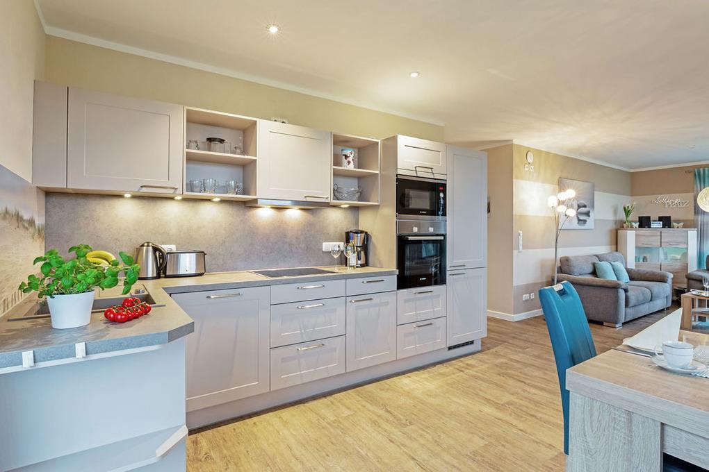 • 1 lichtdurchfluteter Wohnraum mit offener Küche (Geschirrspüler, Mikrowelle, Backofen und jeglichen Gerätschaften) und Kamin EG