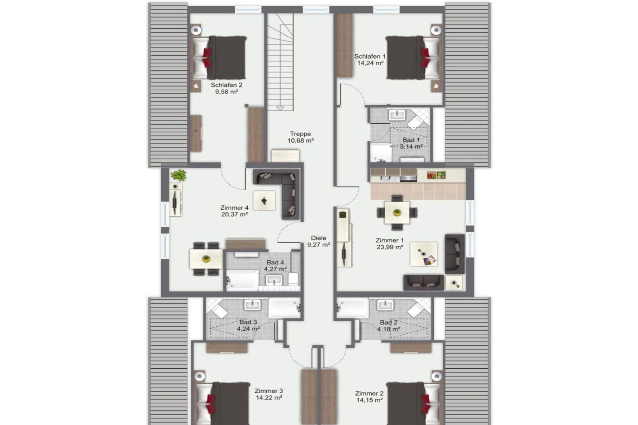 Parterre: (Wohnzimmer(TV(smart TV), DVD-Spieler), Küche(Esstisch, Radio, CD-Spieler, Kochplatte(Ceranfeld), Wasserkocher, Toaster, Dunstabzugshaube, Kaffeemaschine, Backofen, Mikrowelle, Spülmaschine, Kühlschrank(+ Gefrierfach), Mixer), Schlafzimmer(Doppelbett(180 x 200 cm)), Schlafzimmer(Doppelbett(180 x 200 cm)), Schlafzimmer(Doppelbett(180 x 200 cm)), Badezimmer(Badewanne, Dusche, Waschbecken, Toilette), Badezimmer(Waschbecken, Toilette), Flur, Gemeinschaftsraum(Kaminofen)) In der 1. Etage: (Wohn/Esszimmer(TV, Esstisch, Kochplatte(Ceranfeld), Wasserkocher, Toaster, Kaffeemaschine, Backofen, Kühlschrank(+ Gefrierfach)), Wohn/Esszimmer(TV, Esstisch, Kochplatte(Ceranfeld), Wasserkocher, Toaster, Kaffeemaschine, Backofen, Kühlschrank(+ Gefrierfach)), Schlafzimmer(Einzelbett(90 x 200 cm), Doppelbett(160 x 200 cm)), Schlafzimmer(Doppelbett(160 x 200 cm), TV), Schlafzimmer(Doppelbett(160 x 200 cm), TV), Schlafzimmer(Doppelbett(180 x 200 cm)), Badezimmer(Dusche, Waschbecken, Toilette, Föhn), Badezimmer(Dusche, Waschbecken, Toilette, Föhn), Badezimmer(Dusche, Waschbecken, Toilette, Föhn), Badezimmer(Dusche, Waschbecken, Toilette, Föhn), Flur) Sauna(alleinige Nutzung), Waschmaschine, Heizung, Terrasse, Garten(alleinige Nutzung, umzäunt), Fahrradabstellraum, Gartenmöbel, Liegen, Grill, Parkplatz, Hochstuhl, Bügelbrett, Bügeleisen, Gesellschaftsspiele, Babybett (kostenlos), Handtücher geben Gebühr, Bettwäsche gegen Gebühr