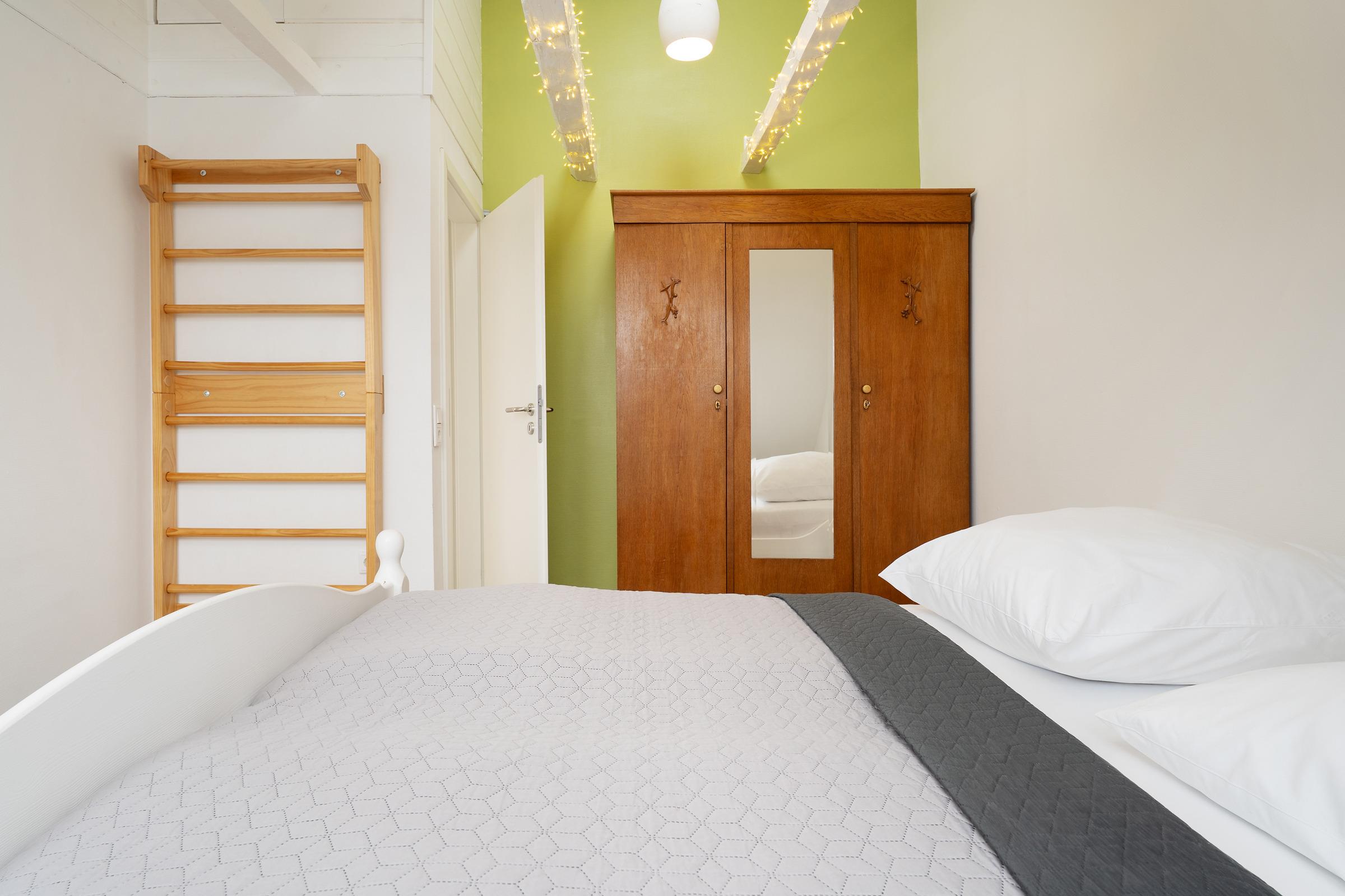 Schlafzimmer 1 (EG): 1 Doppelbett (2x 80x200 cm), Kleiderschrank, Verdunkelung: Plissee, Platz für ein Babybett vorhanden