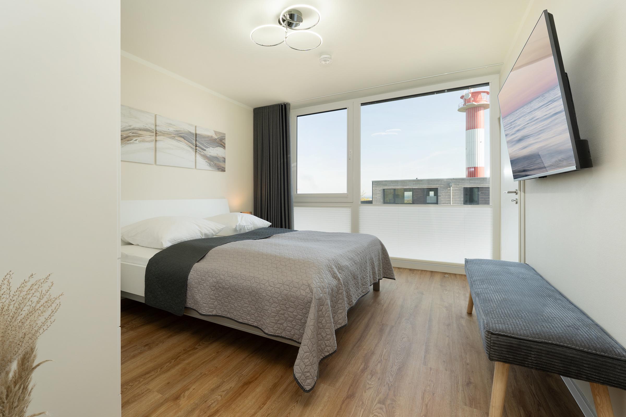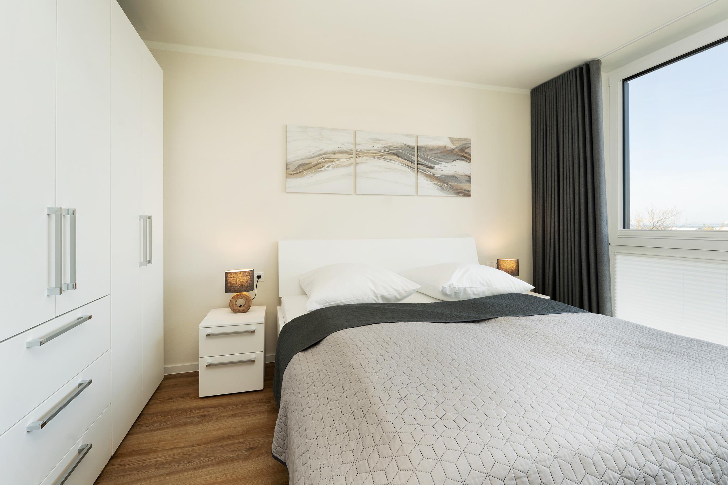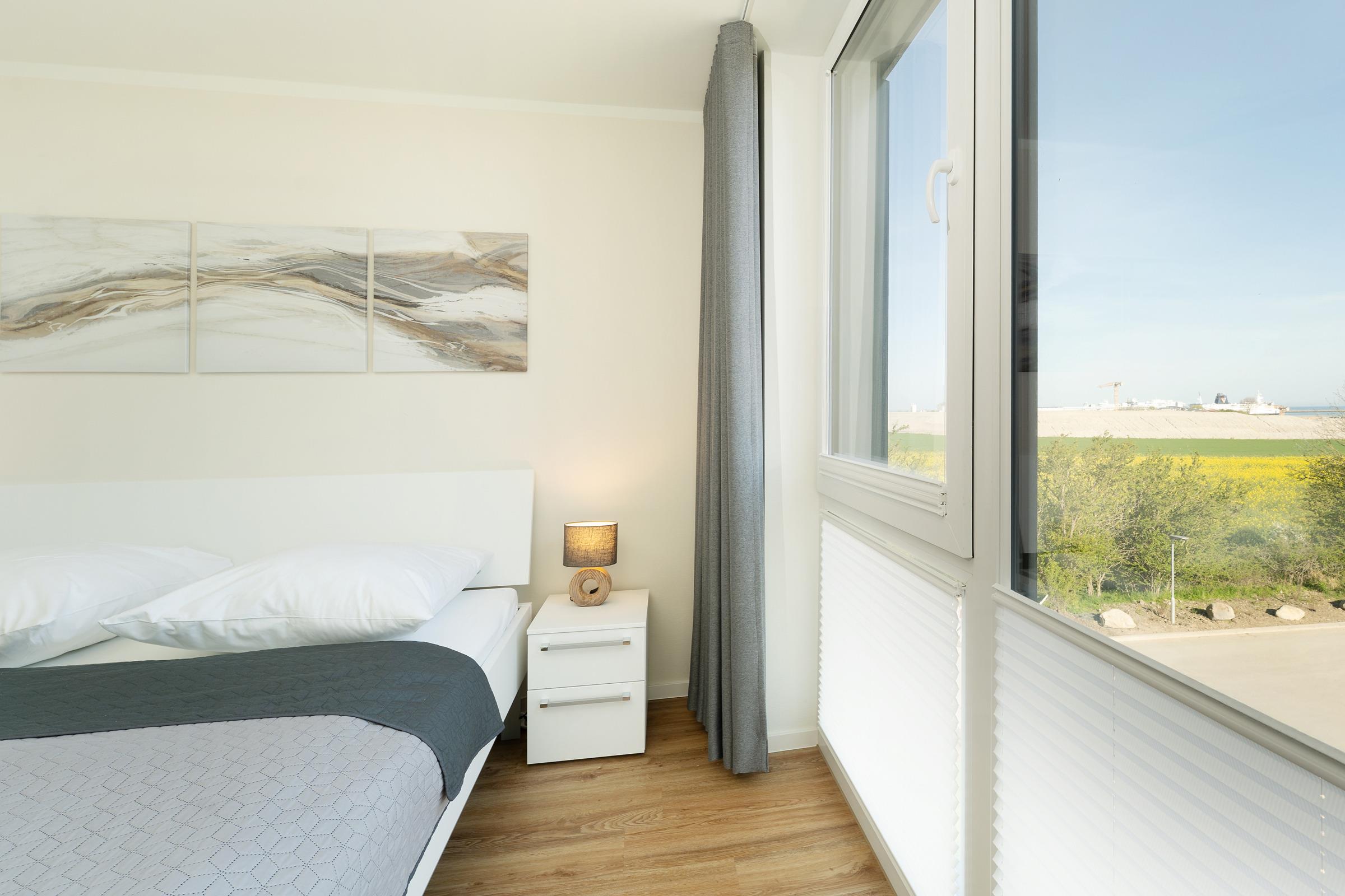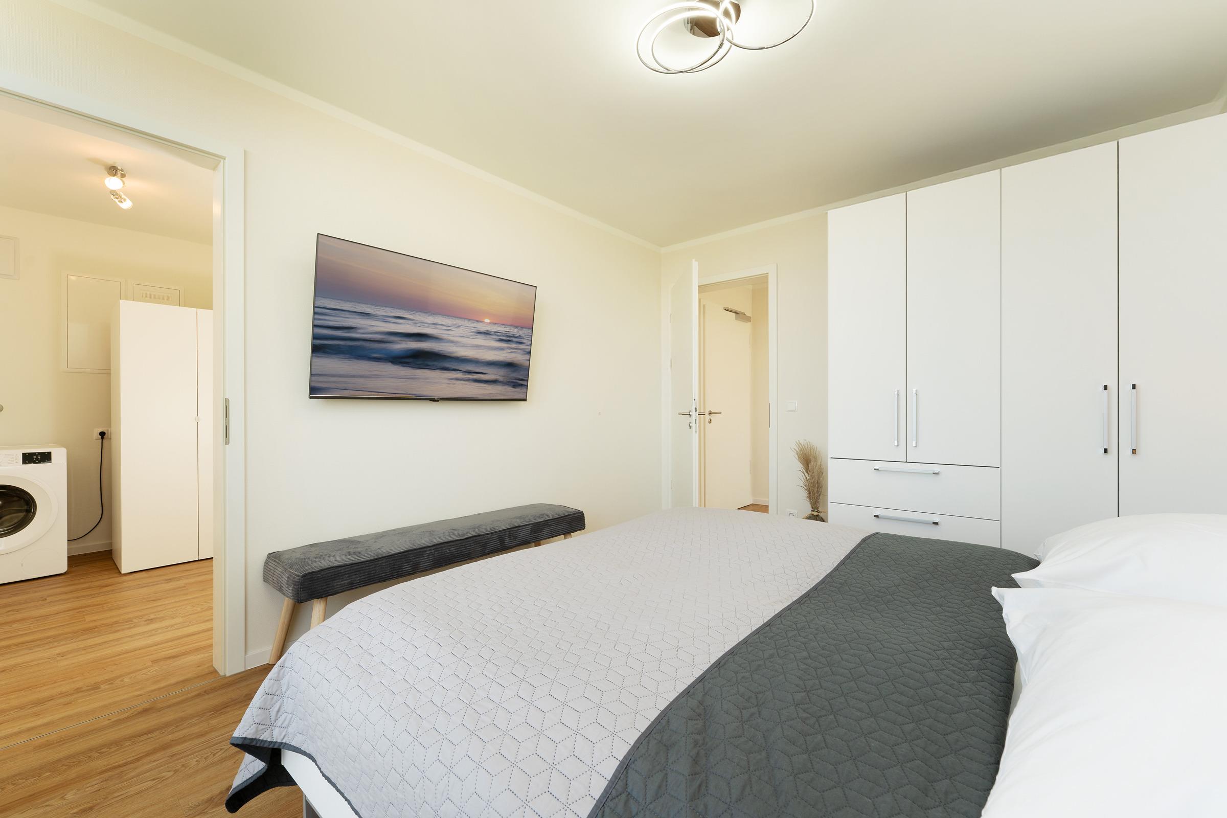Das Schlafzimmer überzeugt mit einem komfortablen Doppelbett und ausreichend Stauraum. Zwei weitere Gäste kommen im Wohnzimmer auf einer gemütlichen Schlafcouch unter.