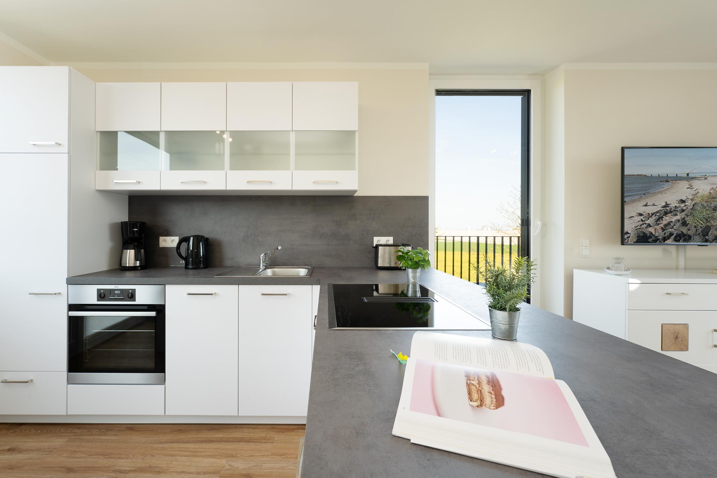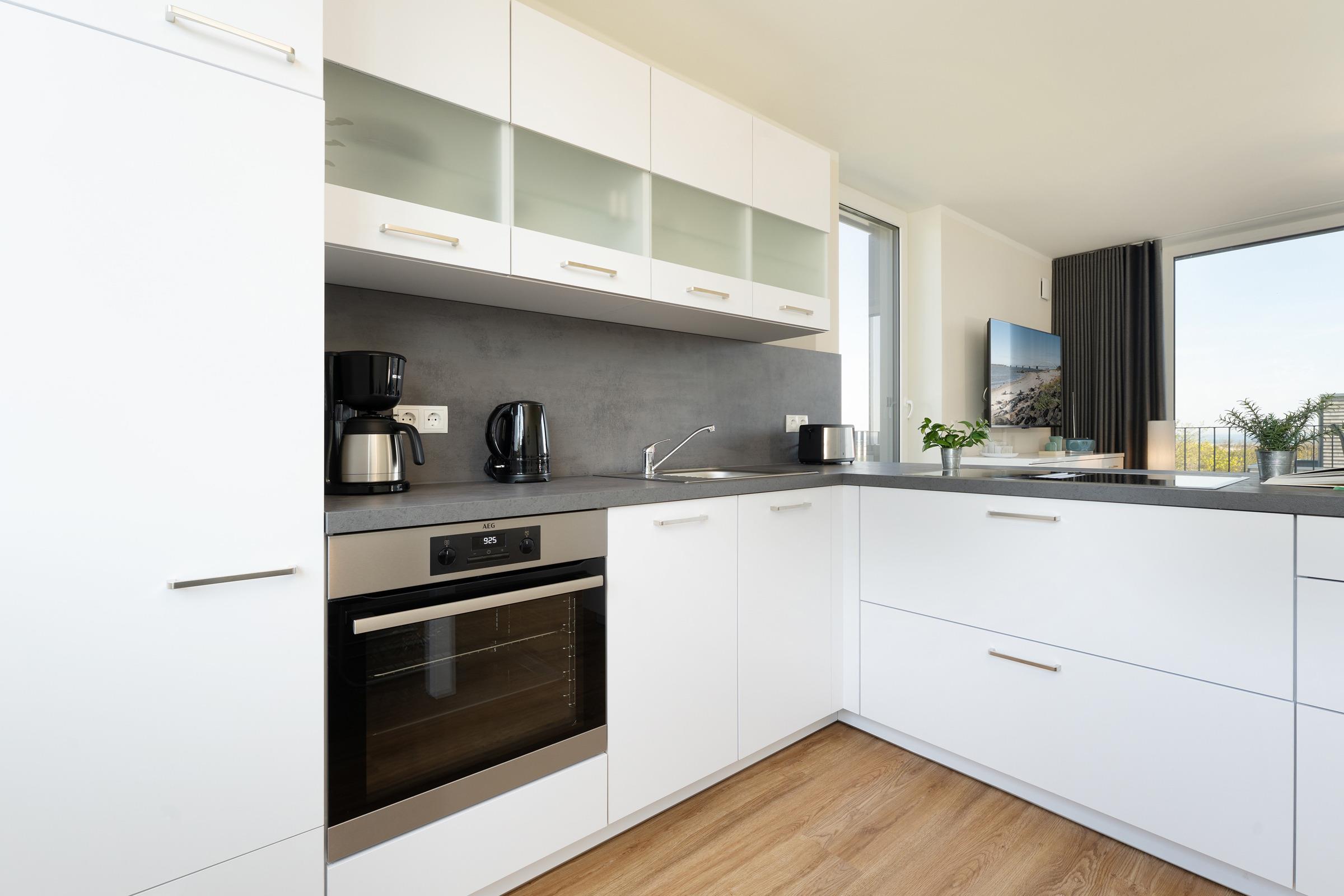 Die offene Küche ist mit allem ausgestattet, was Sie für Ihre Selbstverpflegung benötigen: Cerankochfeld, Backofen, Mikrowelle, Kühlschrank mit Gefrierfach und eine hochwertige Kaffeemaschine. Im Essbereich finden Sie Platz für gesellige Mahlzeiten.