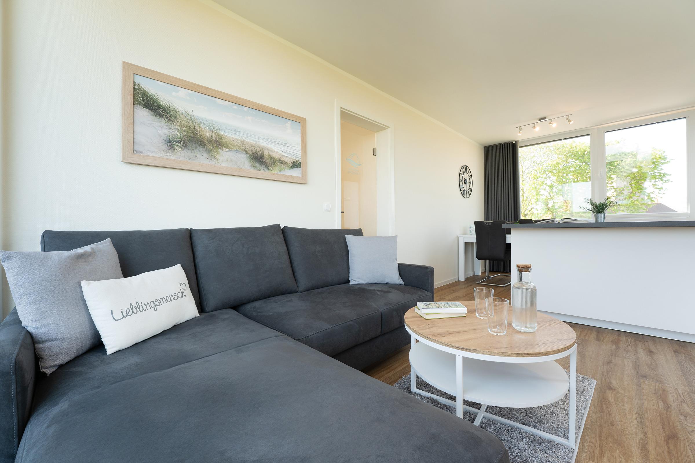 Diese helle und modern ausgestattete Ferienwohnung bietet Ihnen eine perfekte Kombination aus Komfort und Erholung. Im großzügigen Wohnbereich laden ein gemütliches Sofa und ein Flachbild-TV zu entspannten Stunden ein. Die stilvolle Einrichtung schafft eine angenehme Atmosphäre für Ihren Aufenthalt.