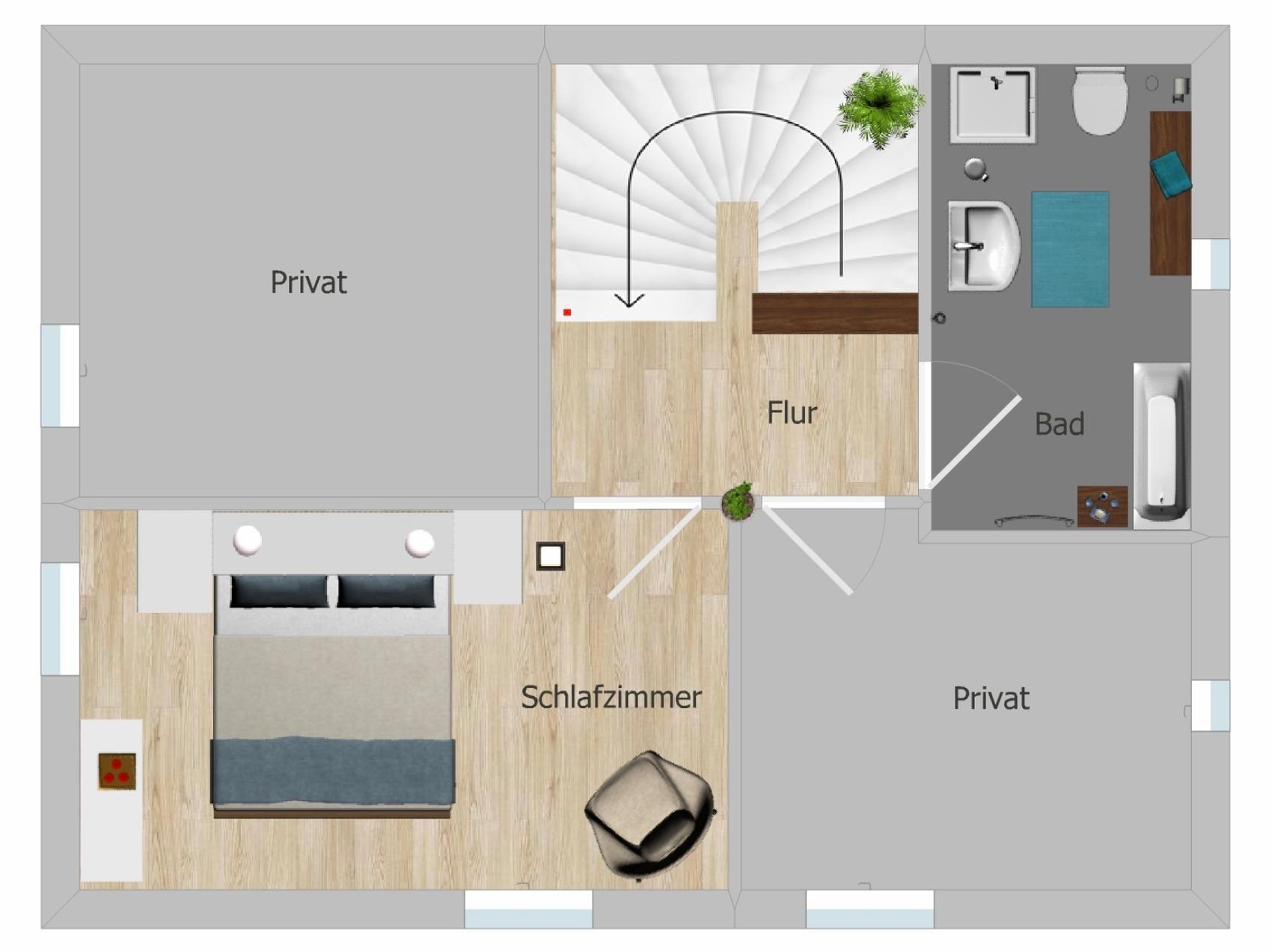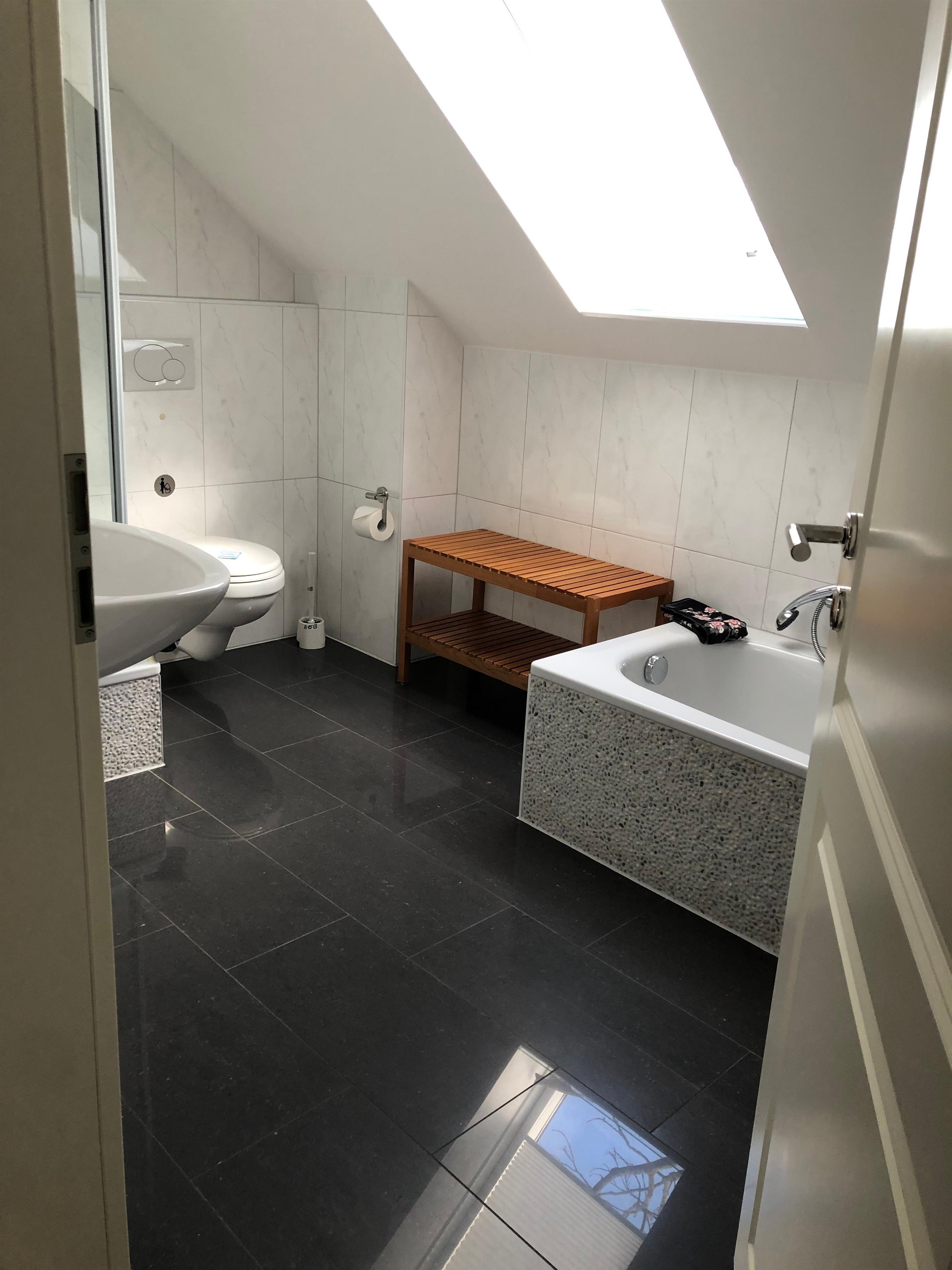 Im OG befindet sich ein Schlafzimmer und ein Bad mit Wanne, Dusche und WC.